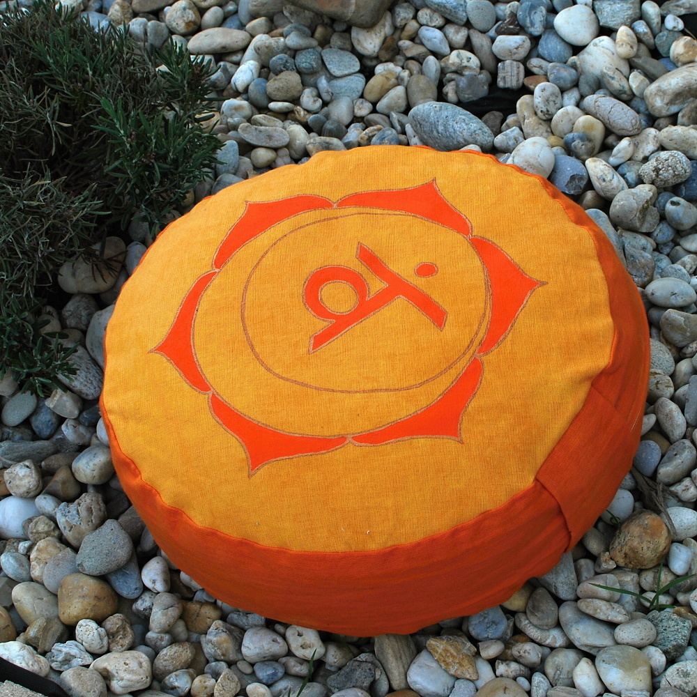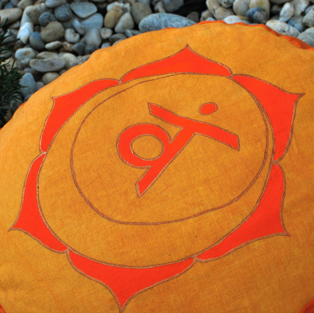 Meditační polštář v oranžovém provedení s malbou a úchytem pro snadnější přenášení!