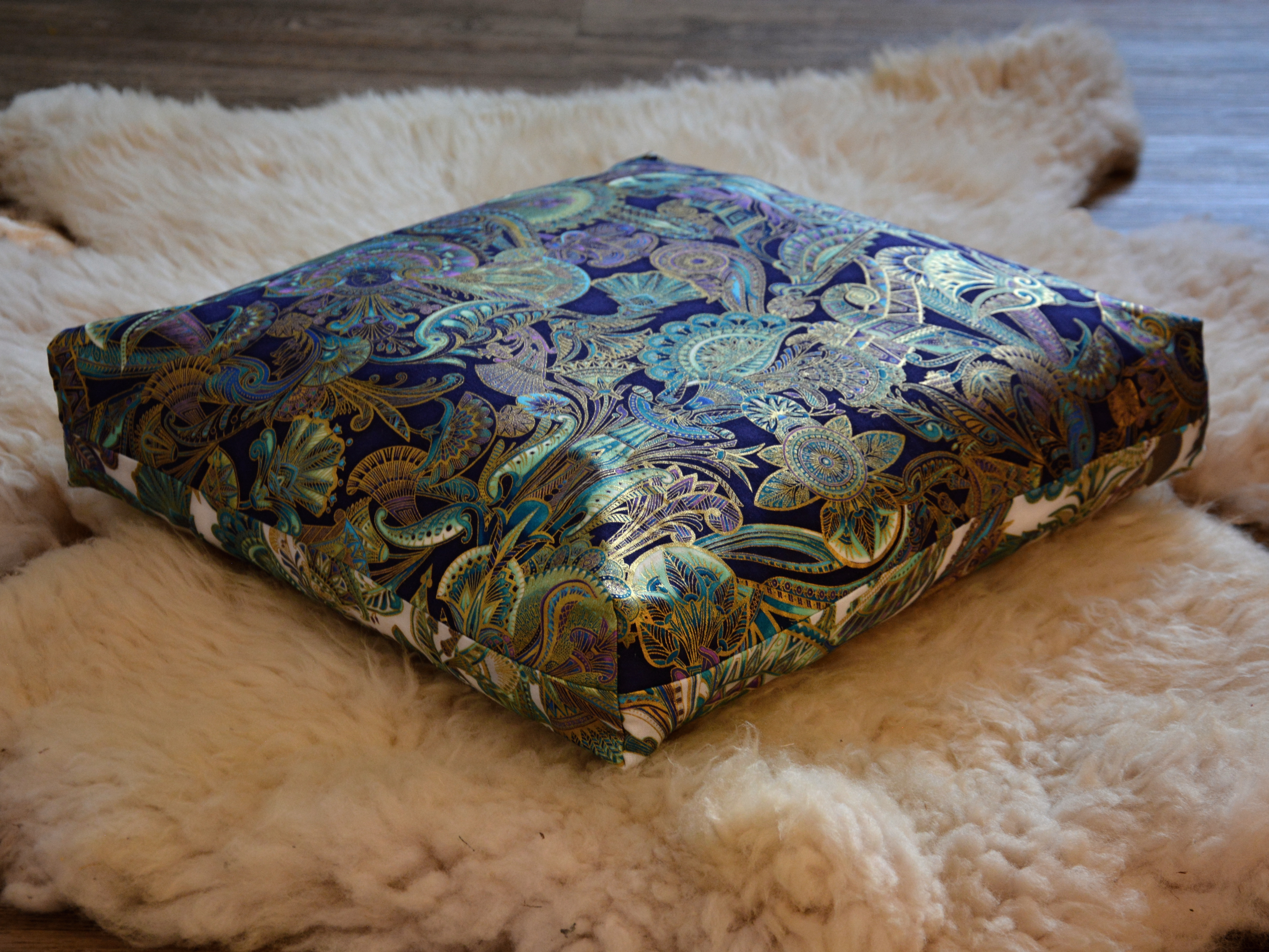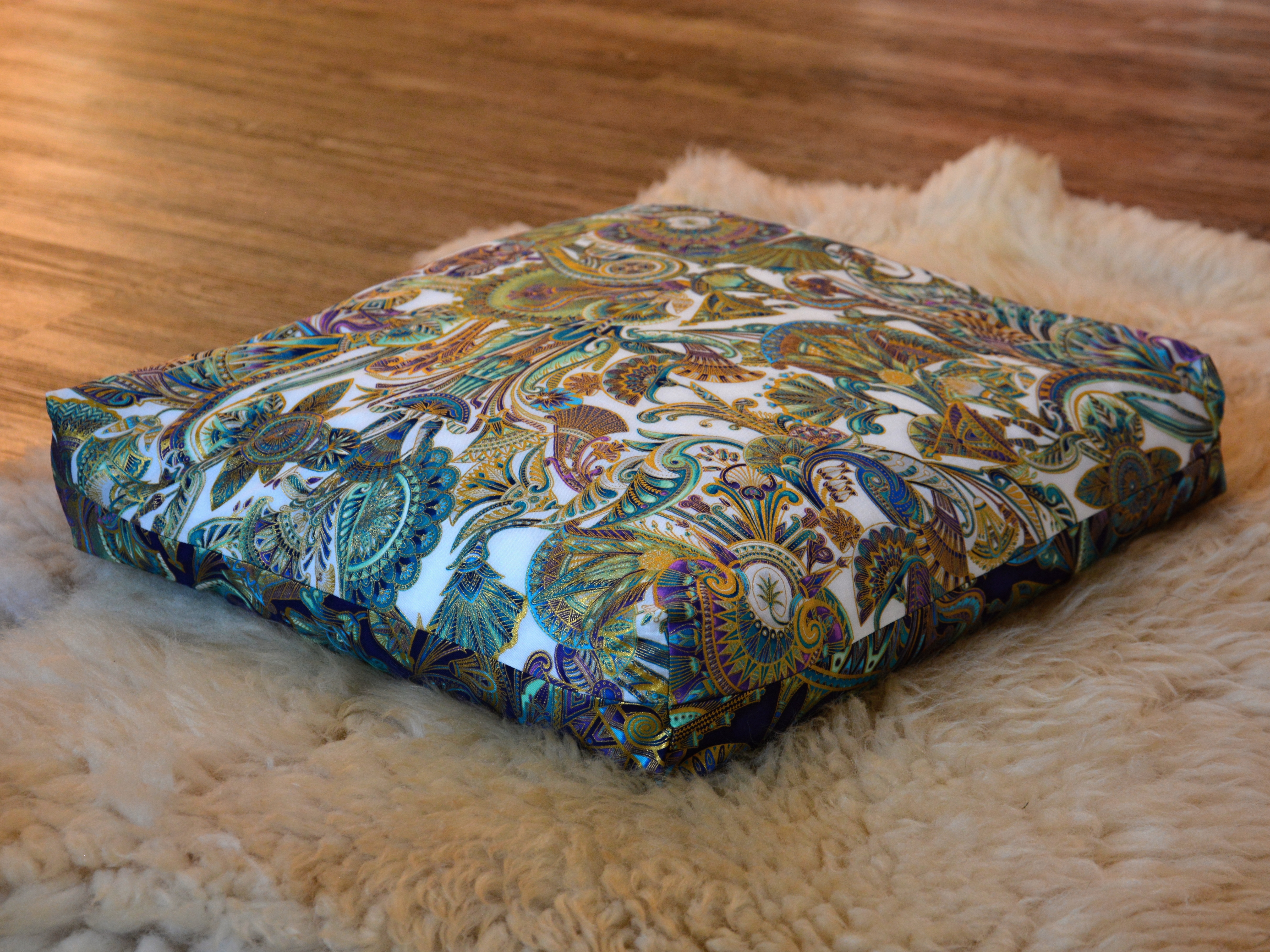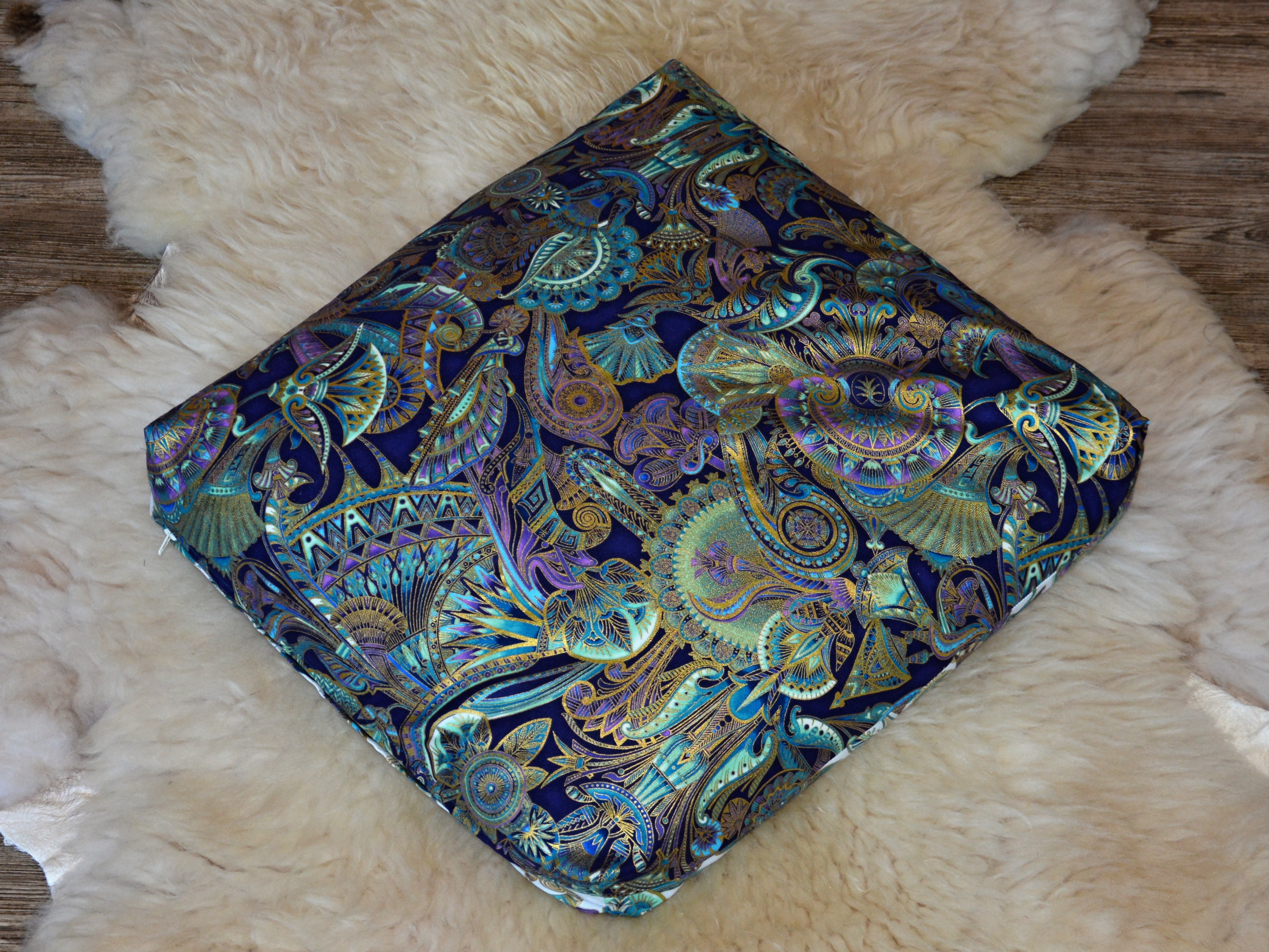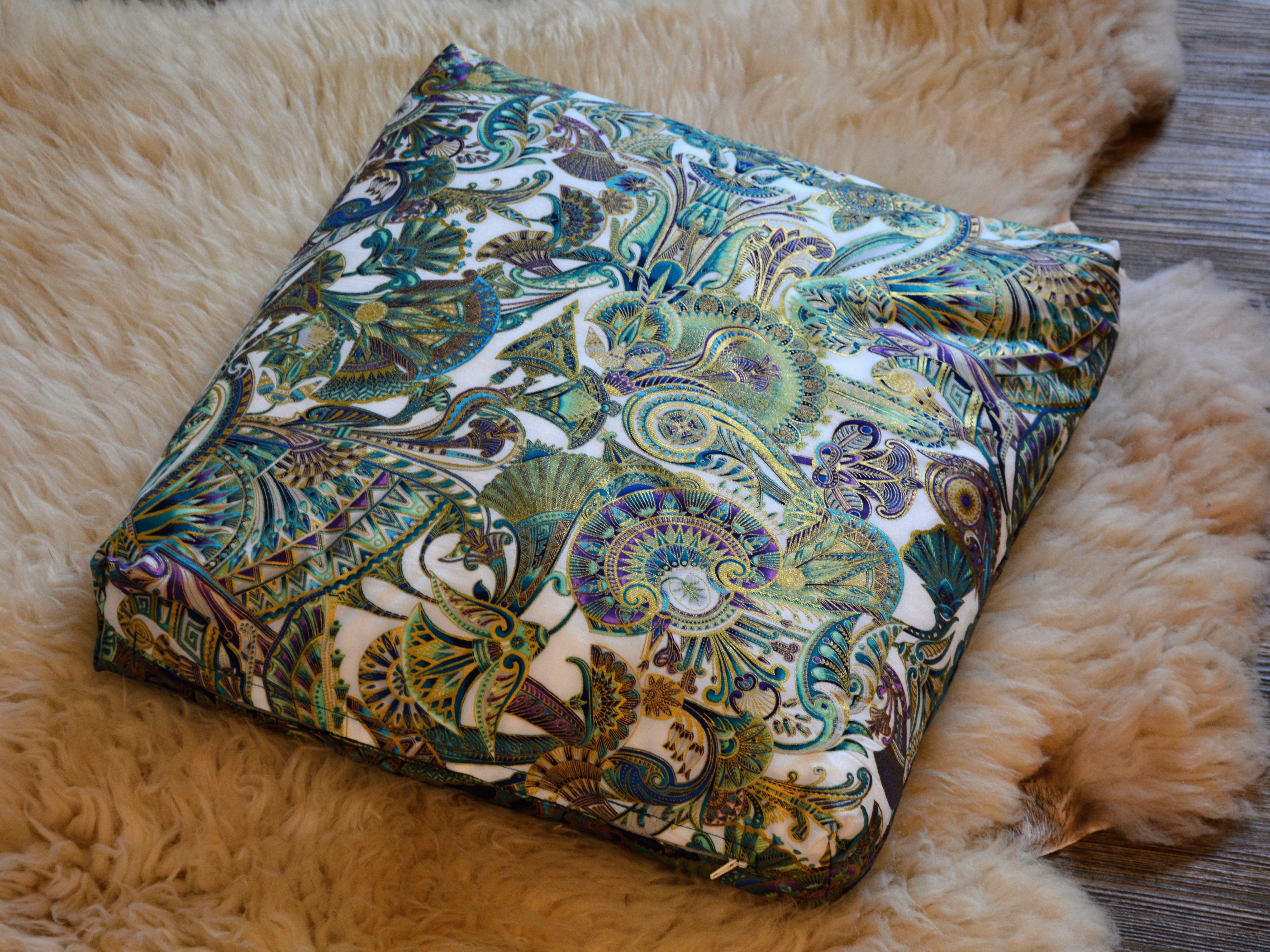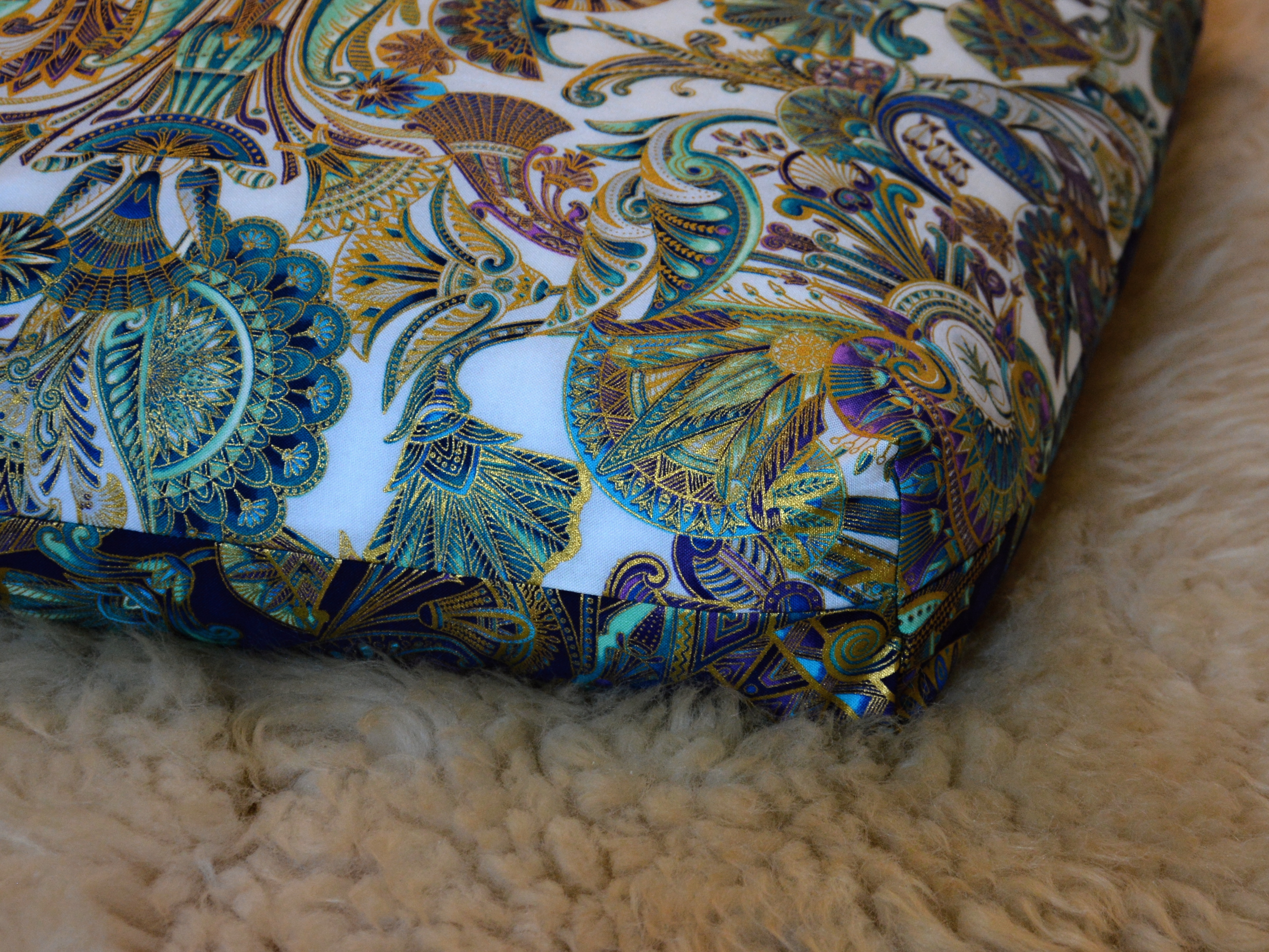 Vnější obal je ušitý z amerického bavlněného plátna se zapínáním na zip. Z jedné strany bílý podklad, z druhé fialový. Americká plátna jsou velmi kvalitní, nesráží se a drží jasnost barev. Vnitřní obal je z bílého bavlněného plátna, taktéž se zapínáním na zip, aby bylo možné náplň snadno vyměnit.