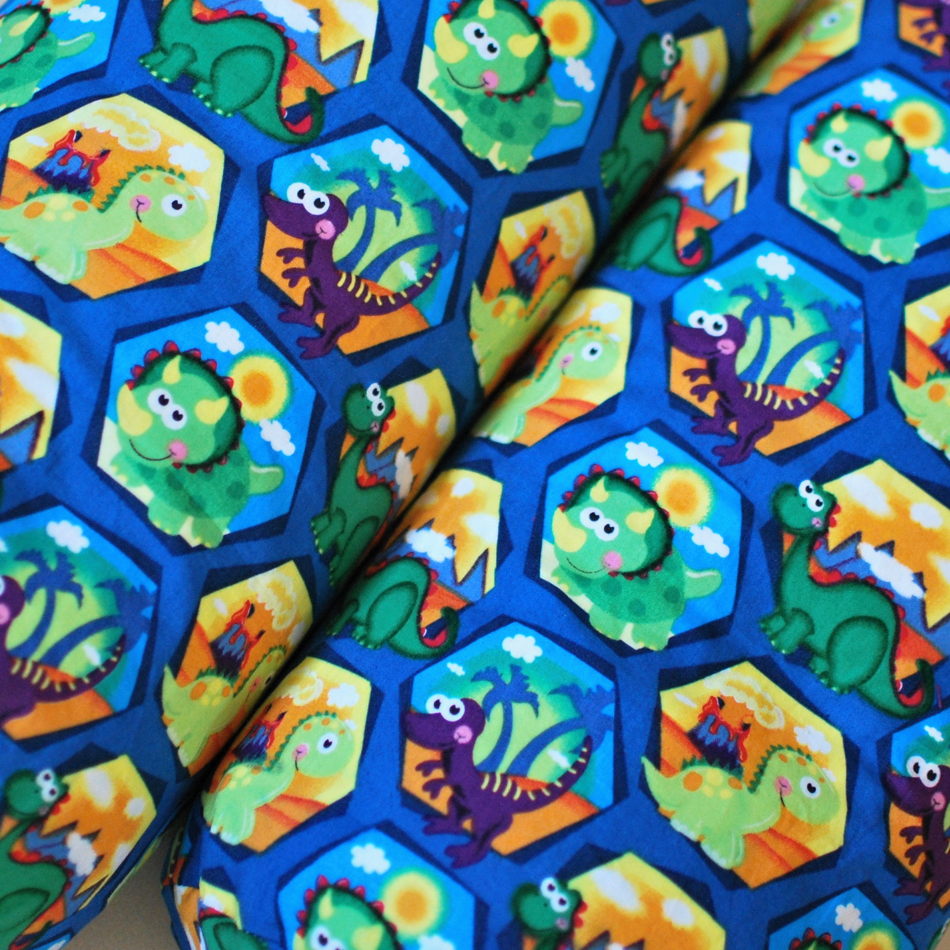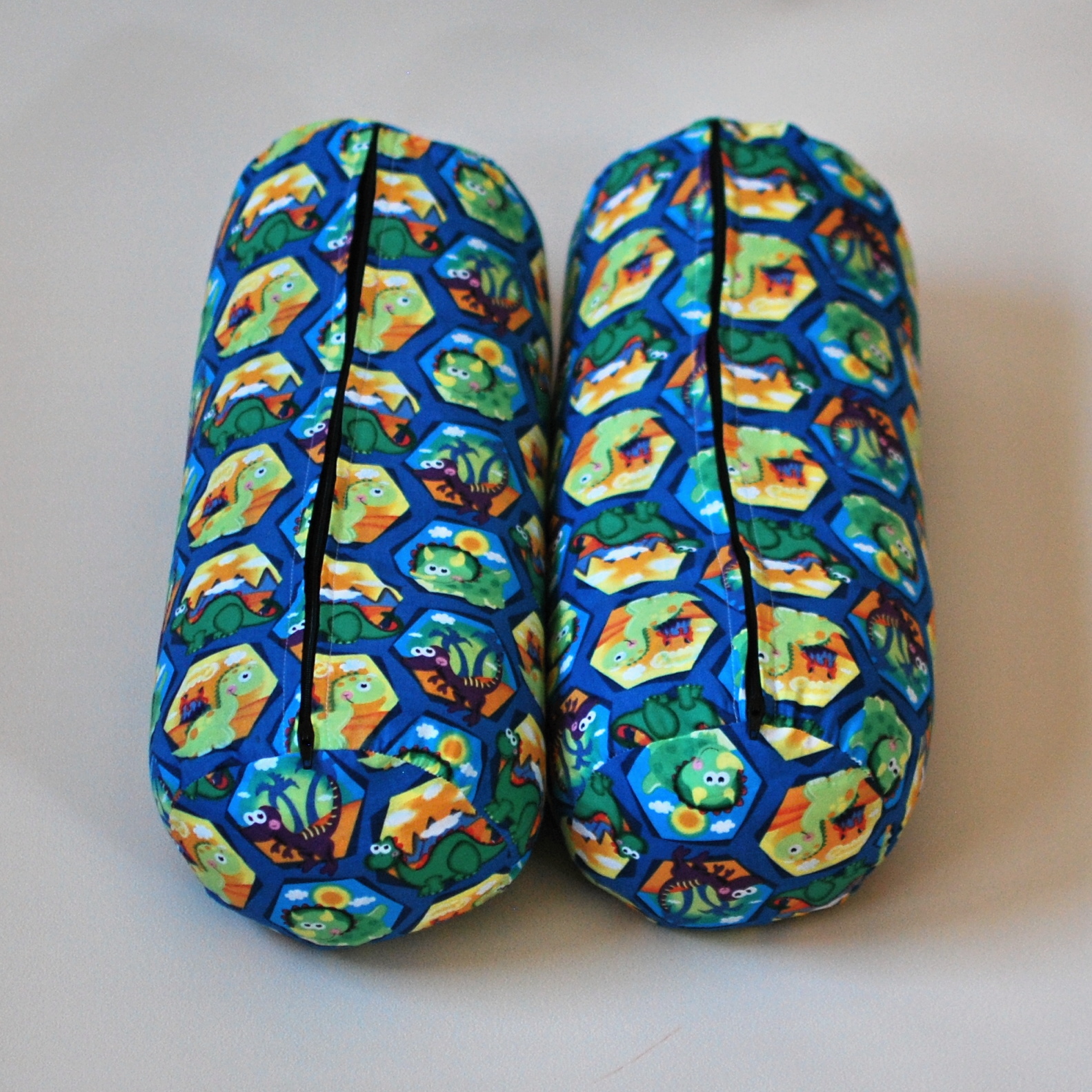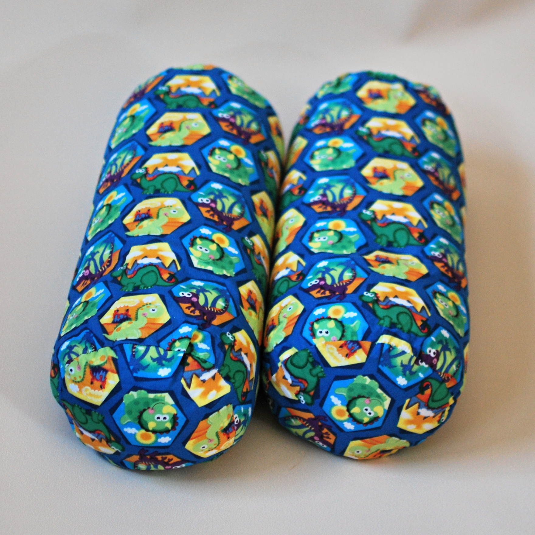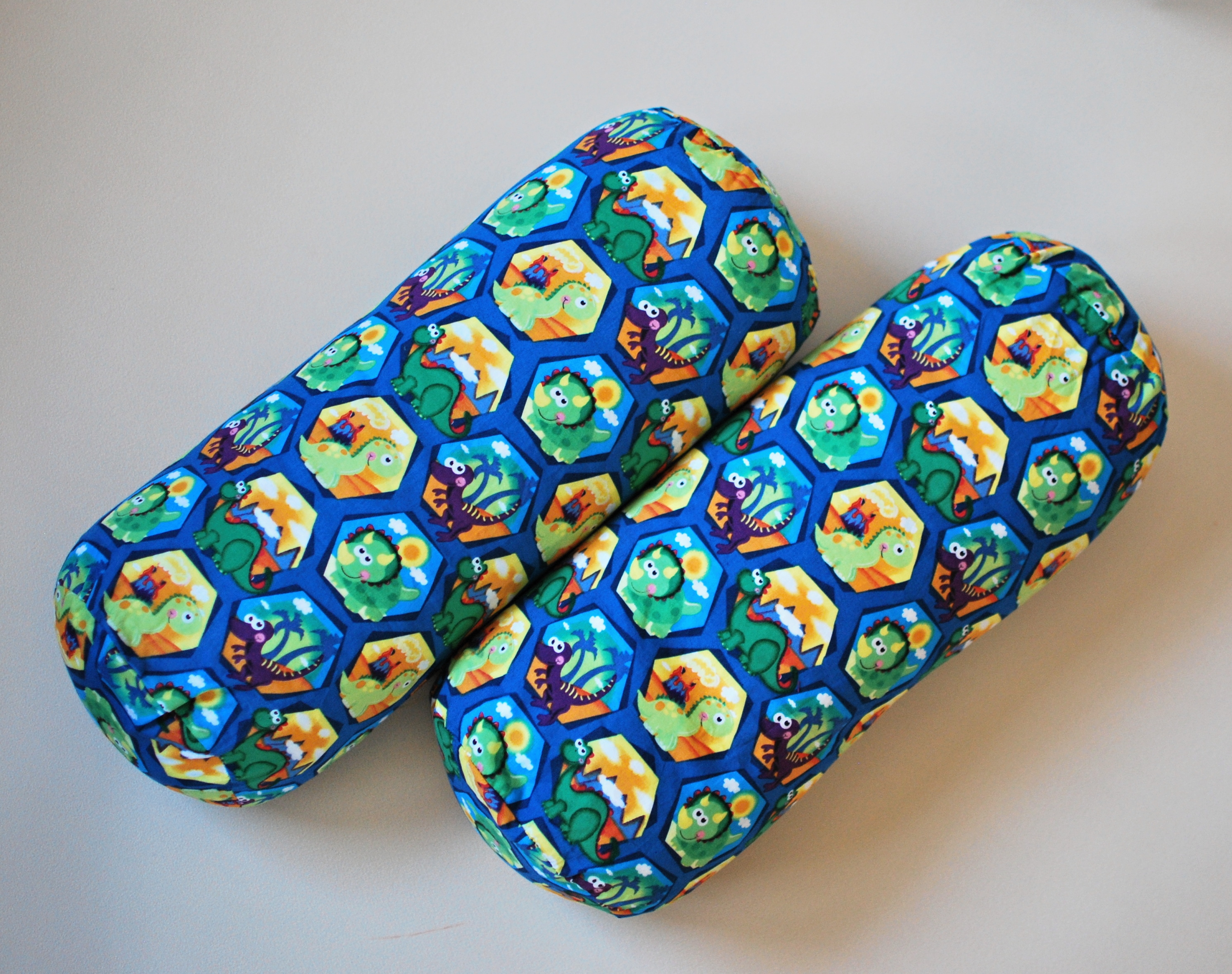 Univerzální polštář ve tvaru válečku, ušitý z krásné látky s potiskem dinosarů.