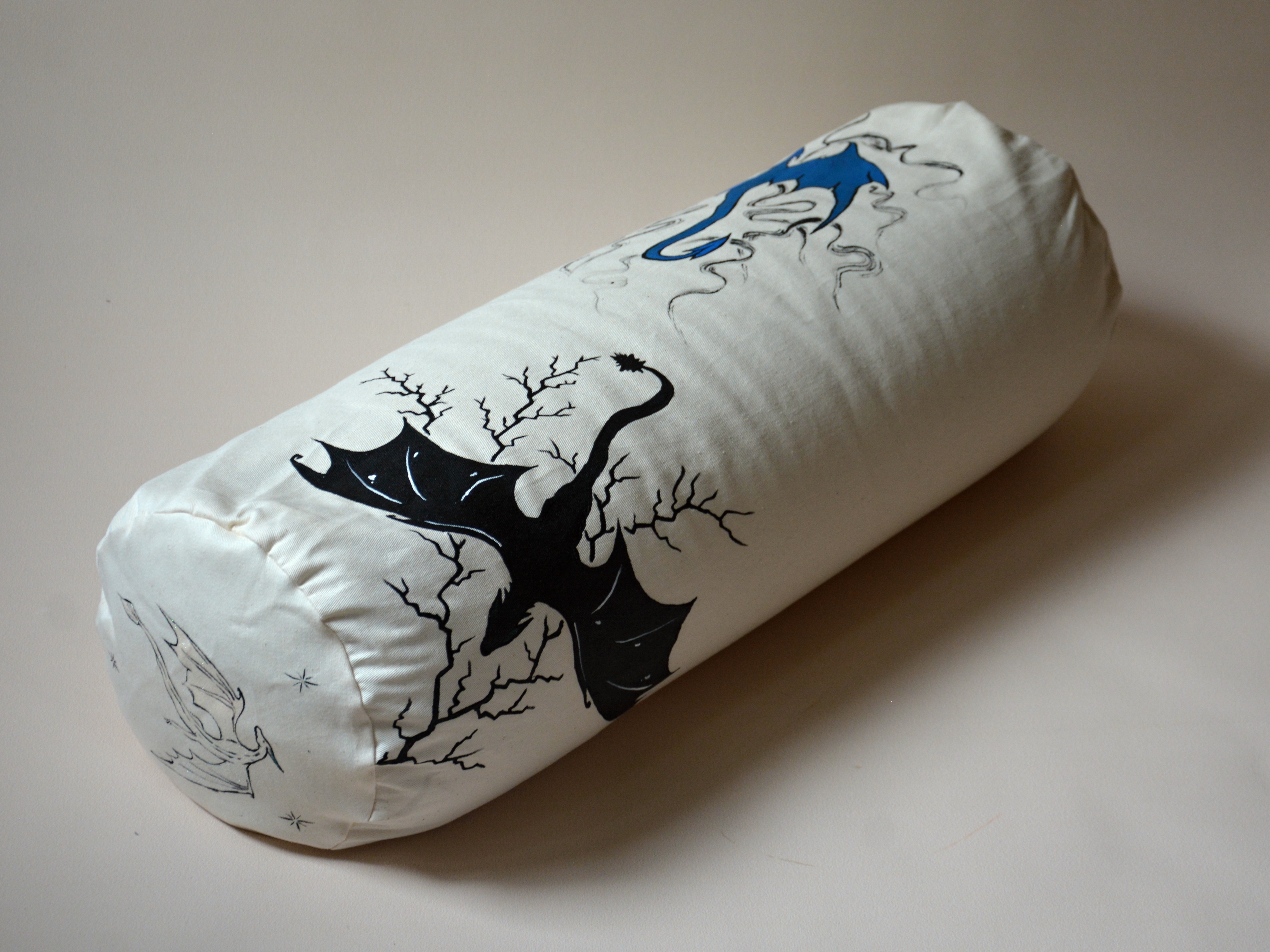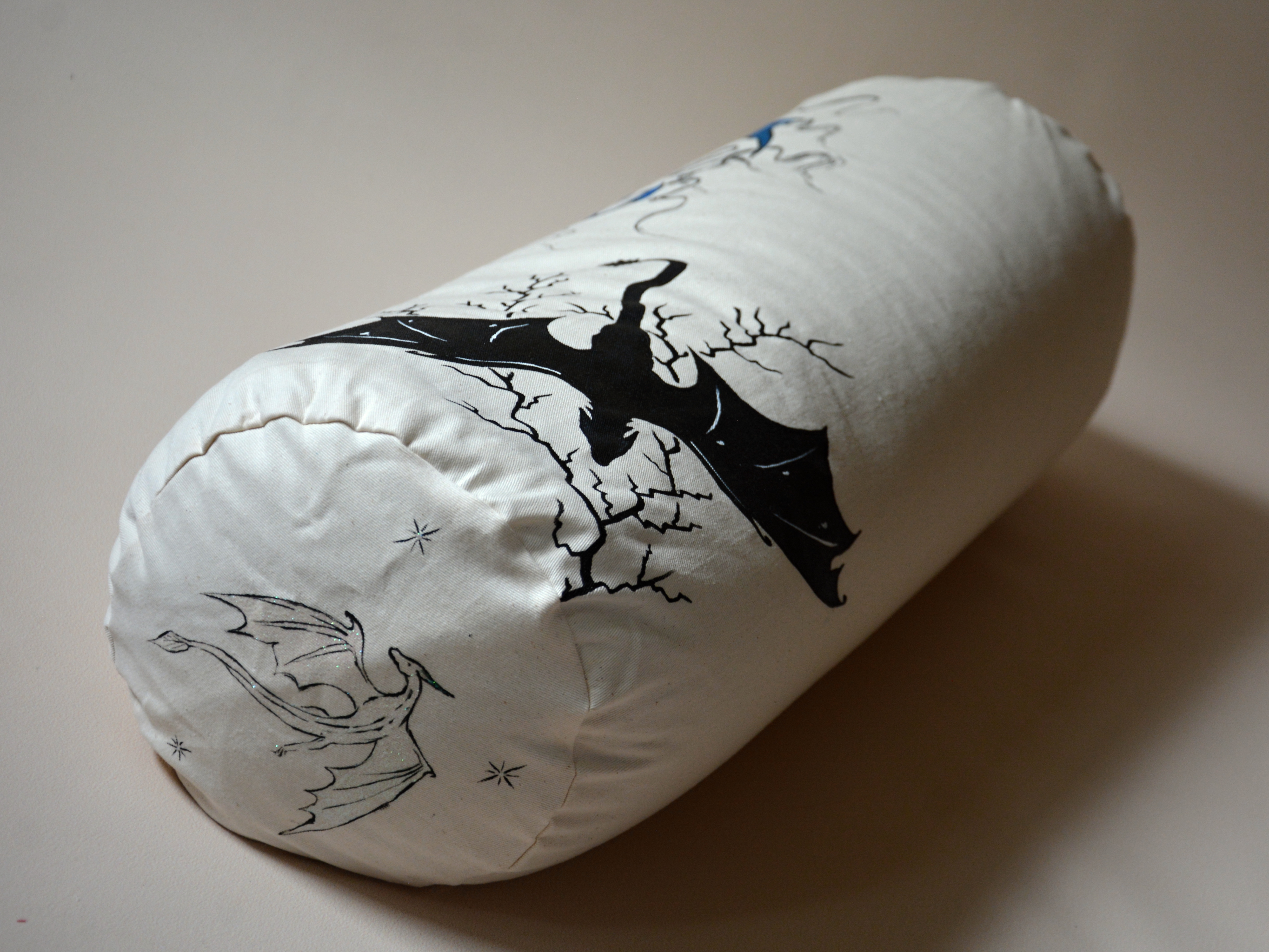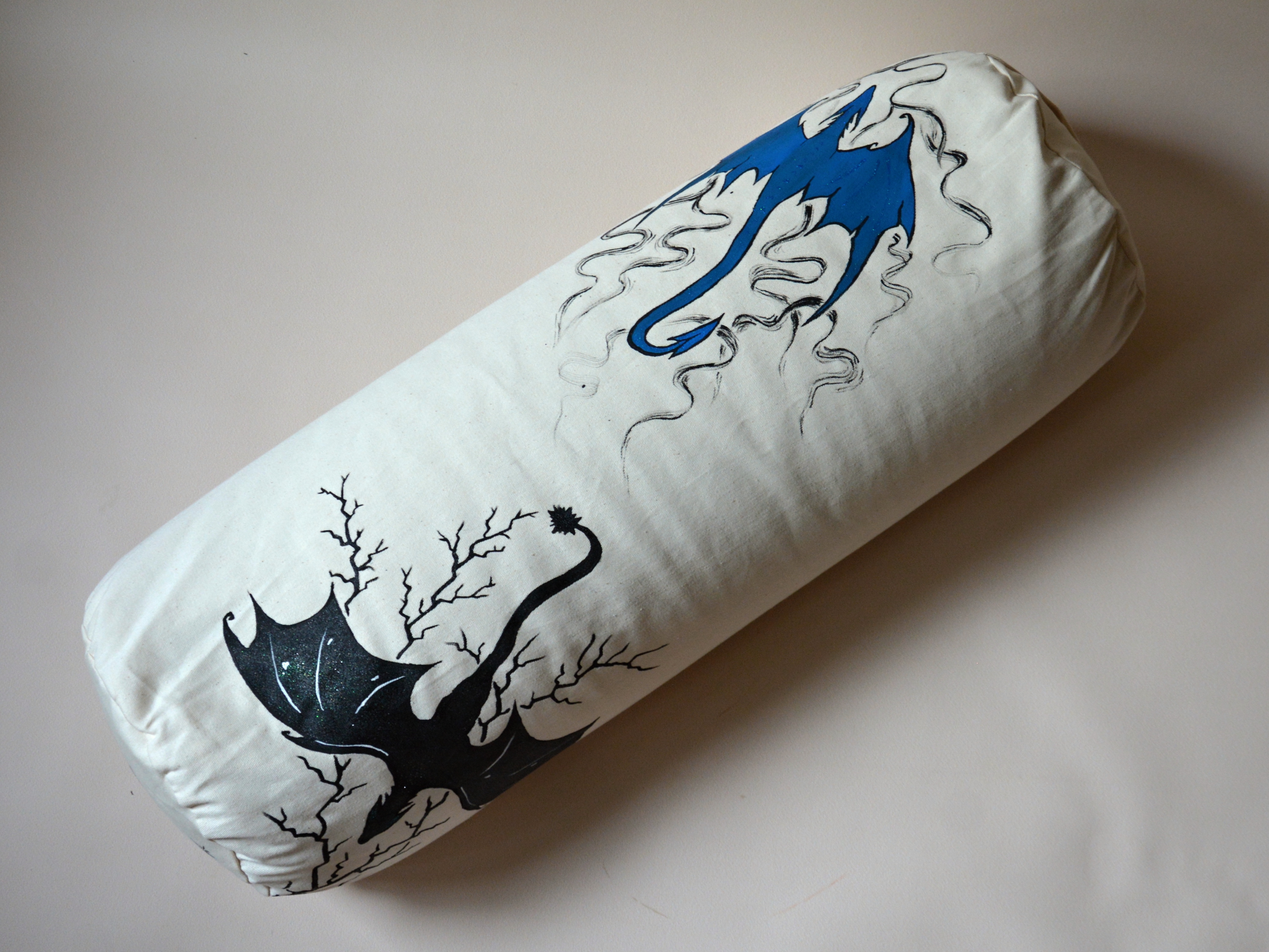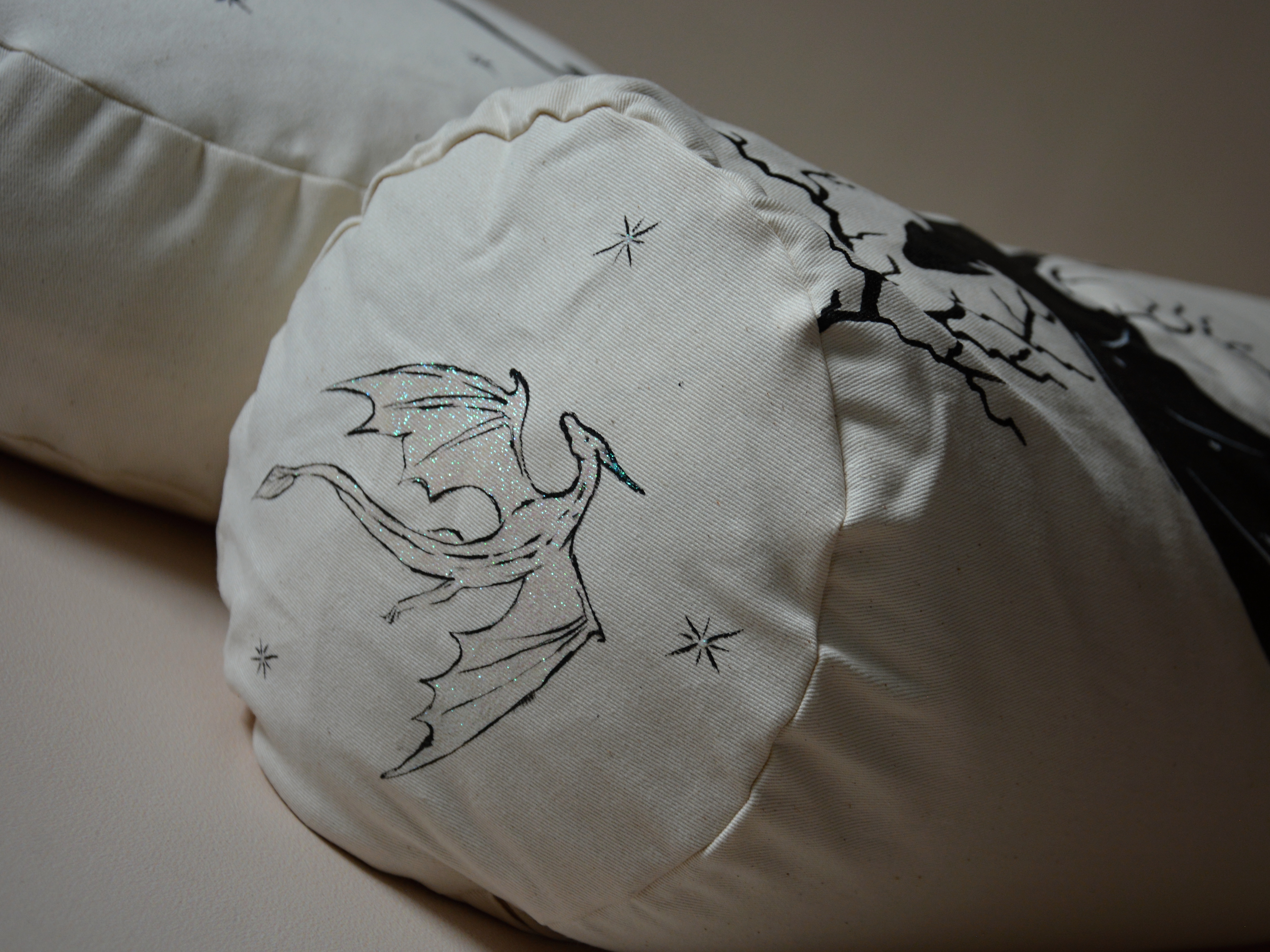 Univerzální polštář ve tvaru válce, v barvě natural (organická bavlna) s malbou draků, na motivy knihy Čtvrté křídlo... draci Tairn, Andarna a Sgaeyl...