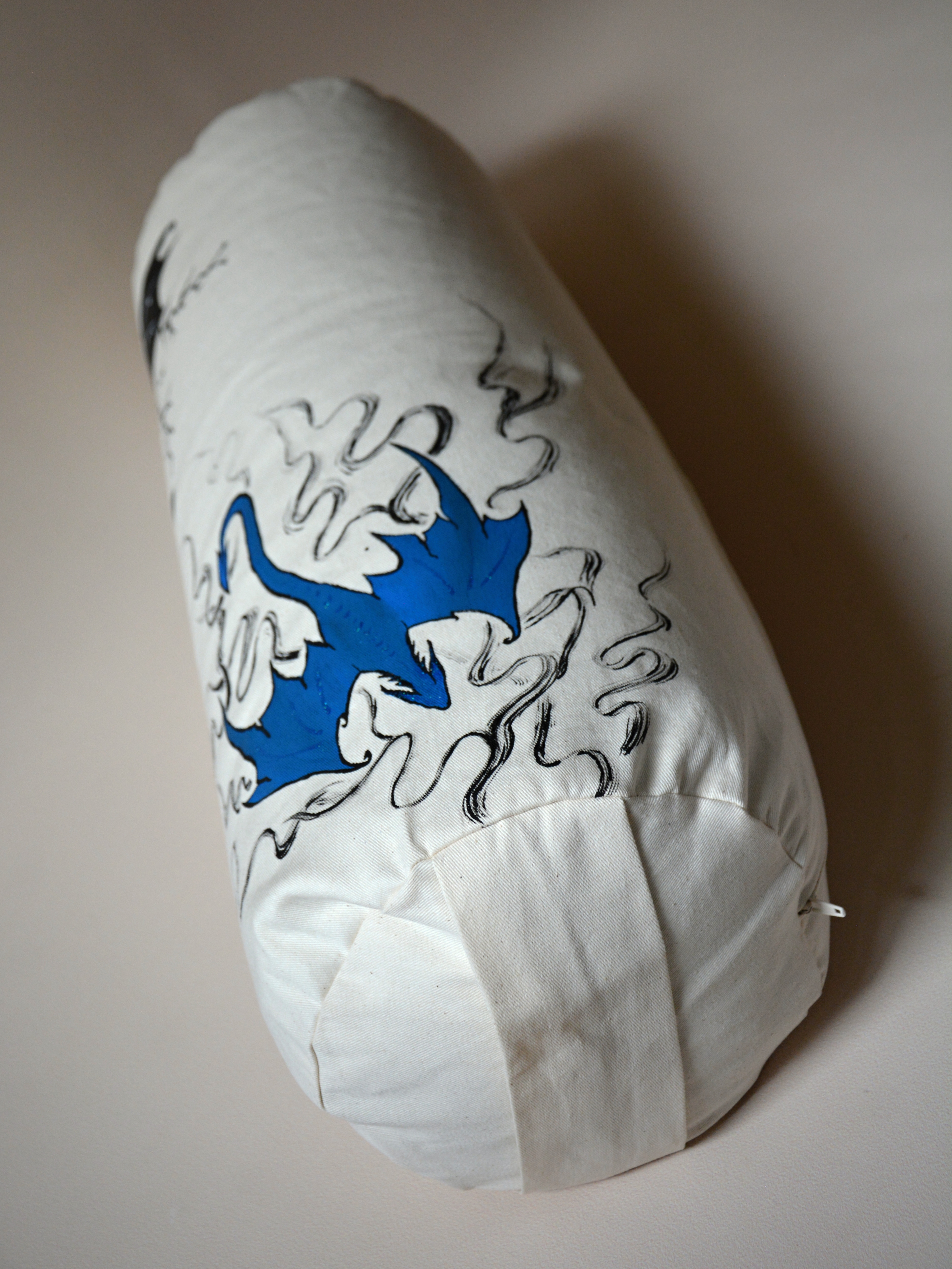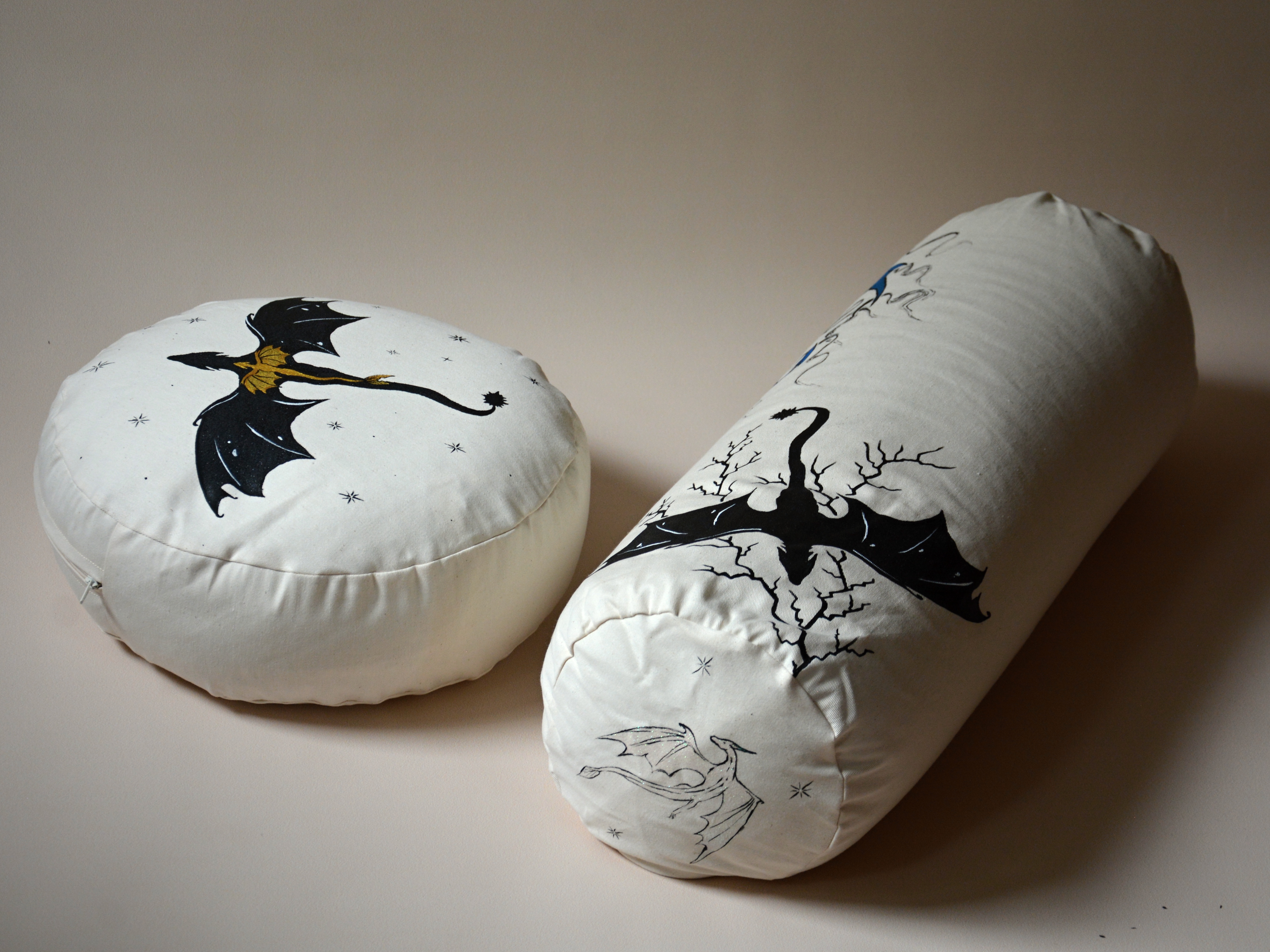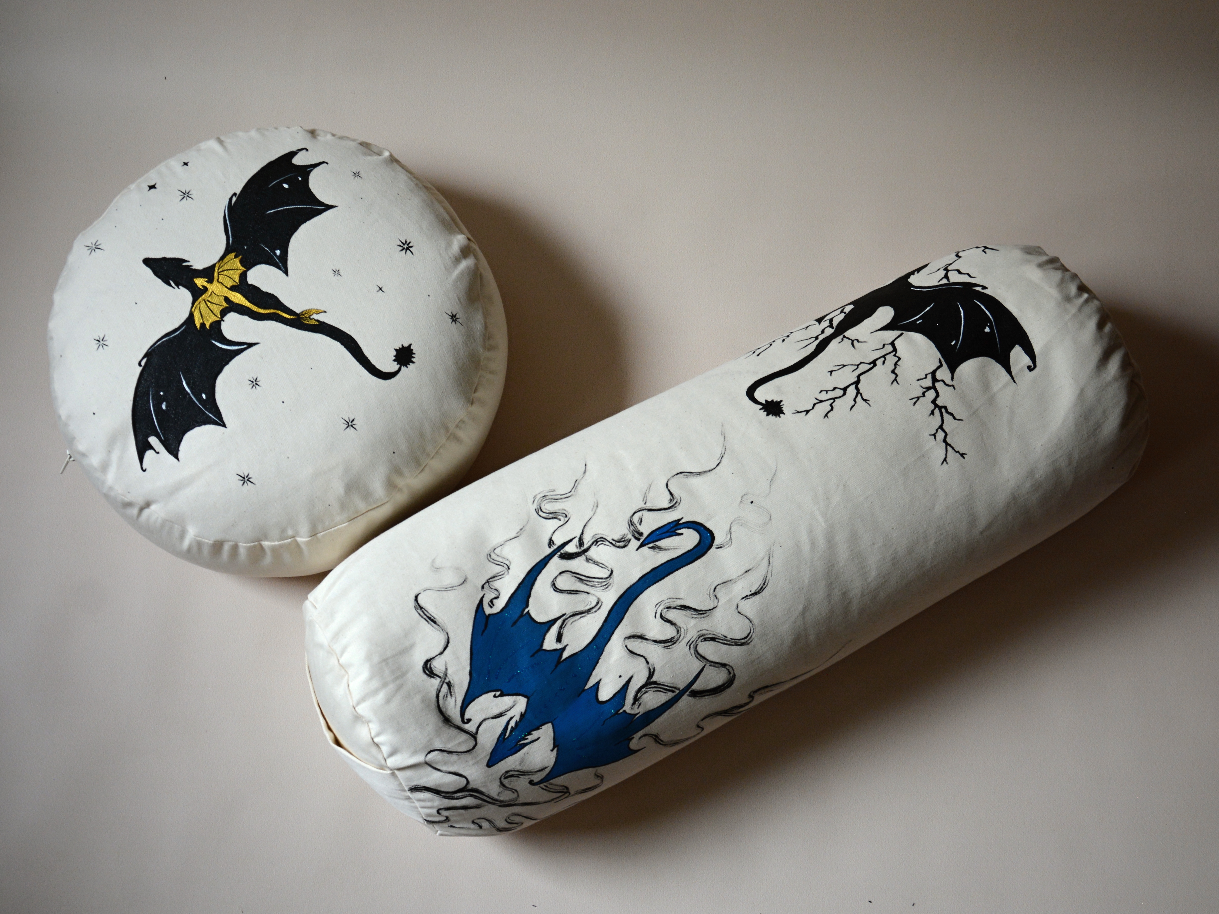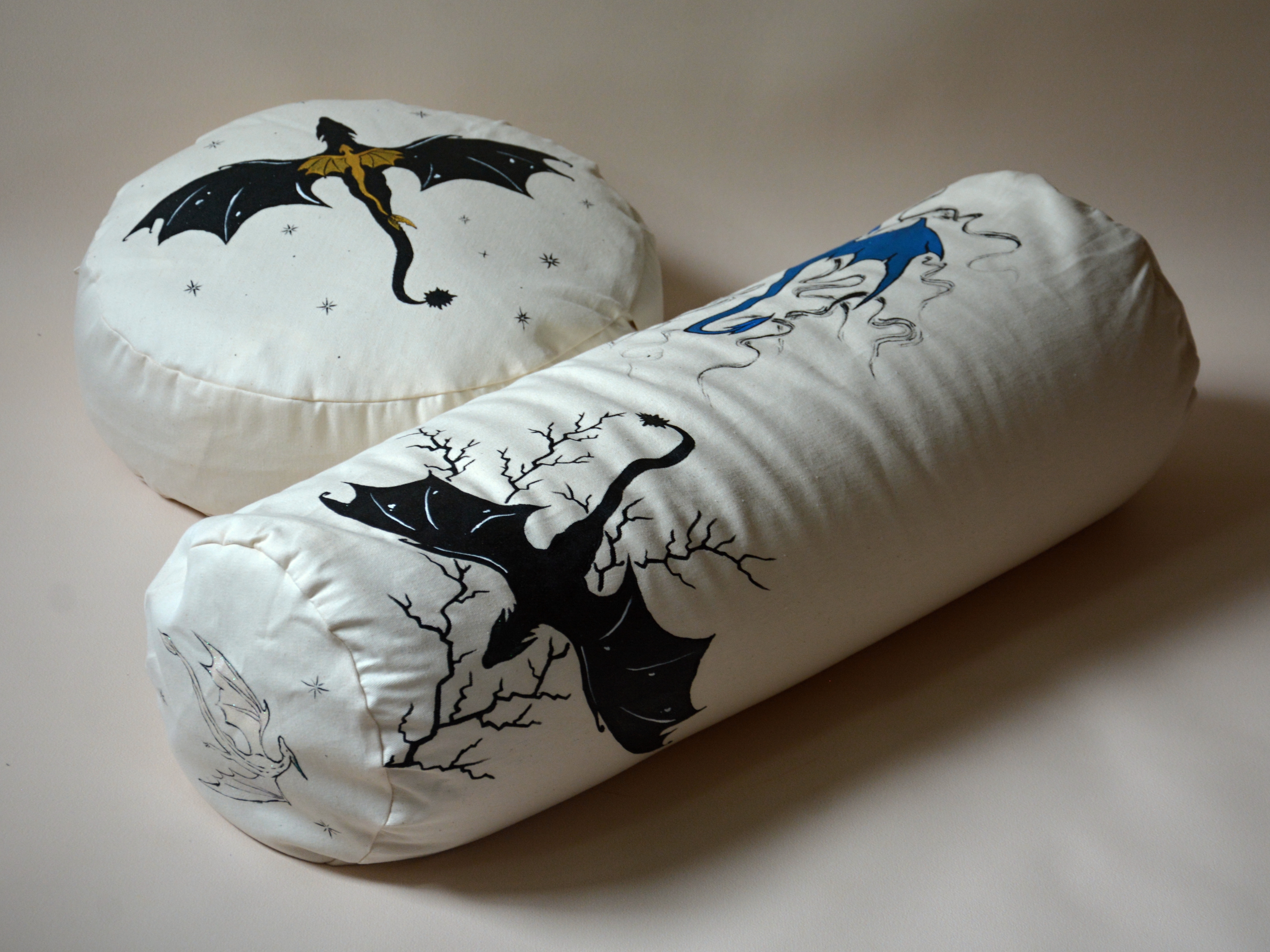 Univerzální polštář ve tvaru válce, v barvě natural (organická bavlna) s malbou draků, na motivy knihy Čtvrté křídlo... draci Tairn, Andarna a Sgaeyl...