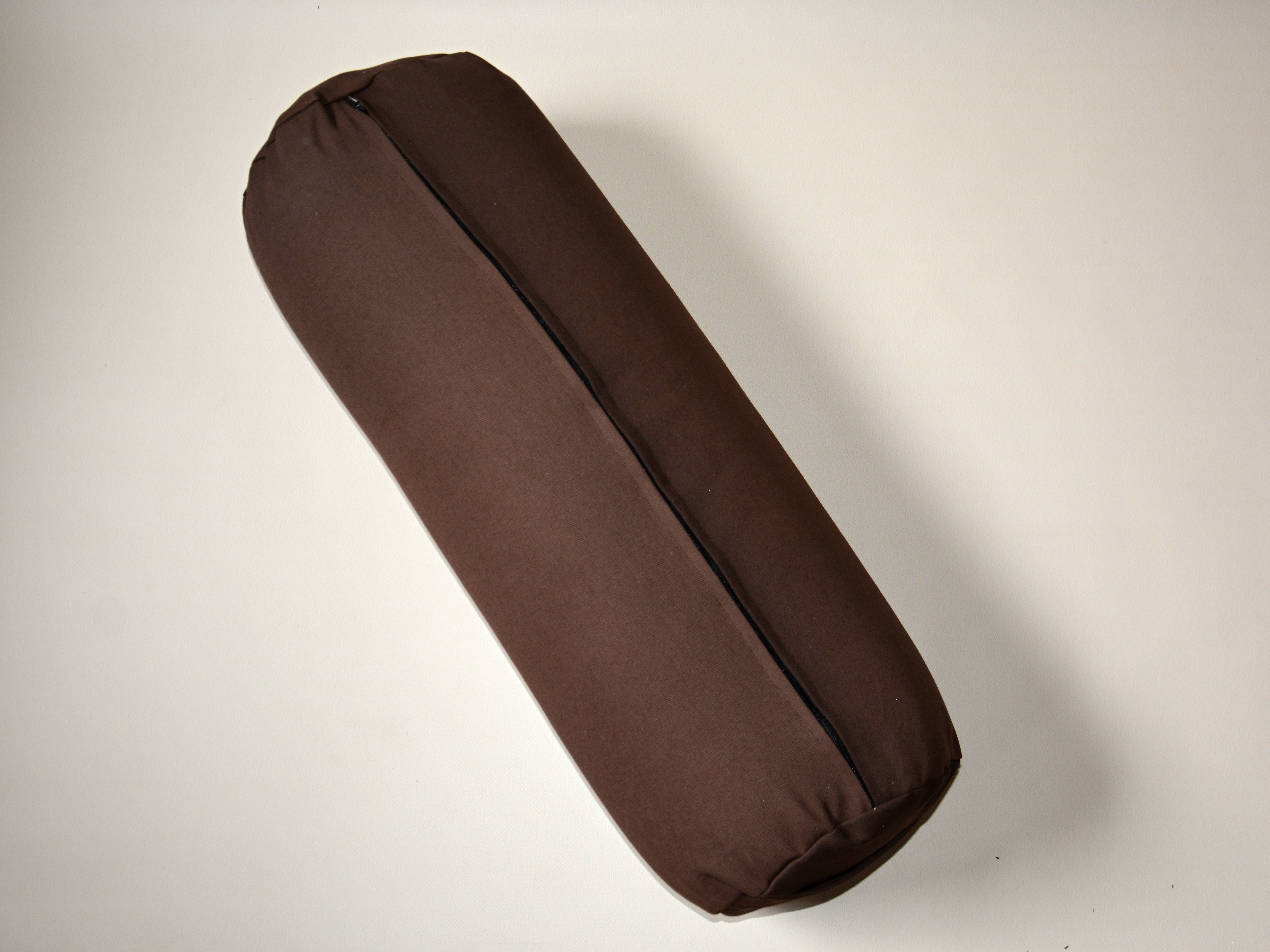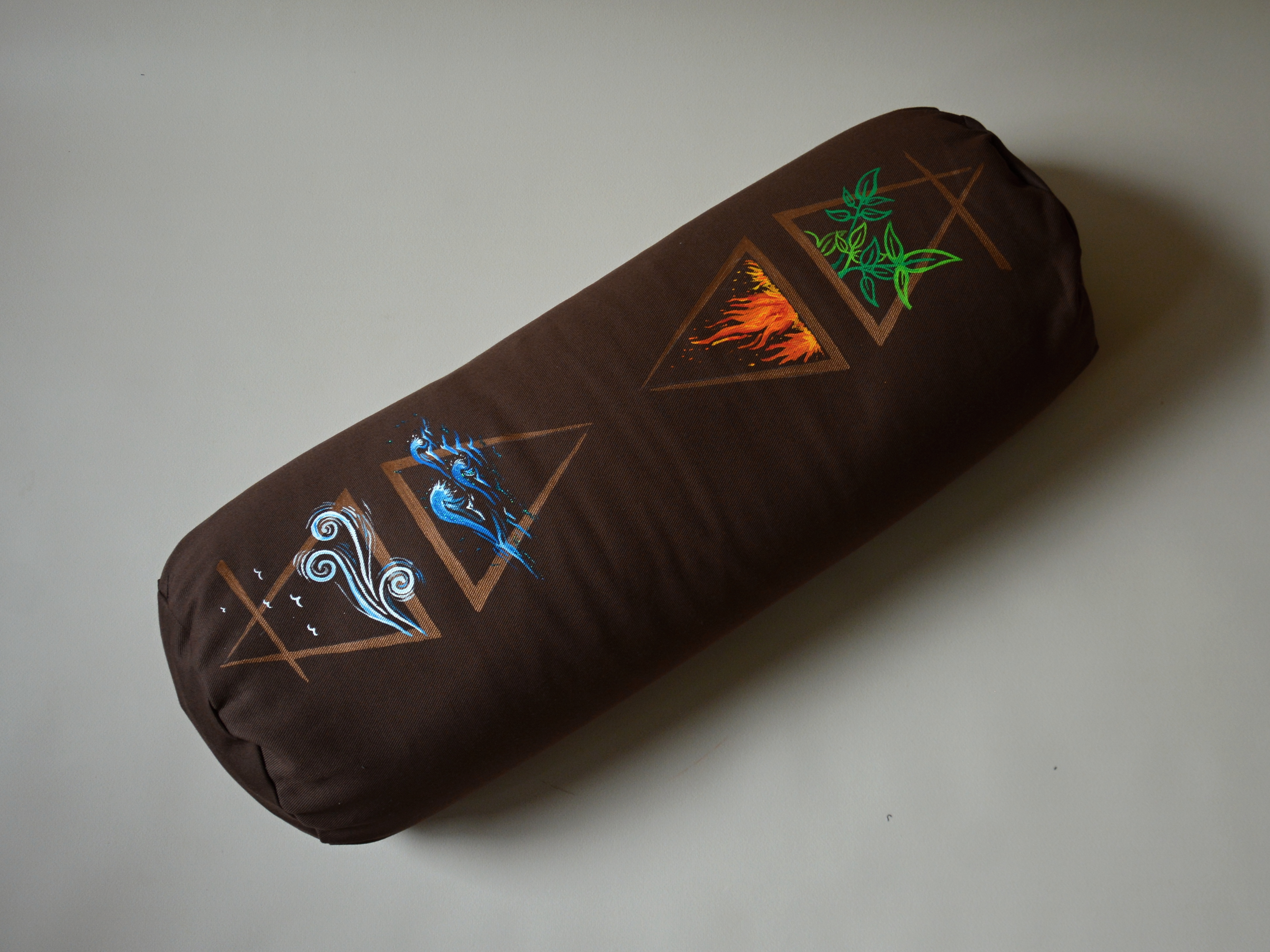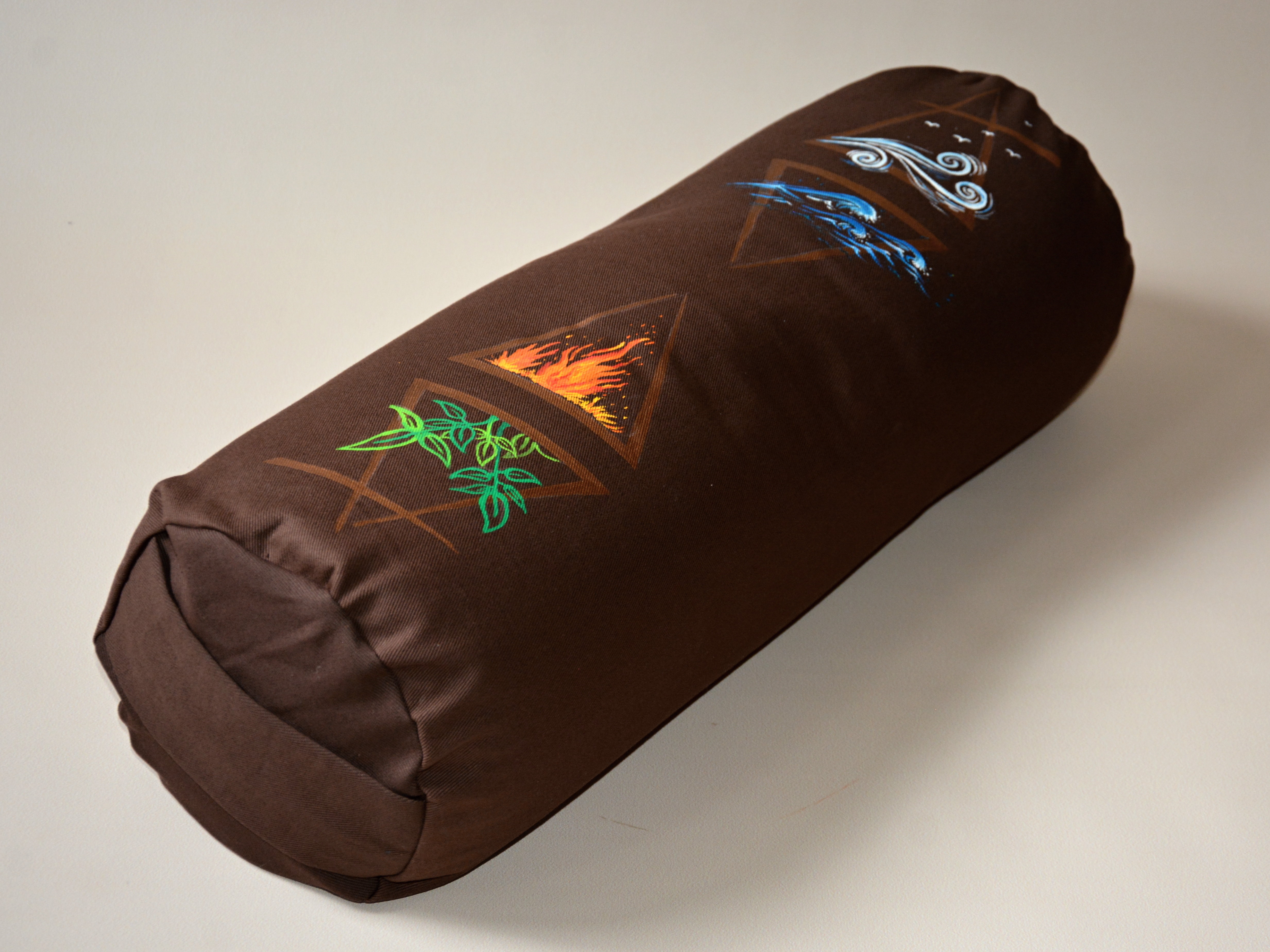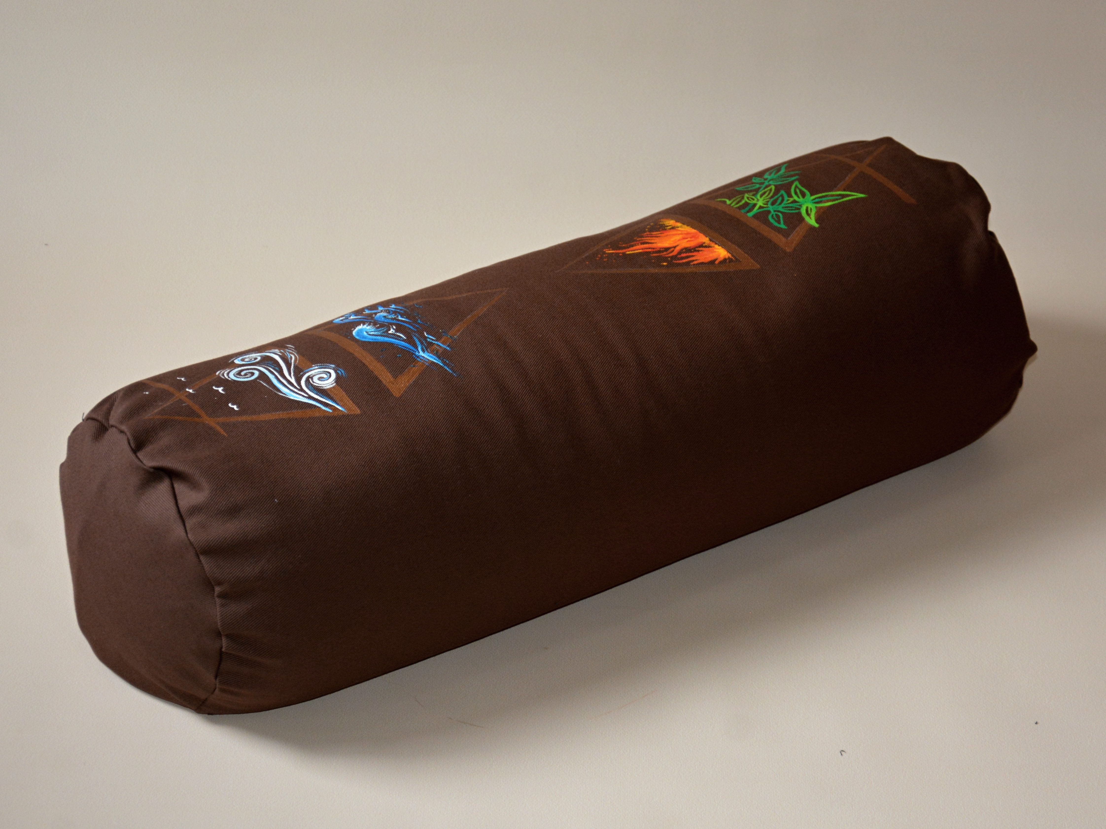 Univerzální polštář ve tvaru válce, v hnědém provedení s malbou. Plněný bio pohankovými slupkami. Ideální pod hlavu či jako opora bederní páteře při sezení, a samozřejmě také na cvičení jógy.