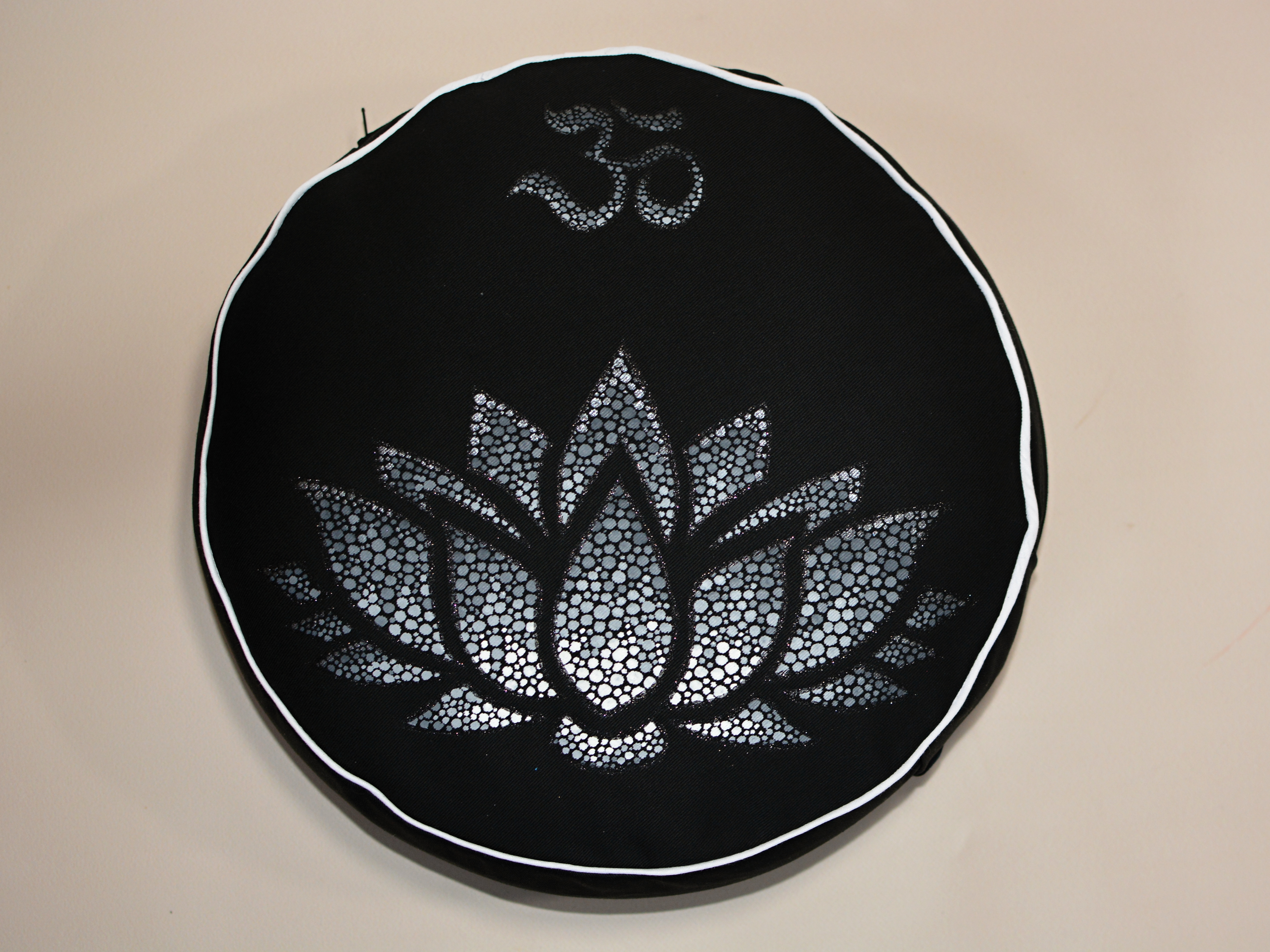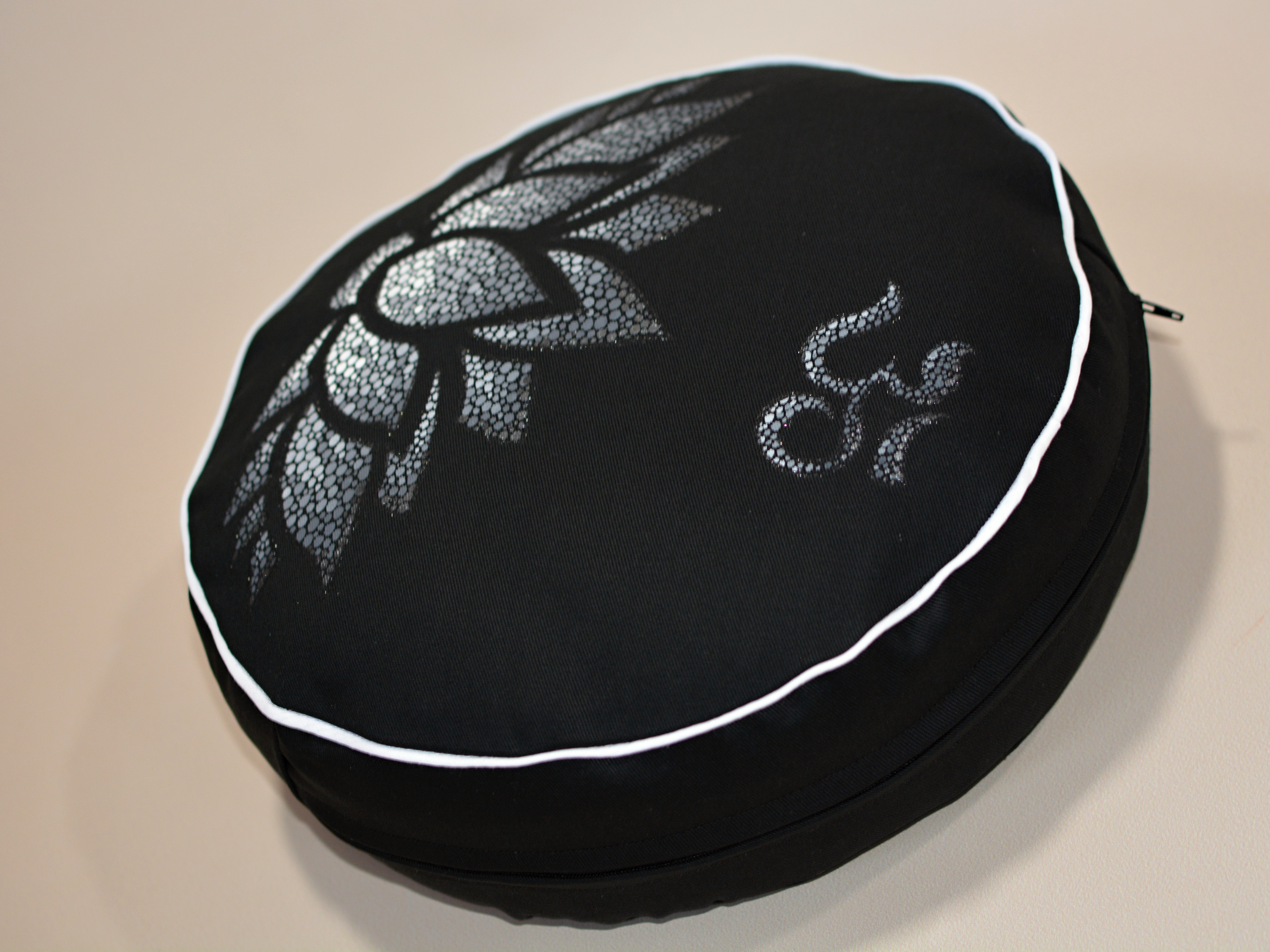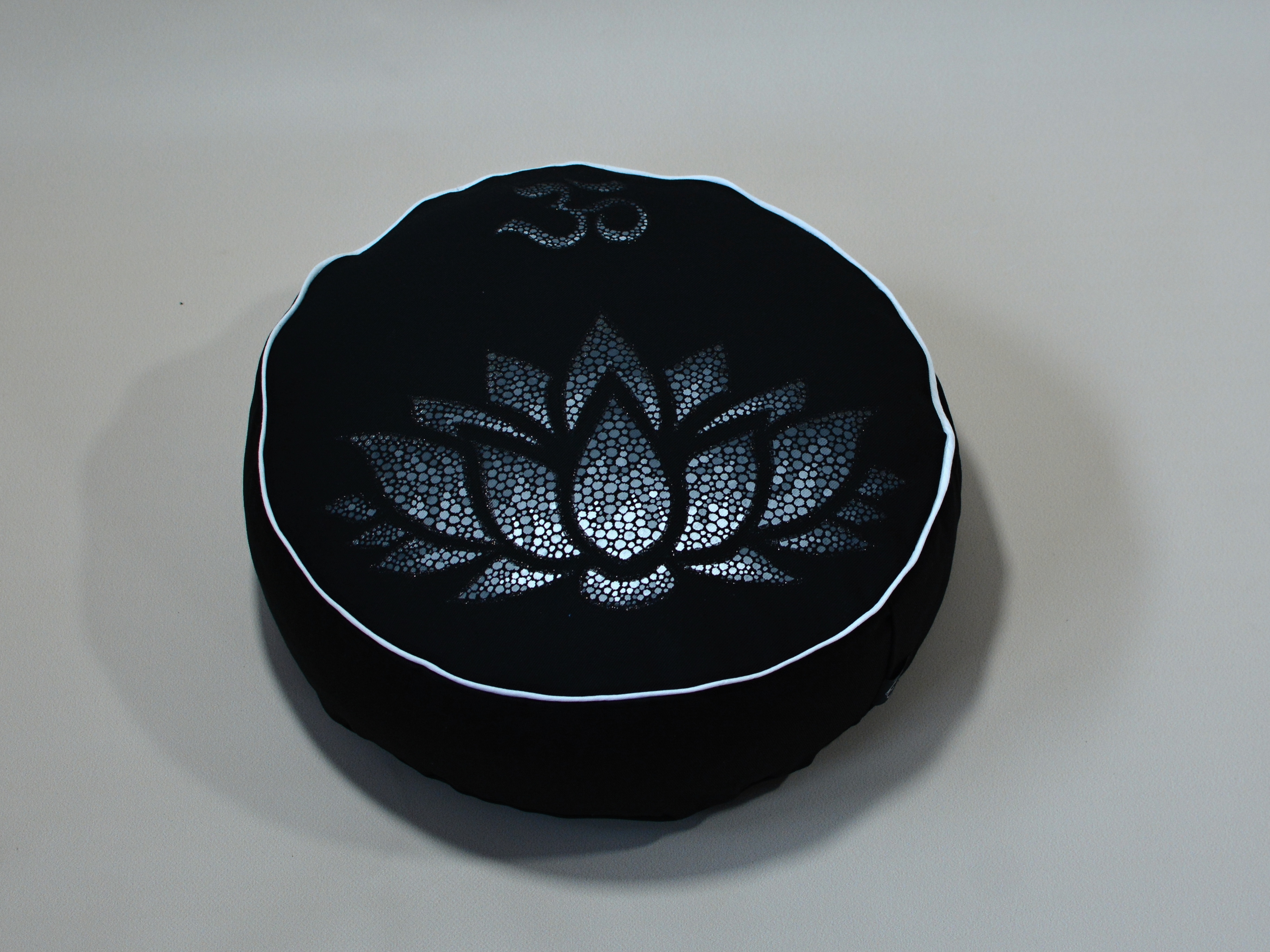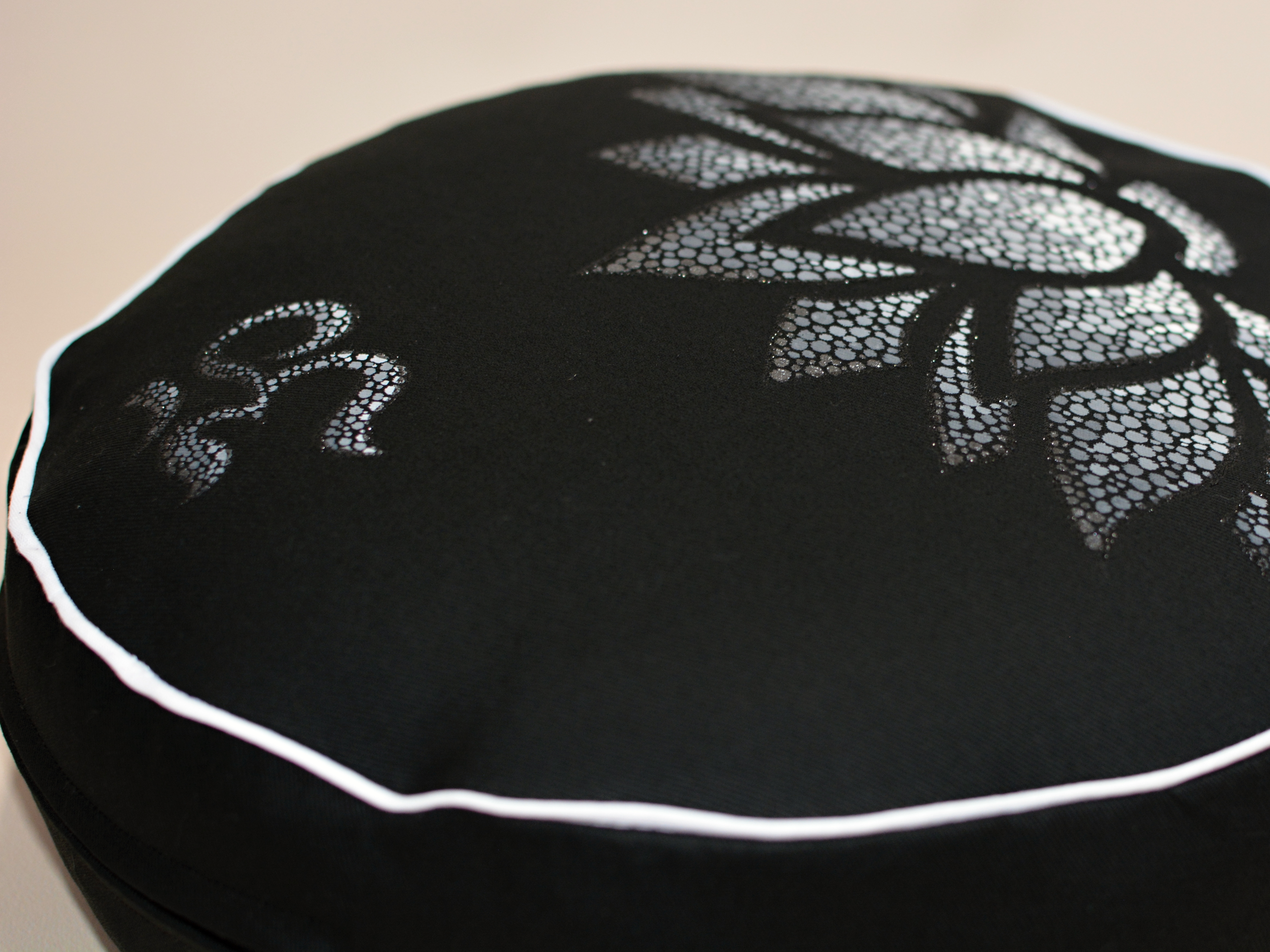 Meditační polštář v černém provedení a malbou v odstínech šedé, obšitý ozdobnou paspulkou.