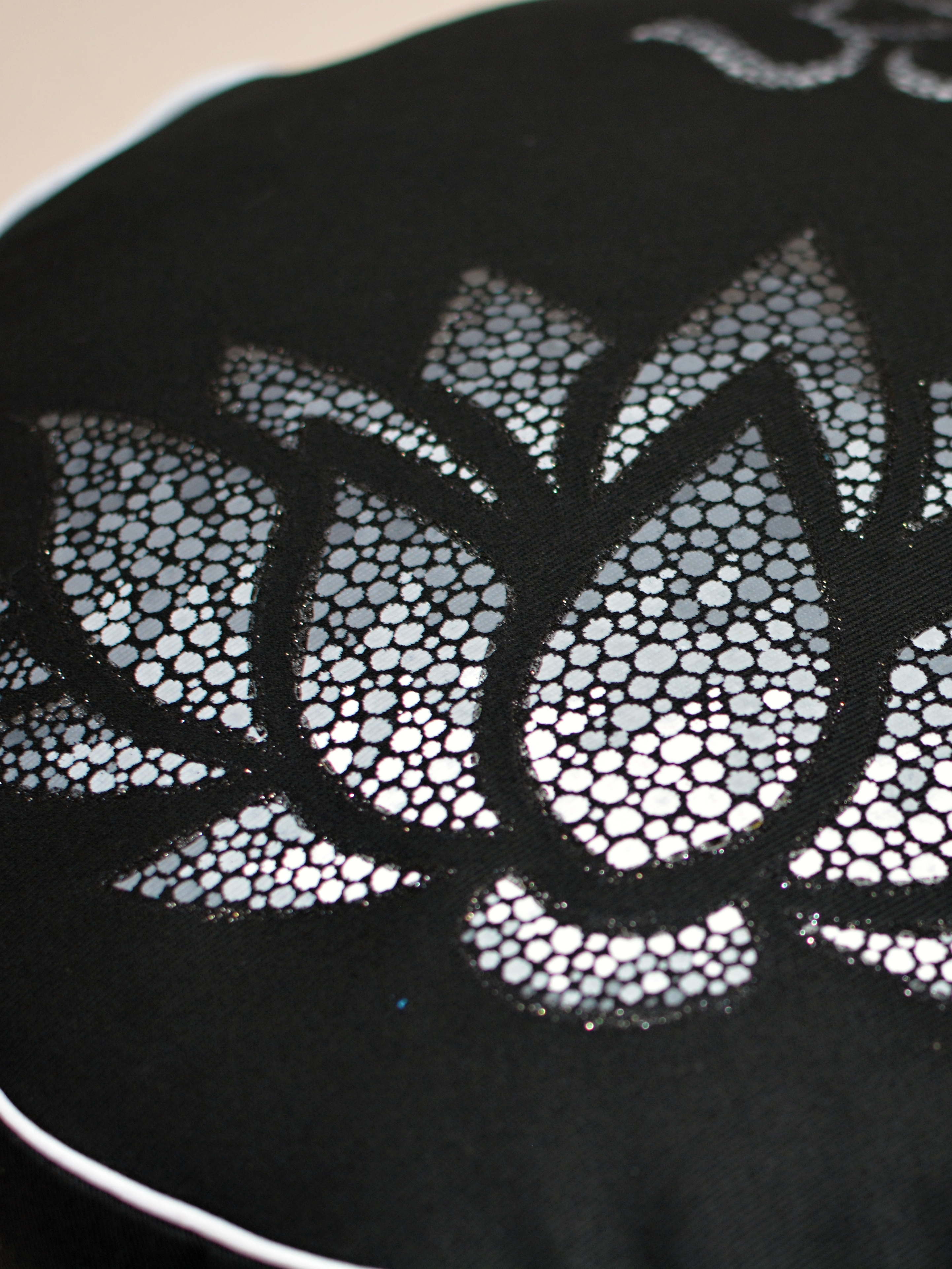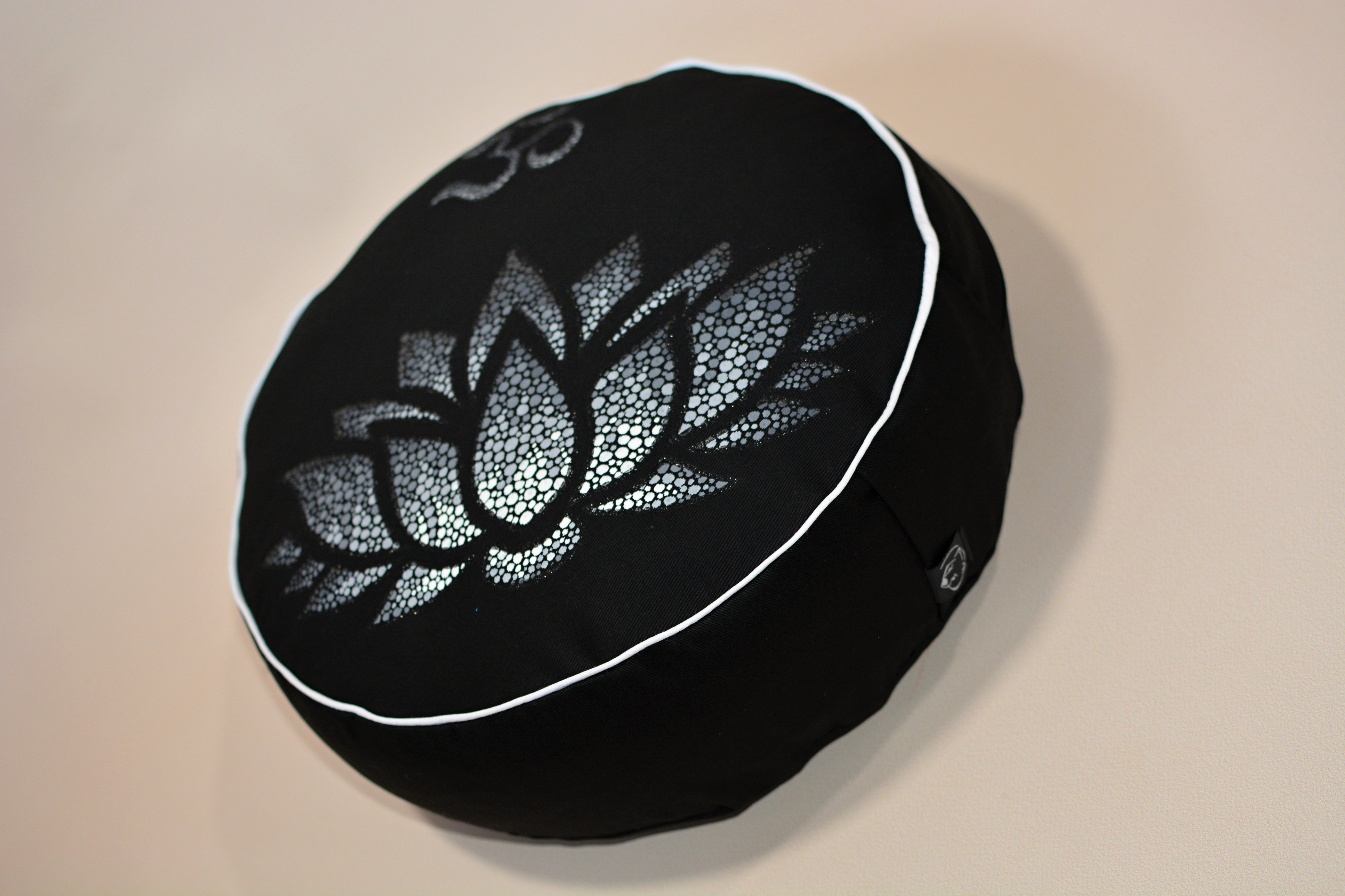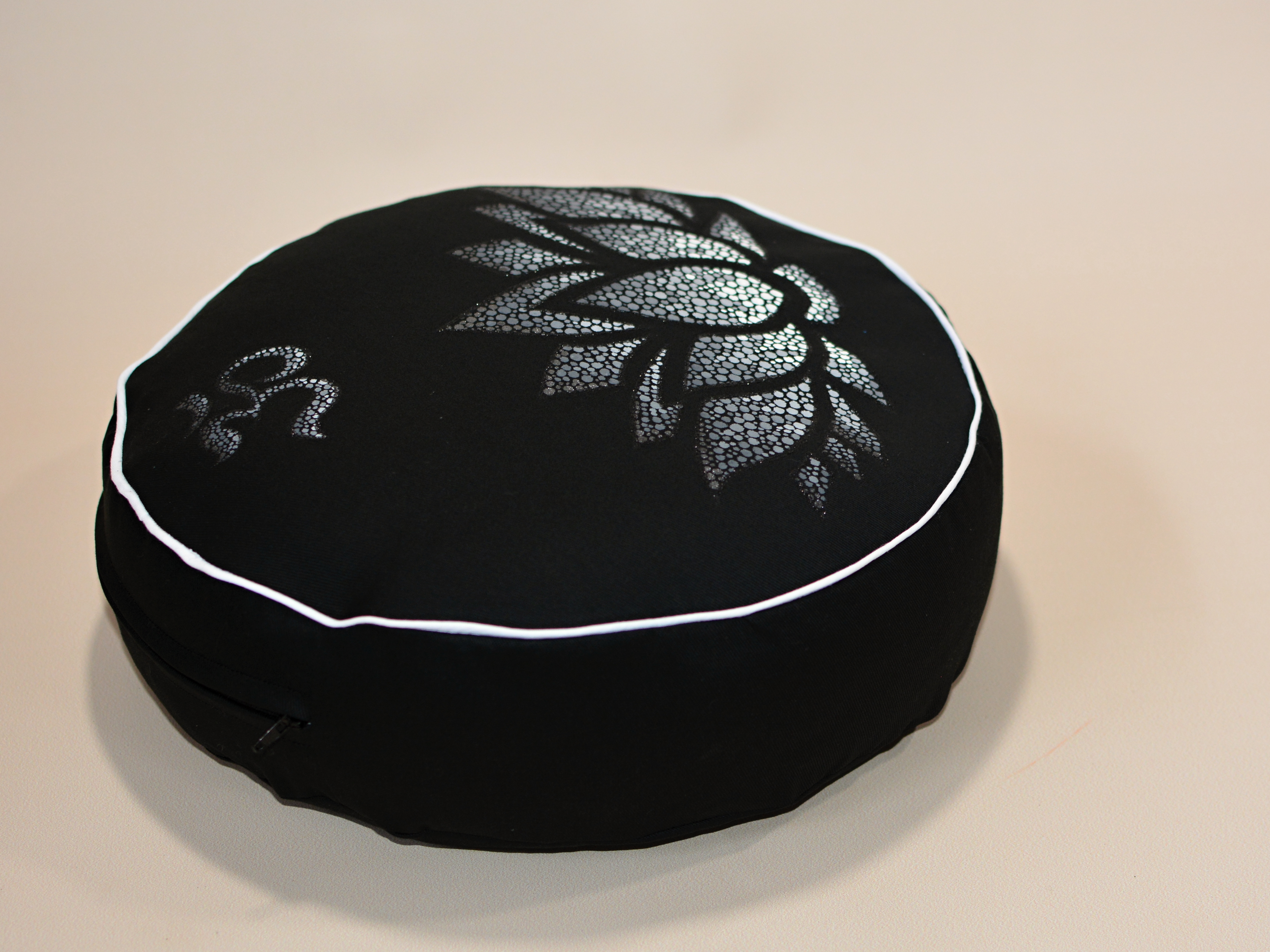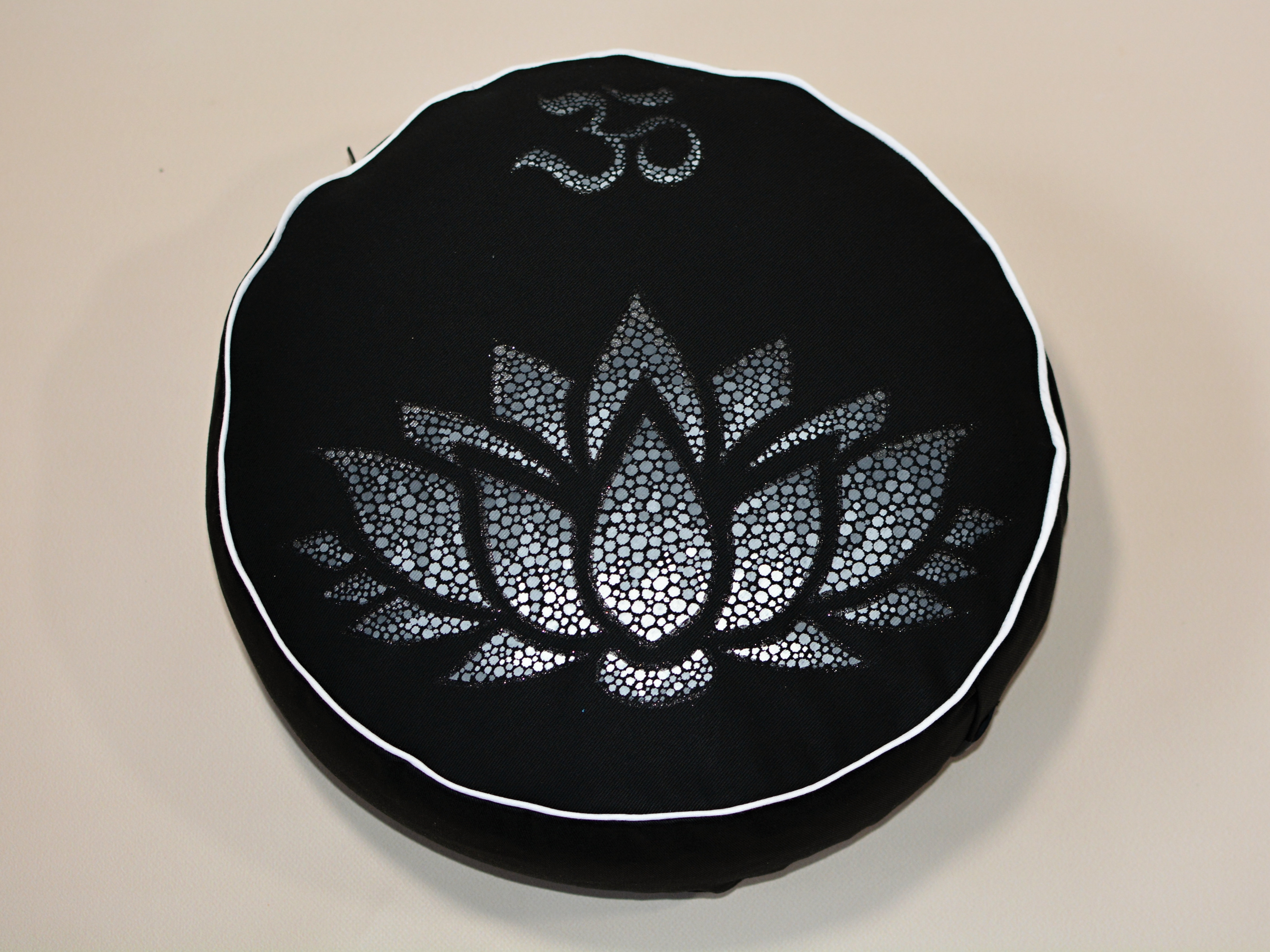 Meditační polštář v černém provedení a malbou v odstínech šedé, obšitý ozdobnou paspulkou.