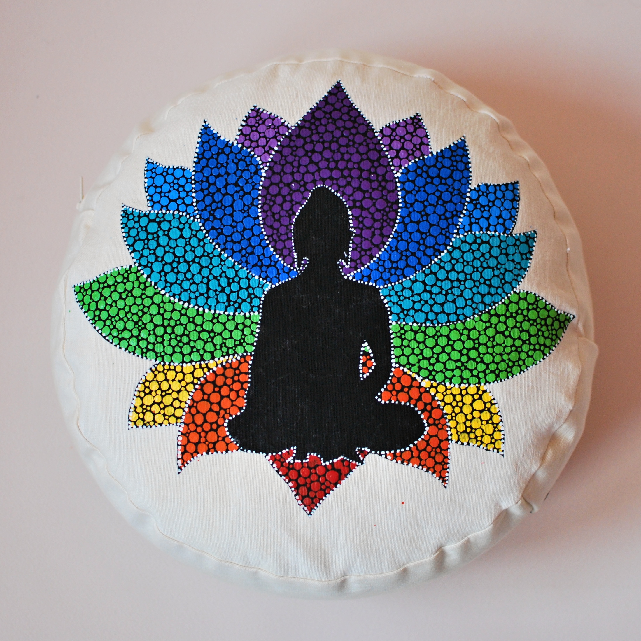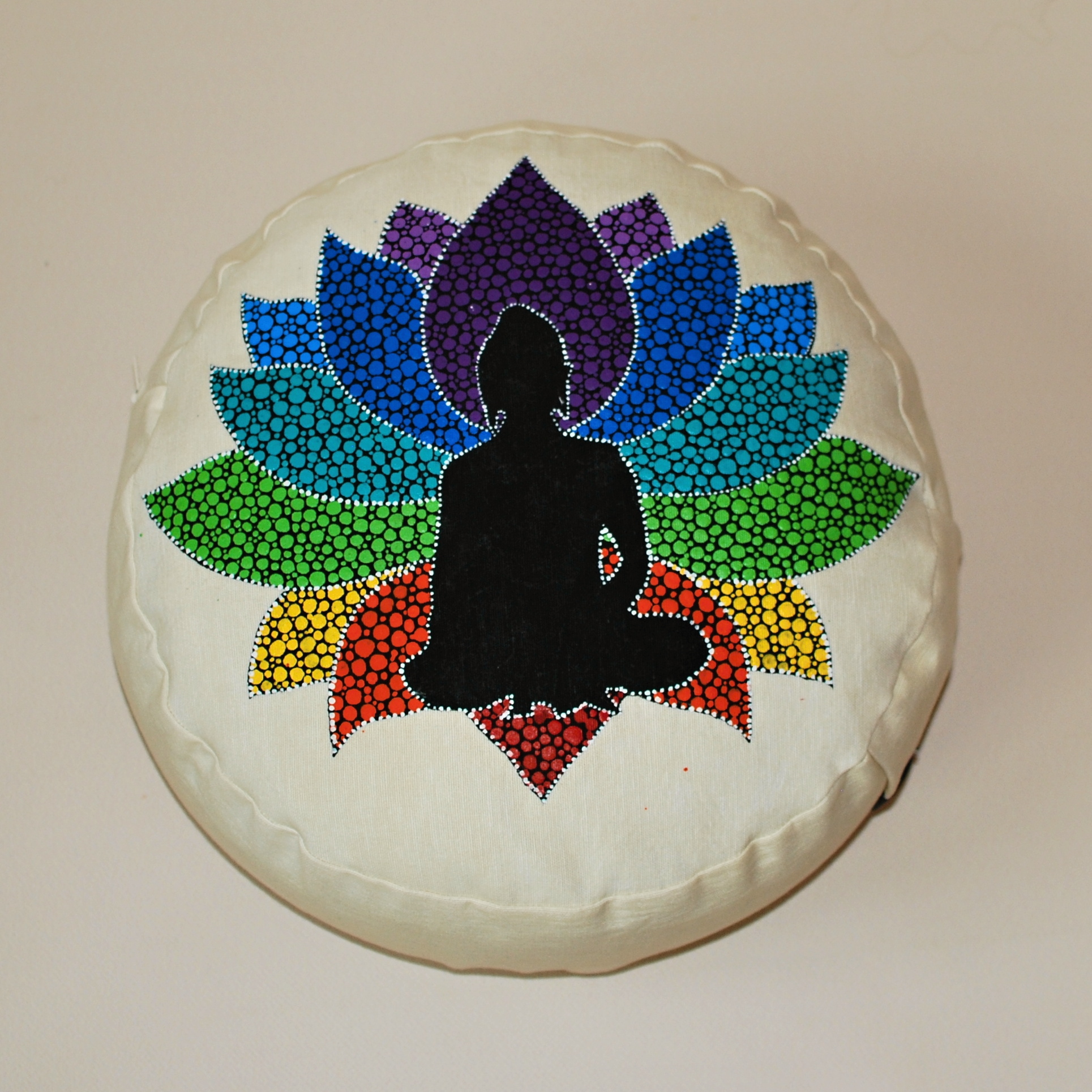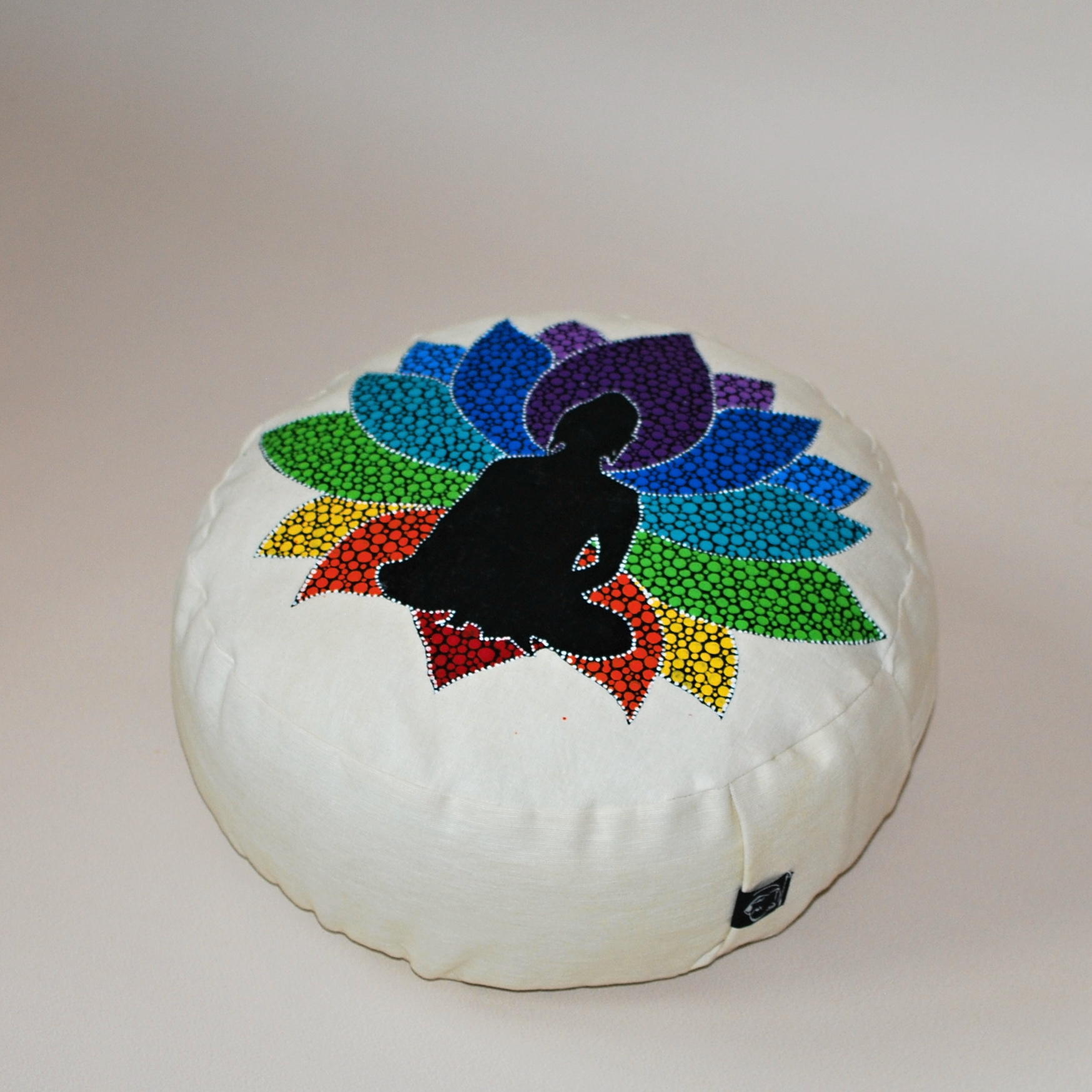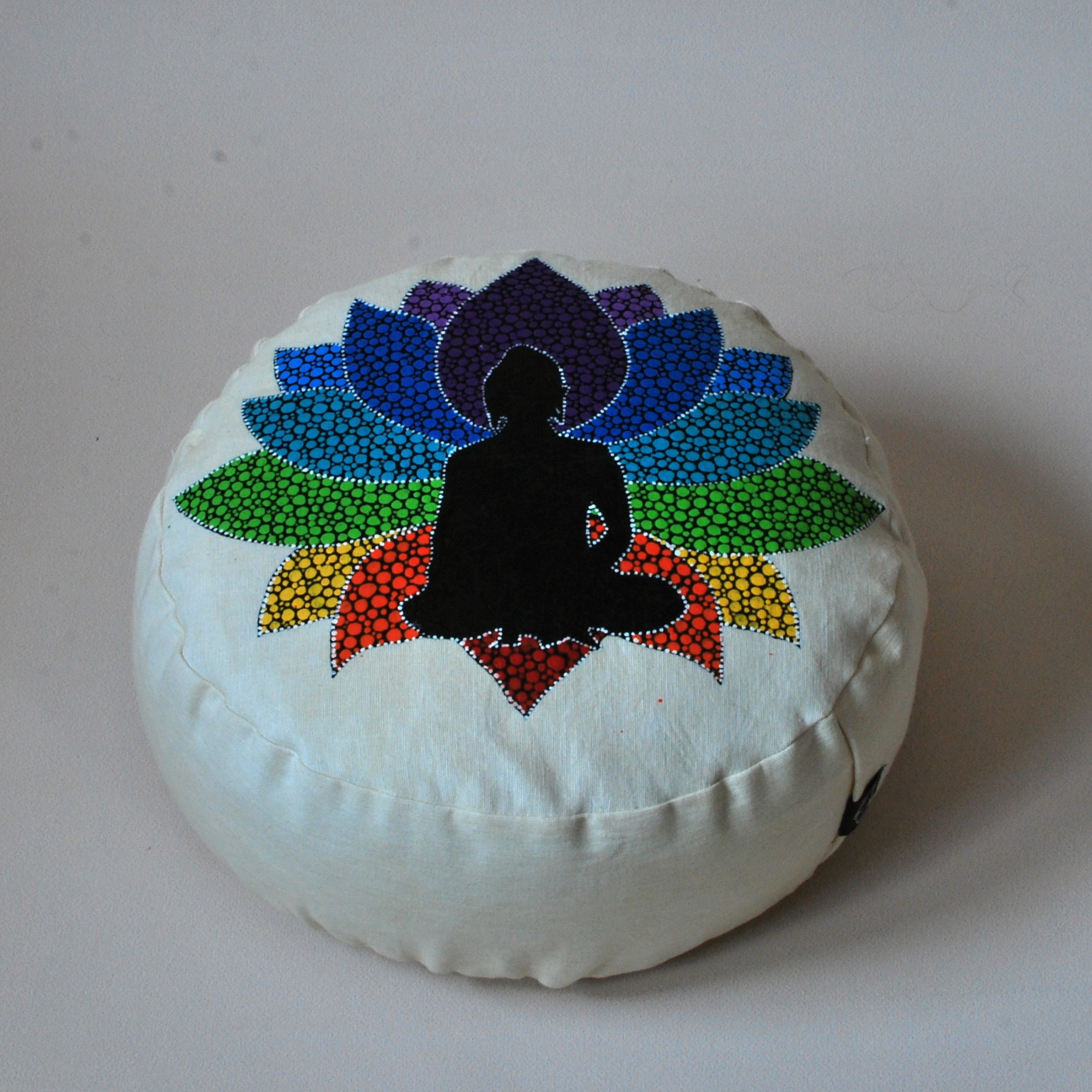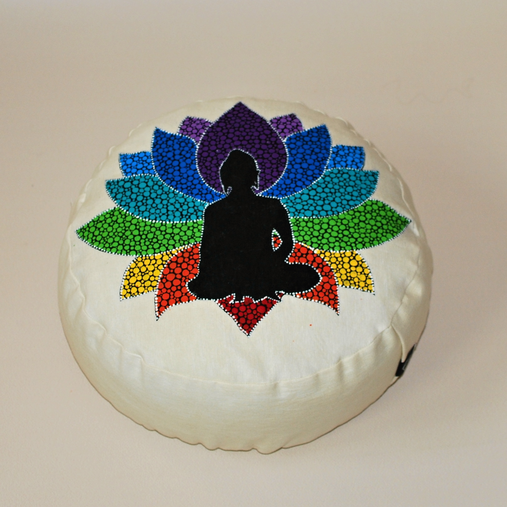Meditační polštář v krémovém provedení s malbou. Vnější obal je ušitý z pevného bavlněného plátna se zapínáním na zip. Vnitřní obal je z tenké bavlněné látky, se zapínáním také na zip, aby bylo možné náplň snadno vyměnit. Malba i barvení kvalitními barvami na textil.