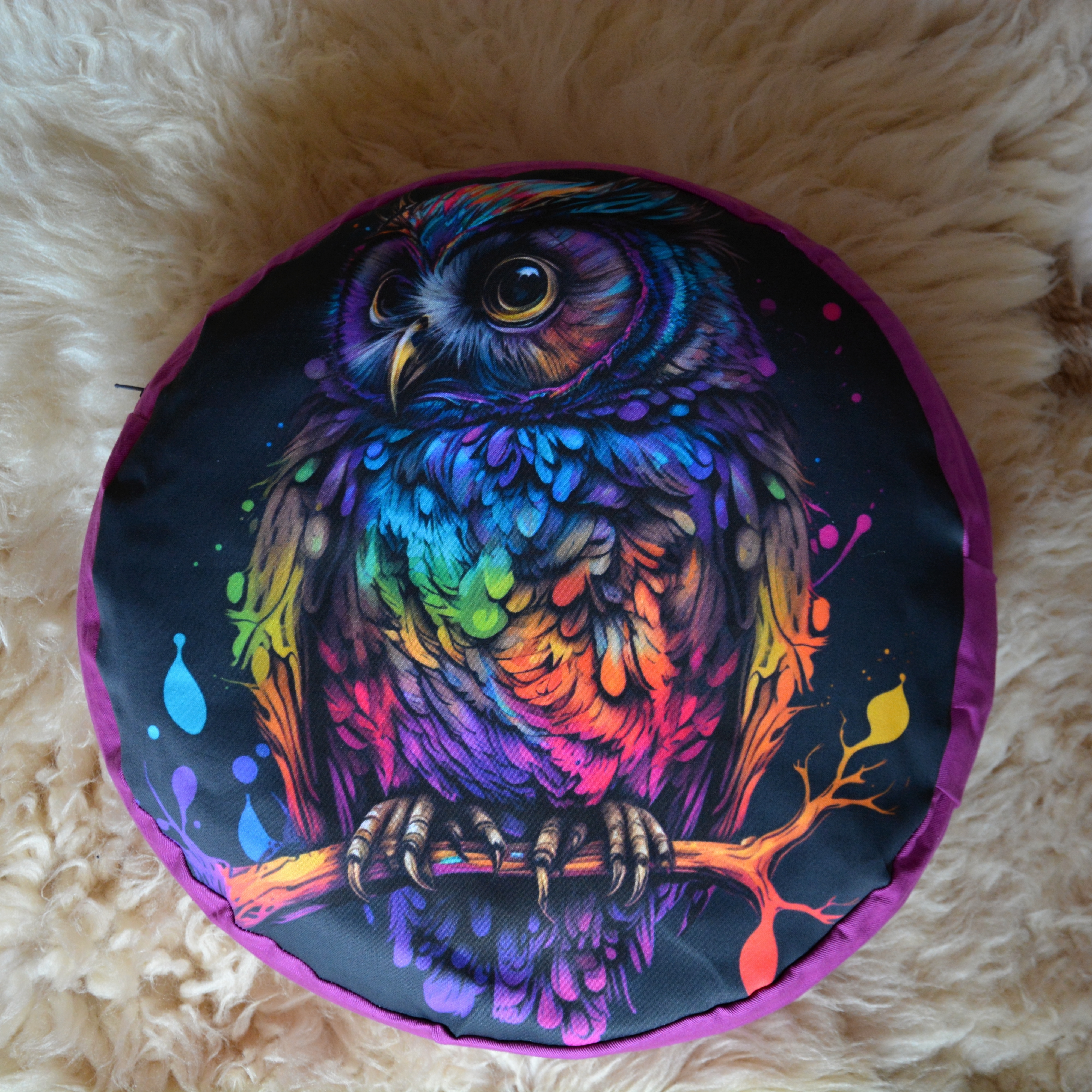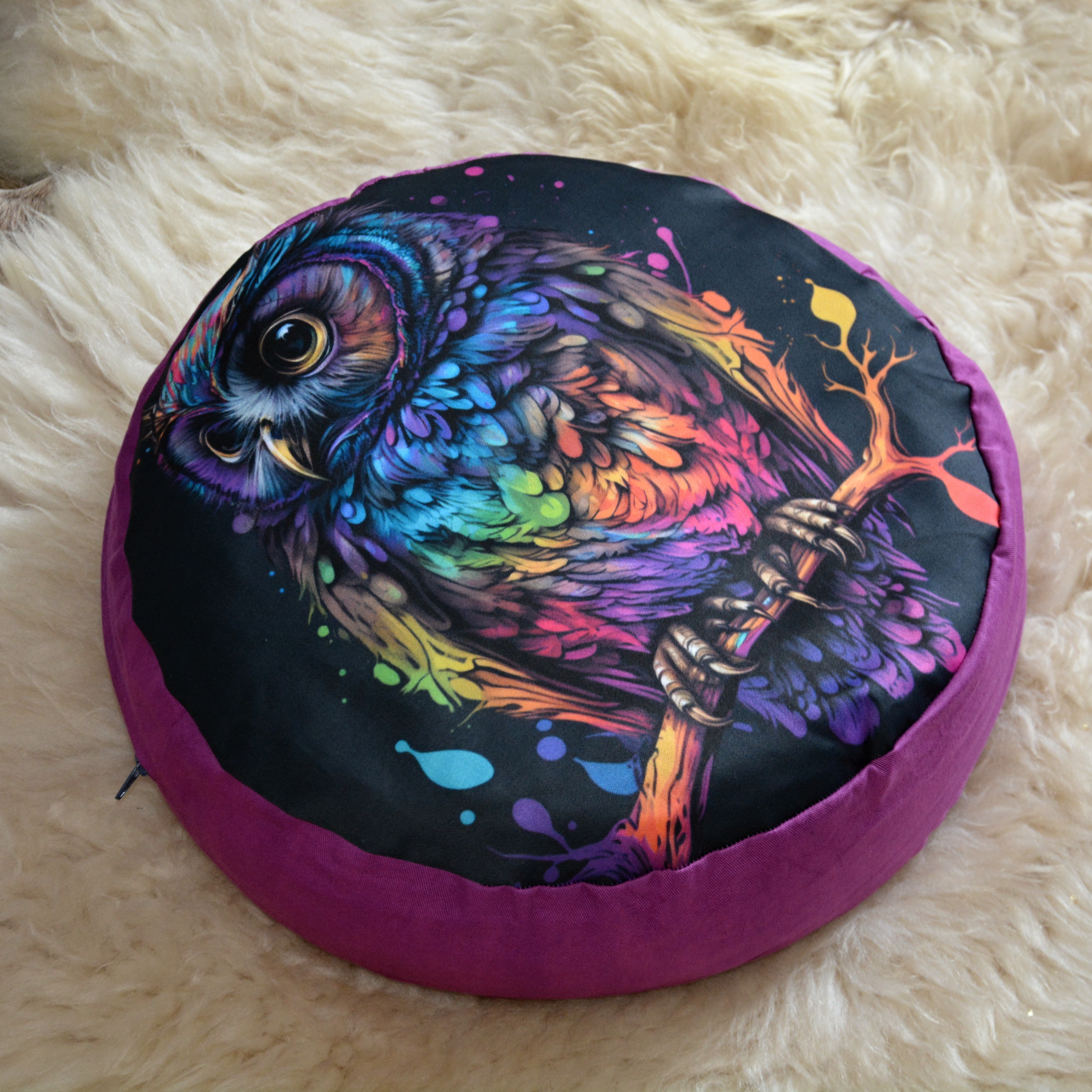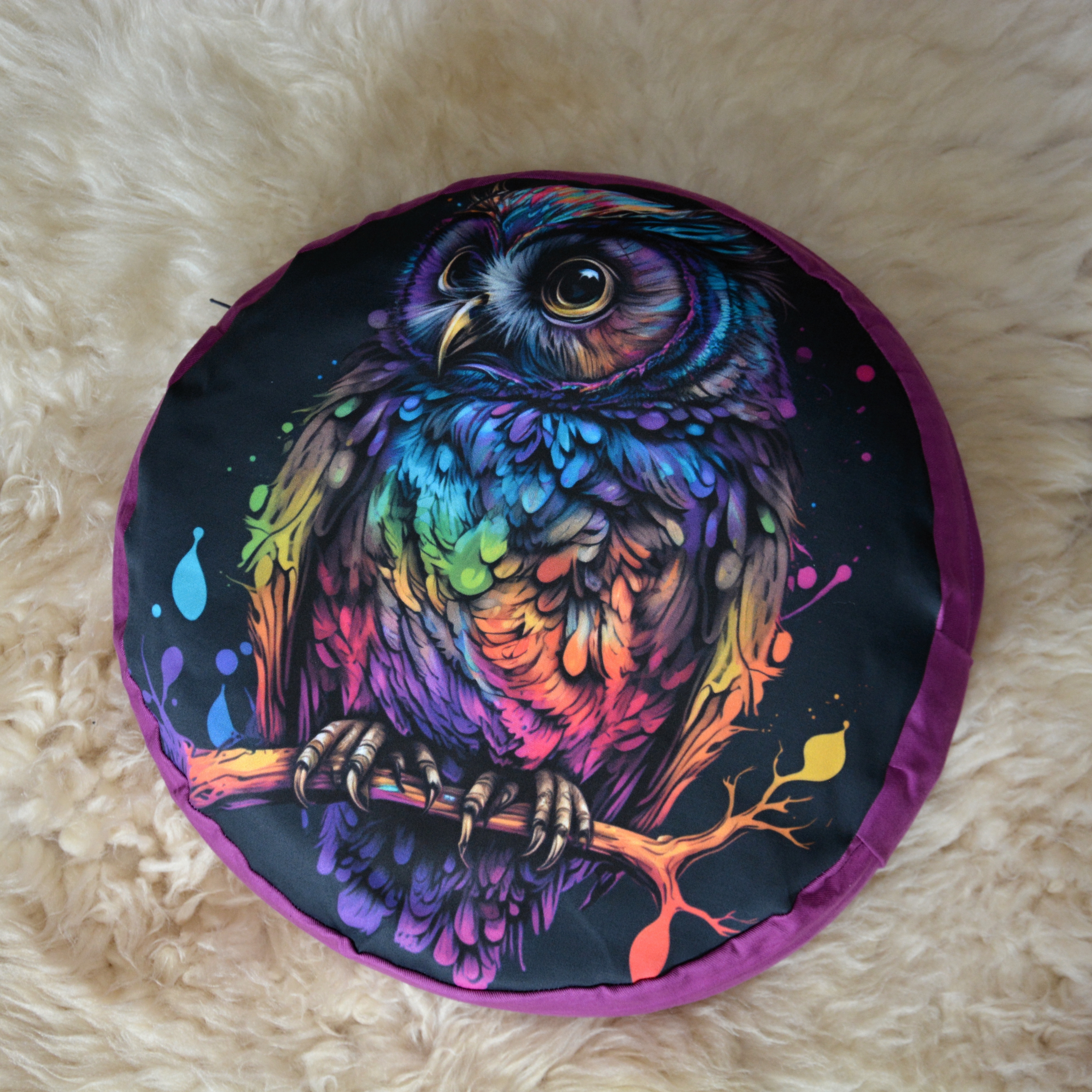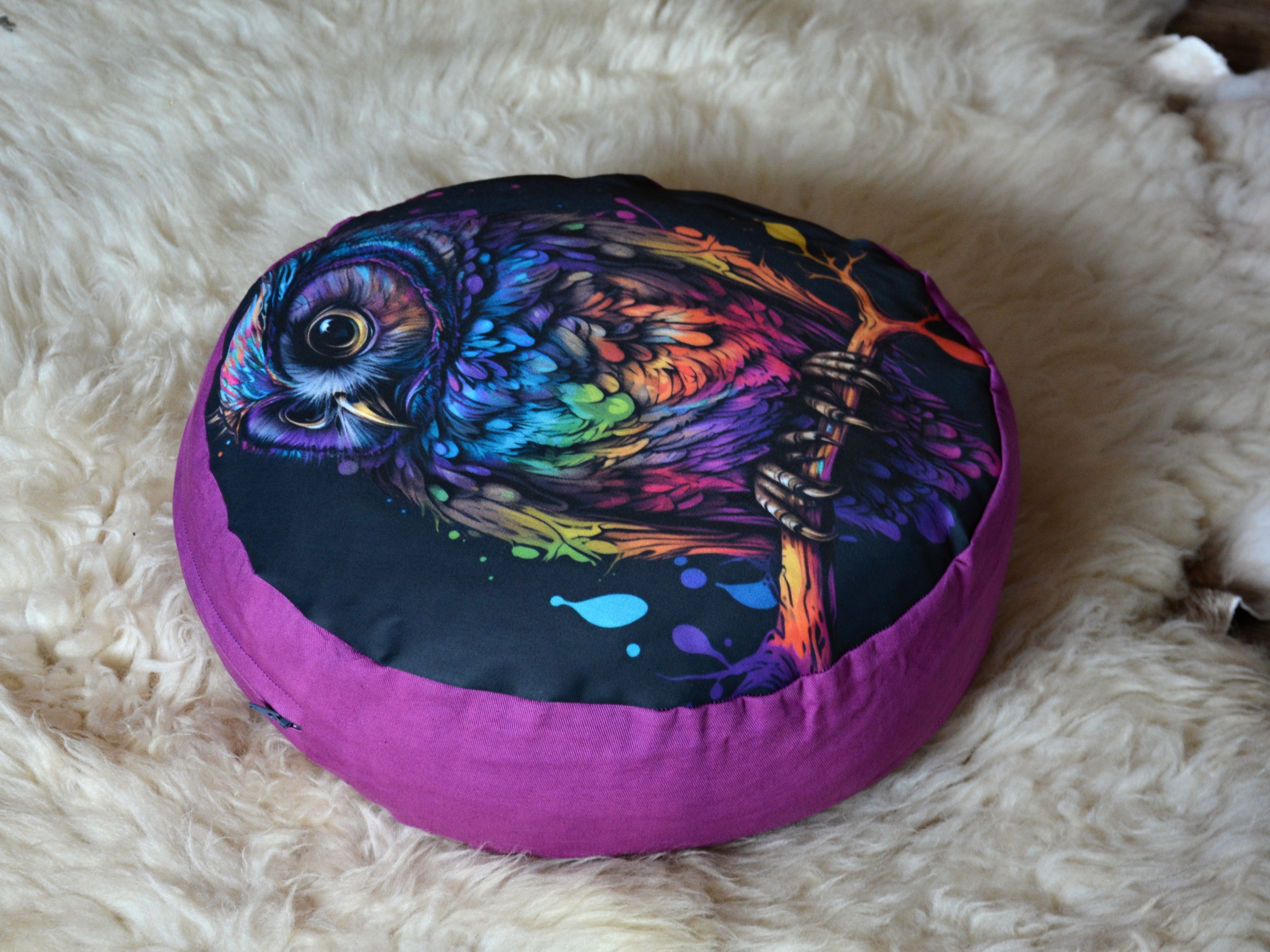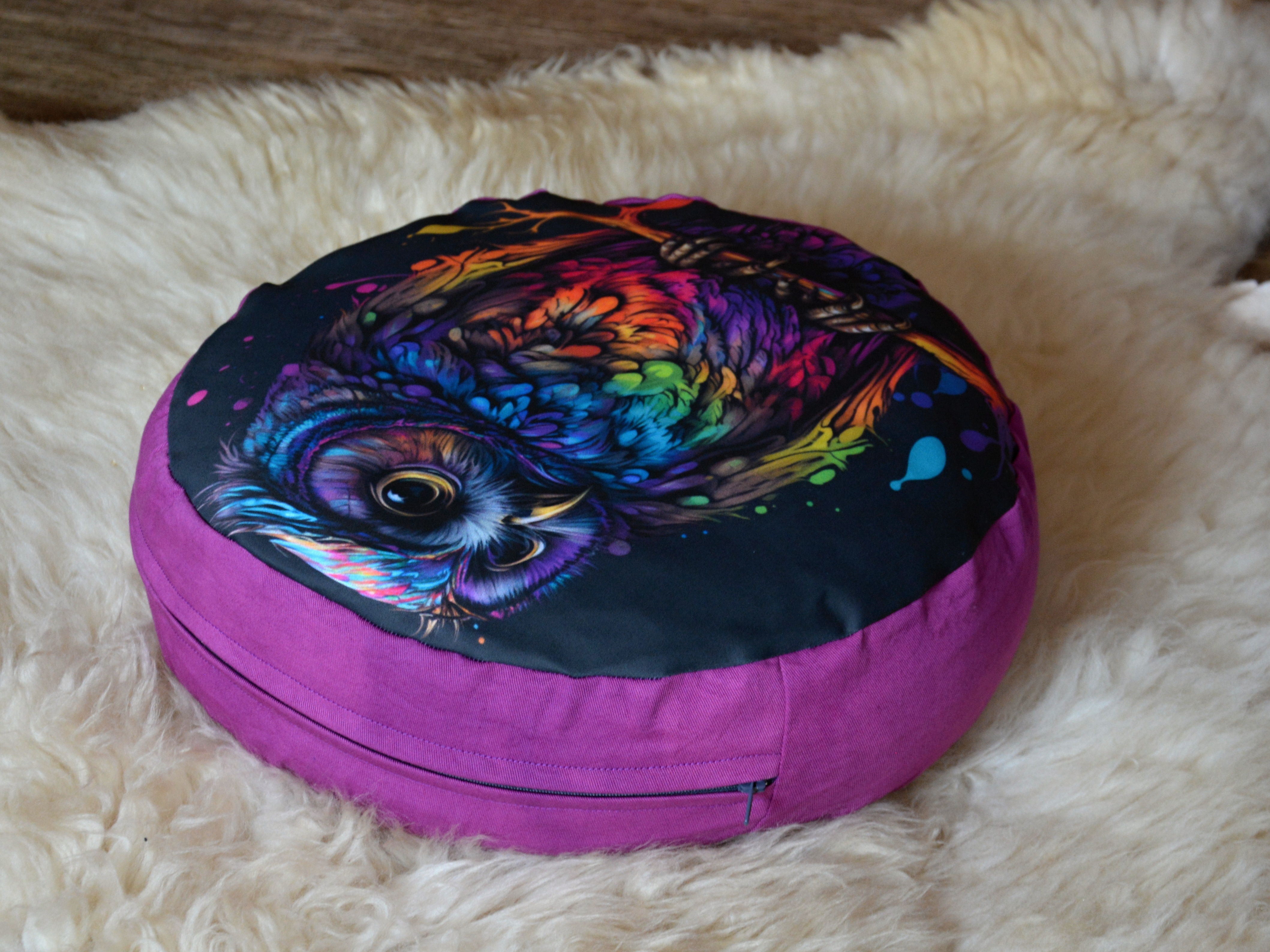 Meditační polštář s potiskem. Fialová část je 100% bavlna v pevné keprové vazbě, vrchní díl je pevné 100% bavlněné plátno s kvalitním potiskem.