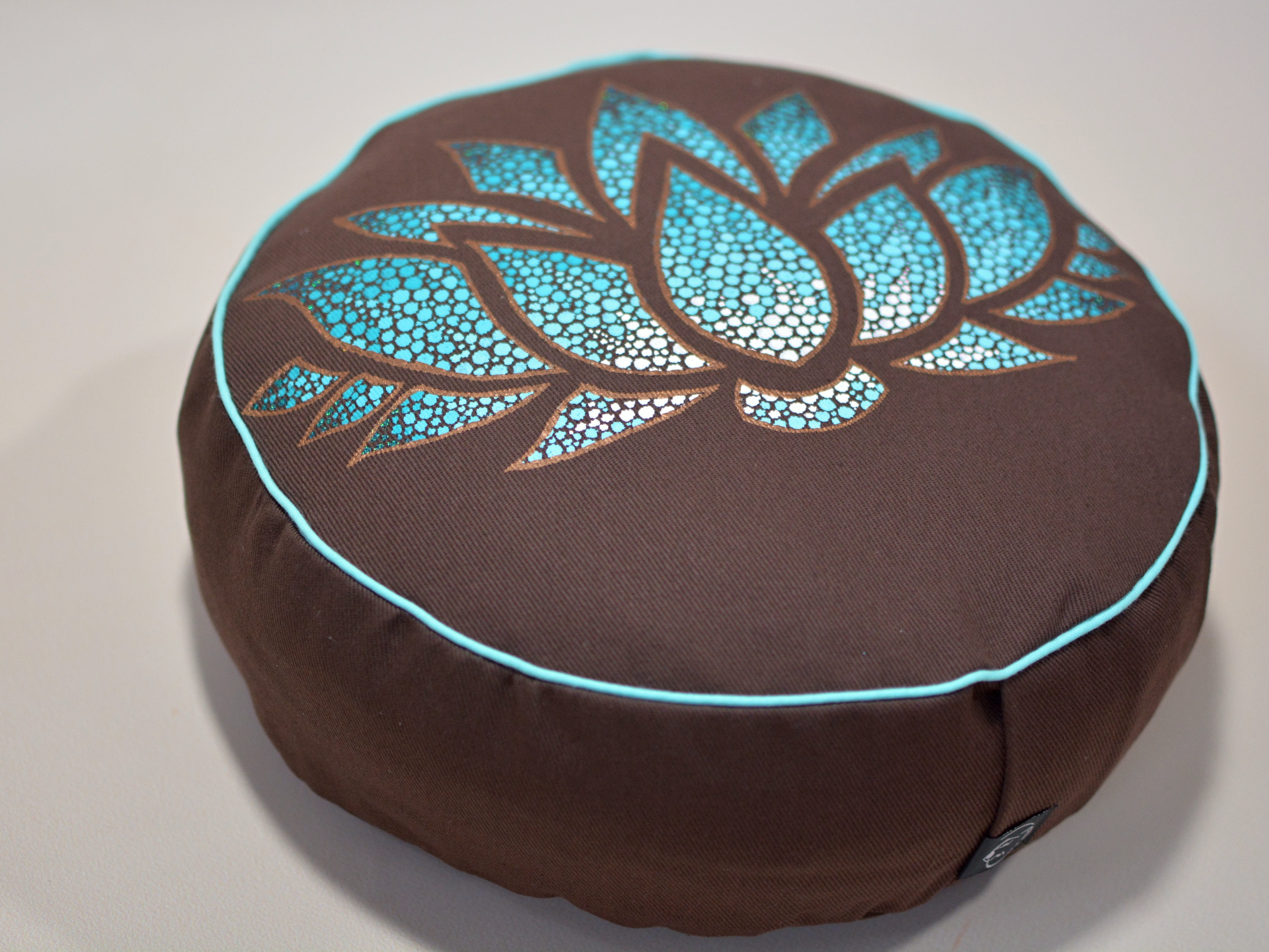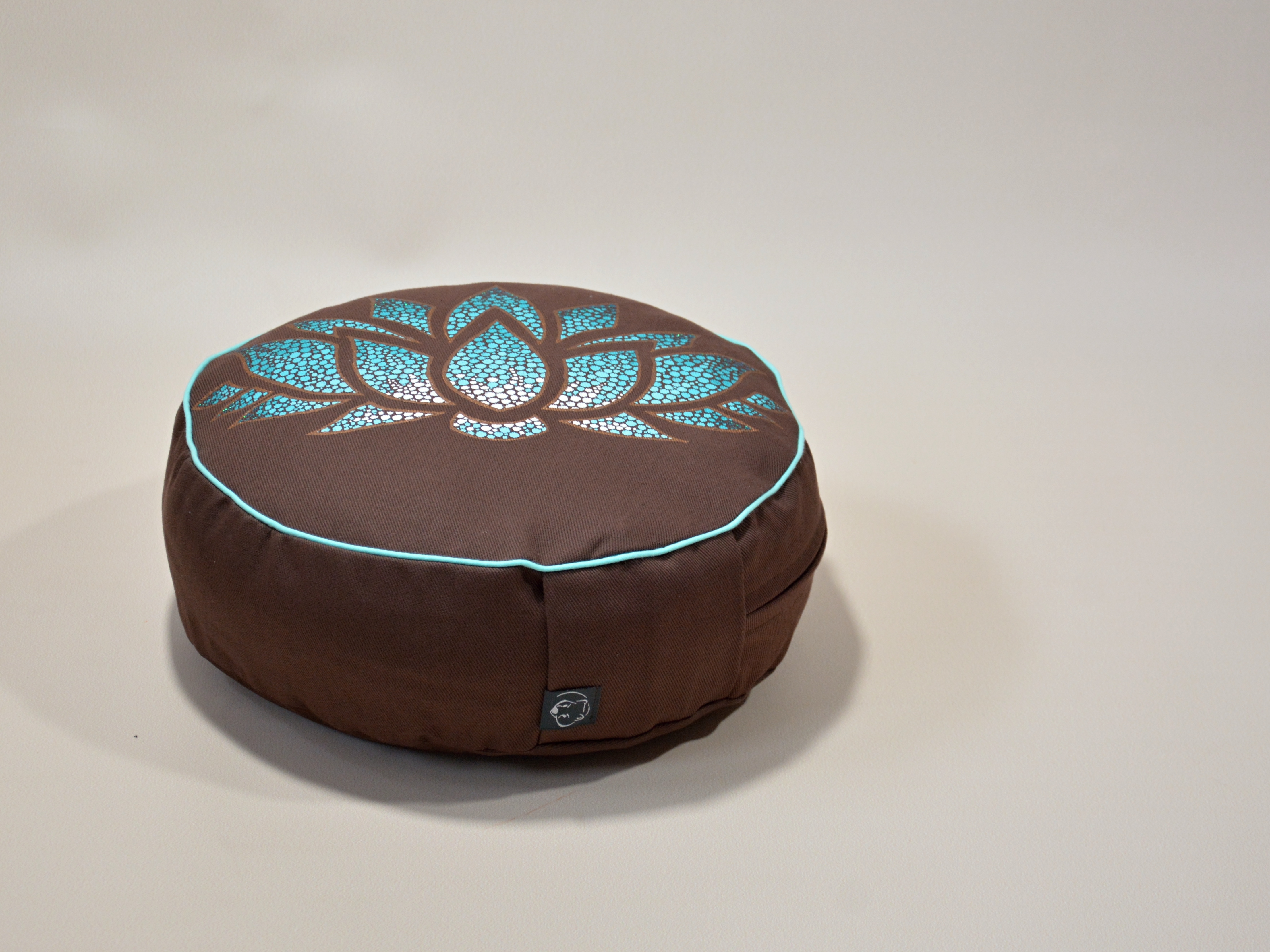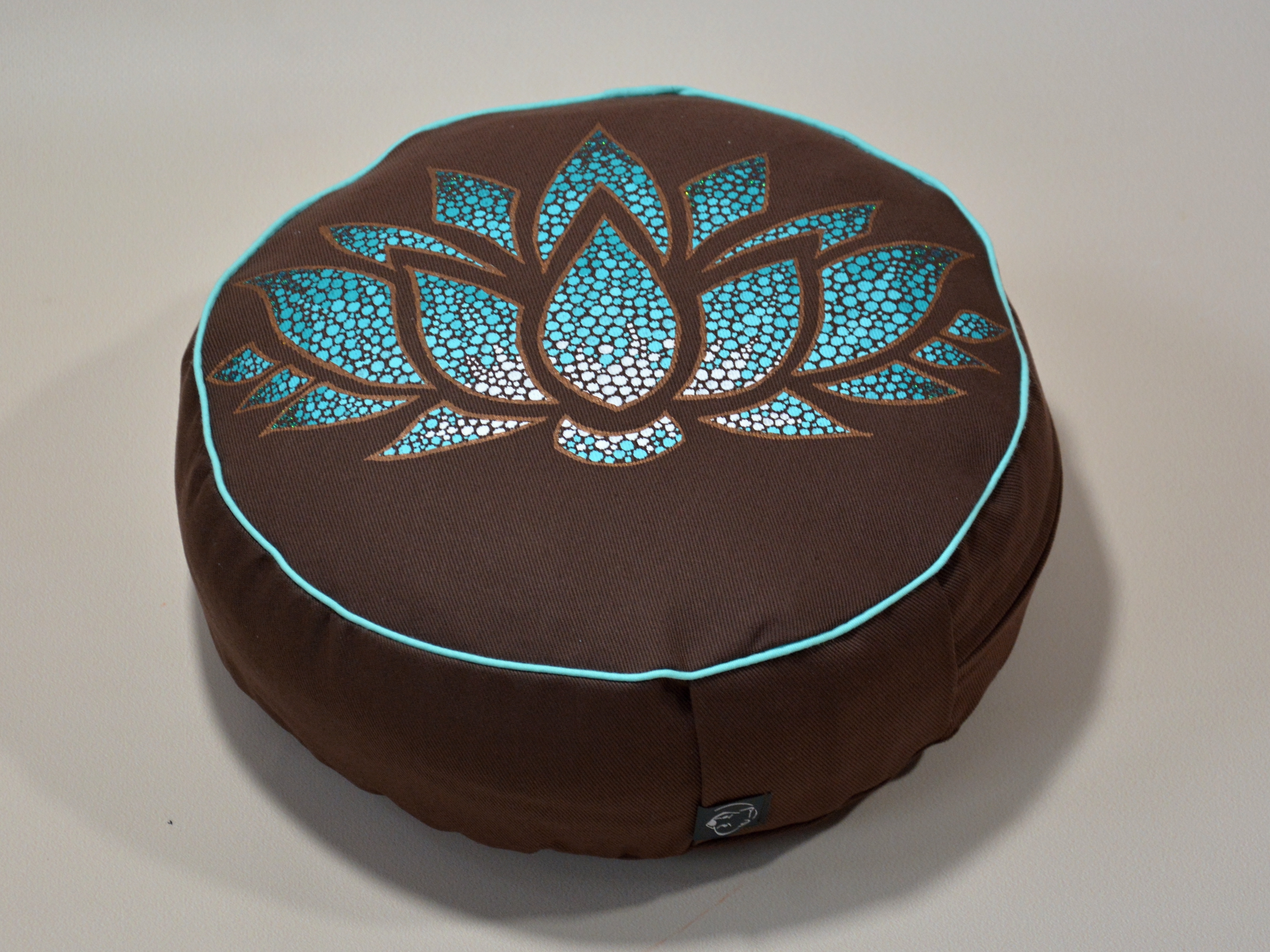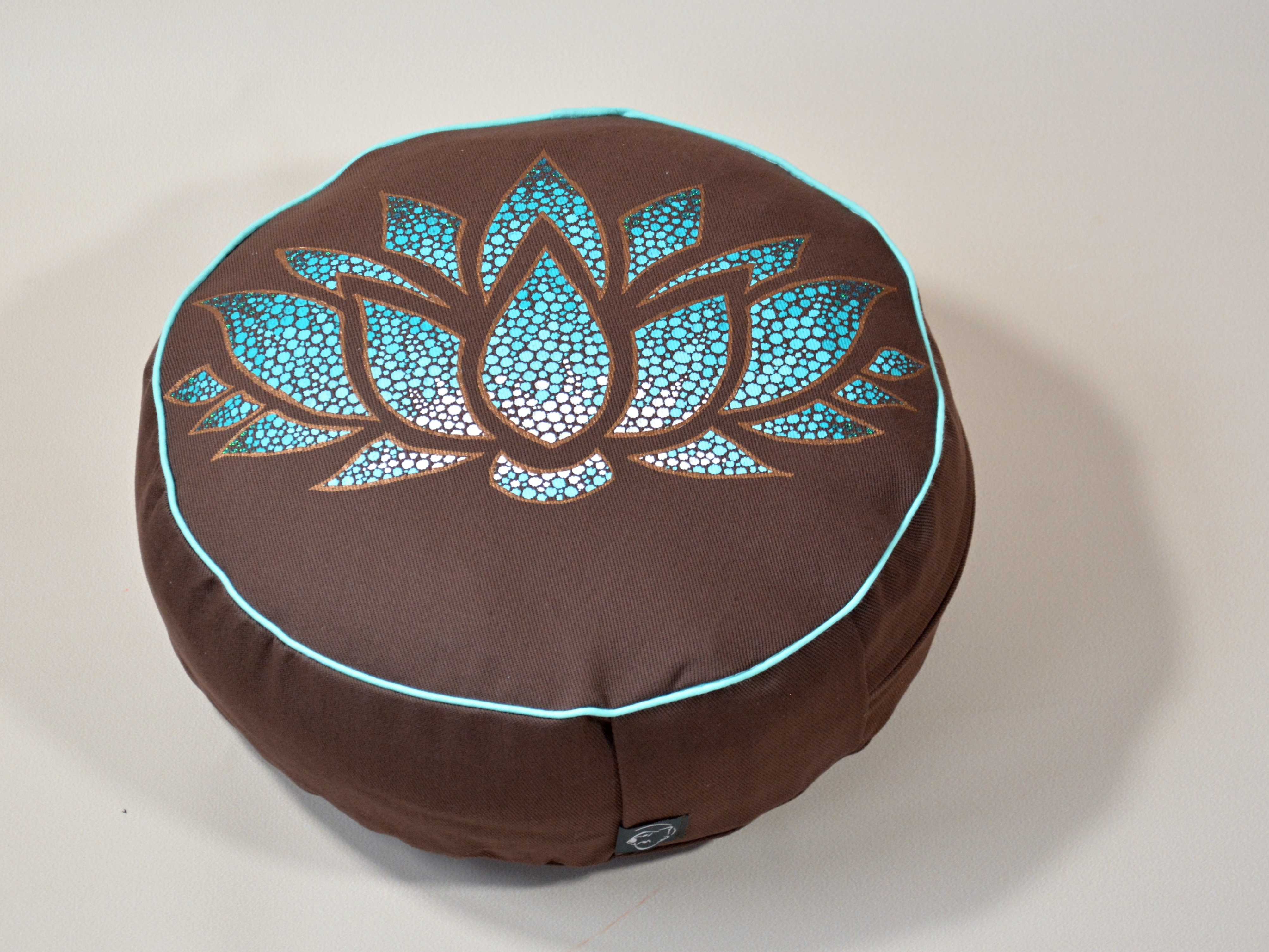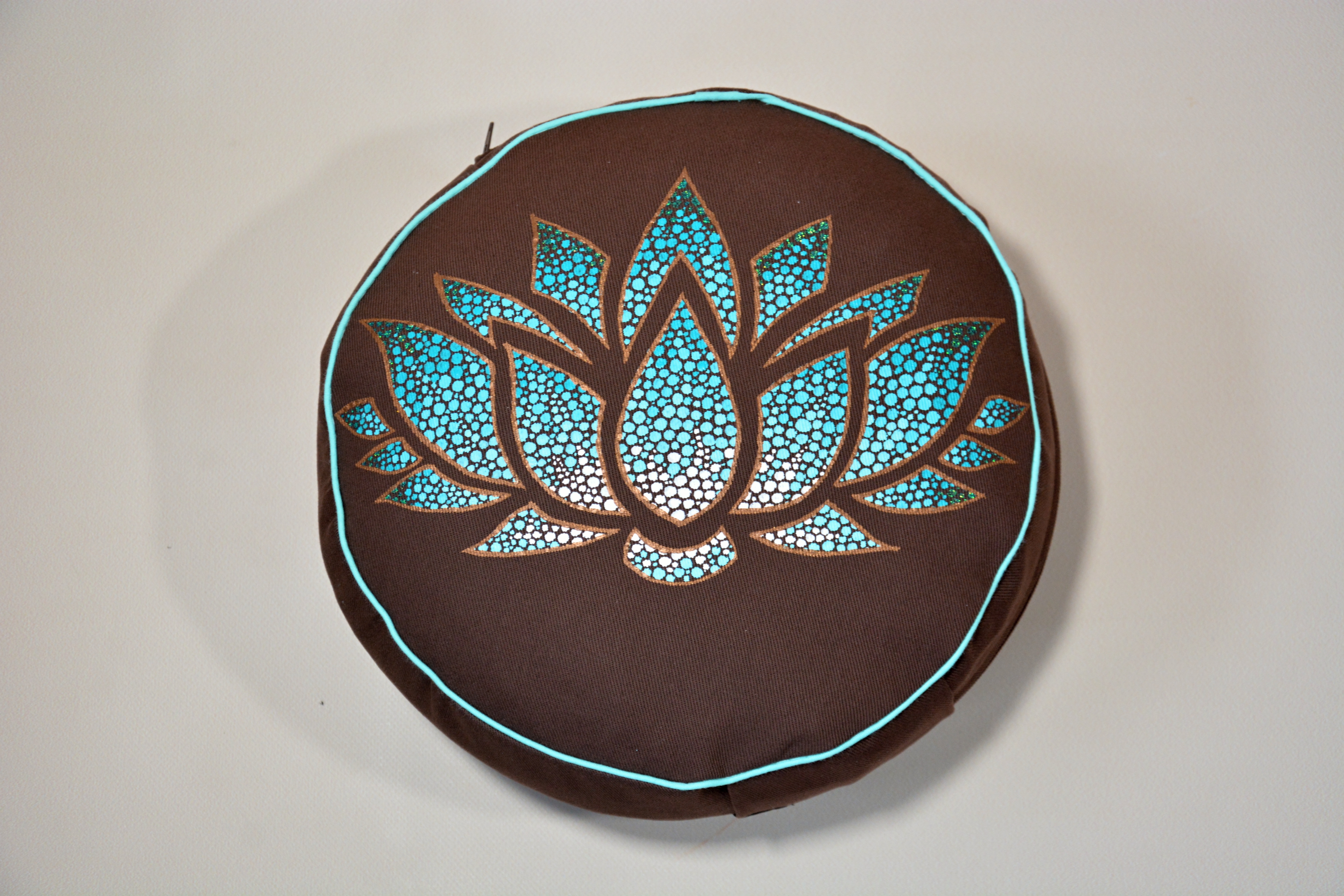 Meditační polštář v hnědém provedení a malbou v odstínech mátové a tyrkysové, obšitý ozdobnou paspulkou.