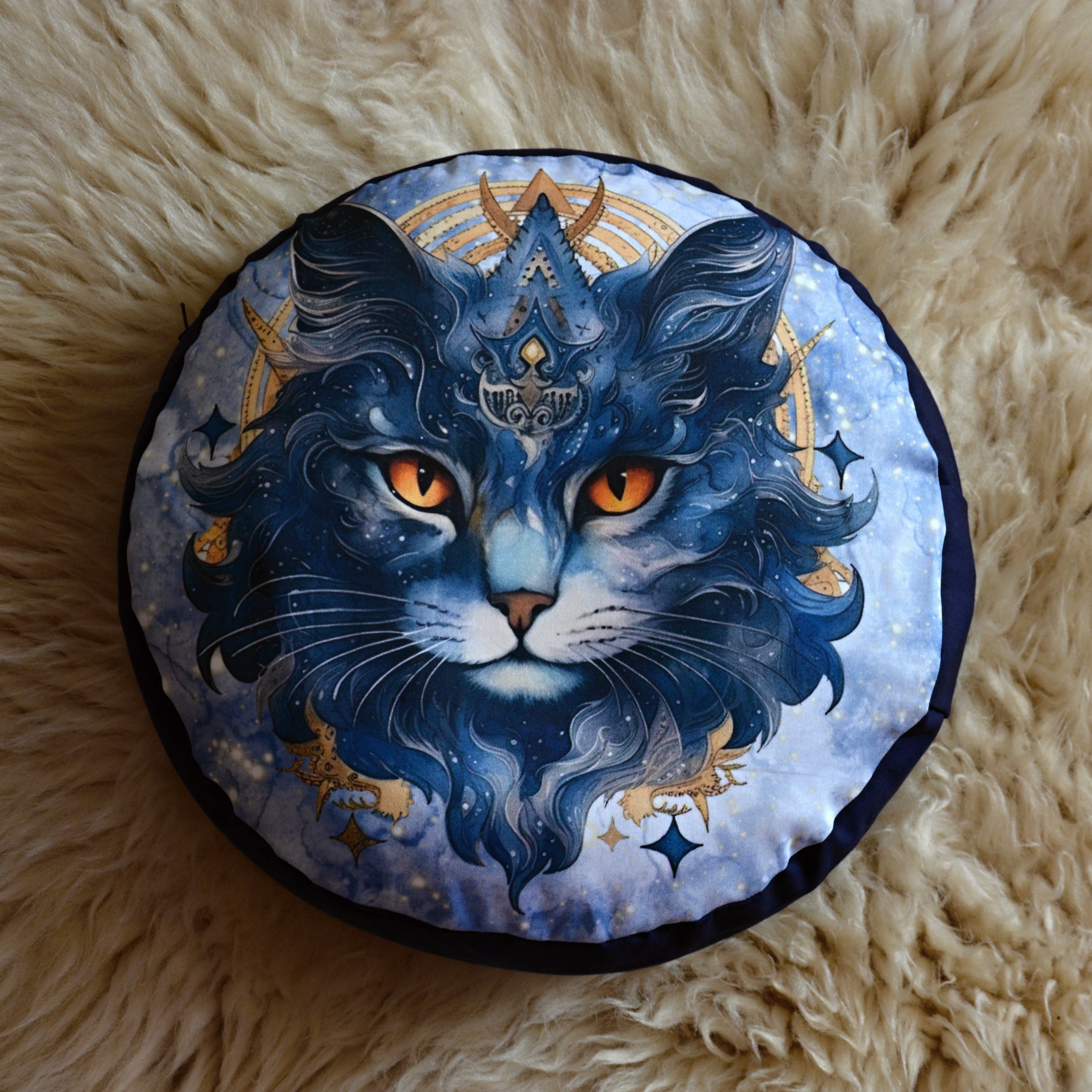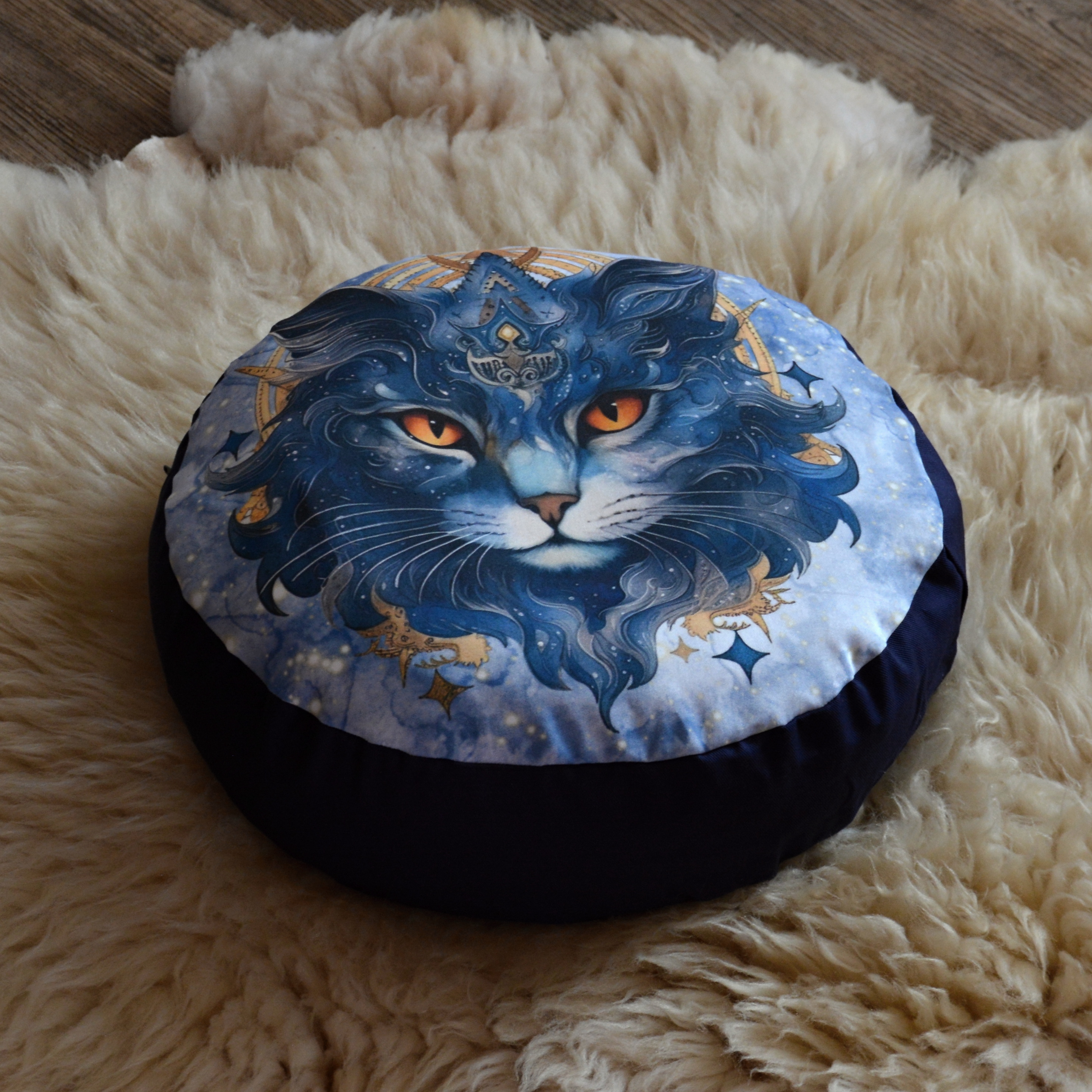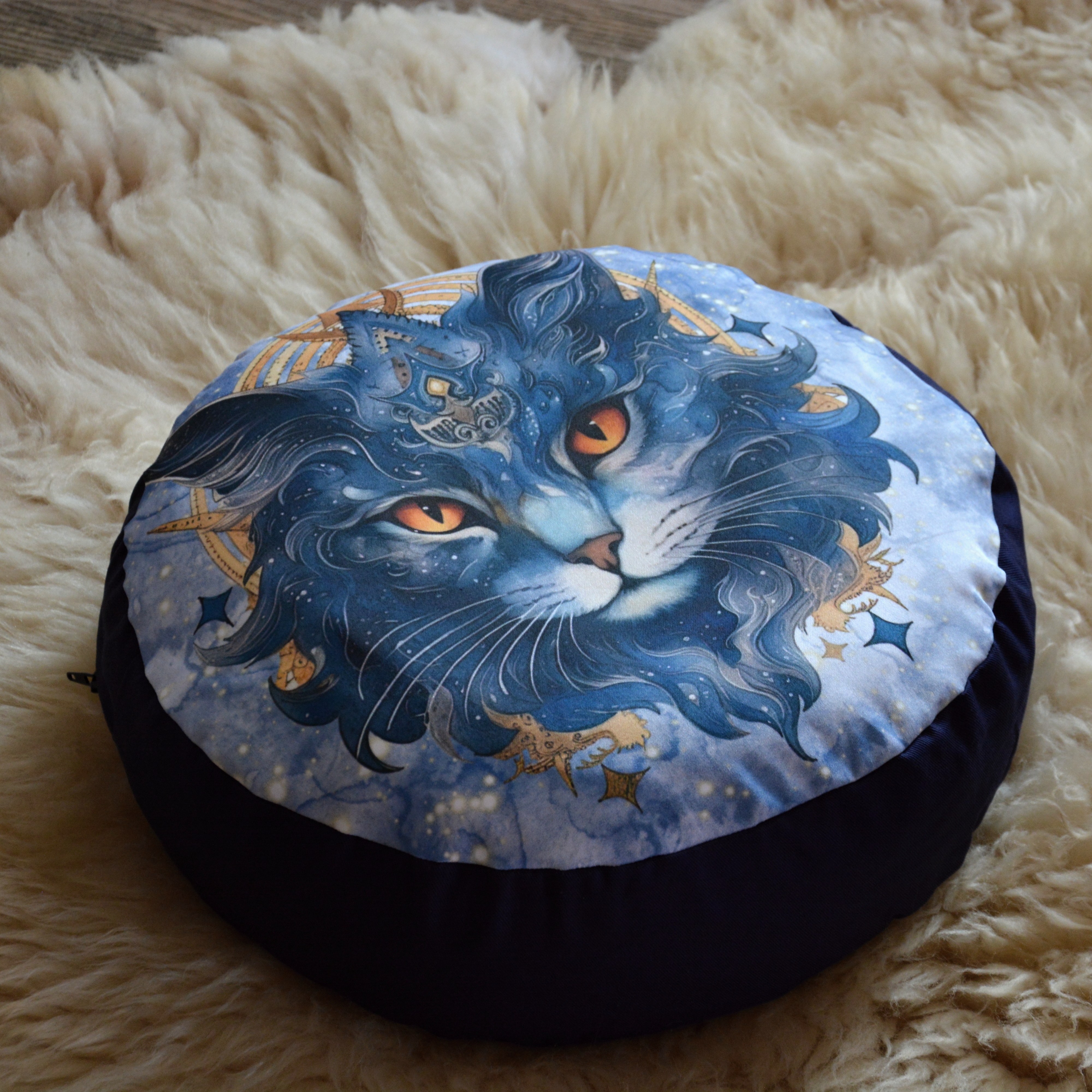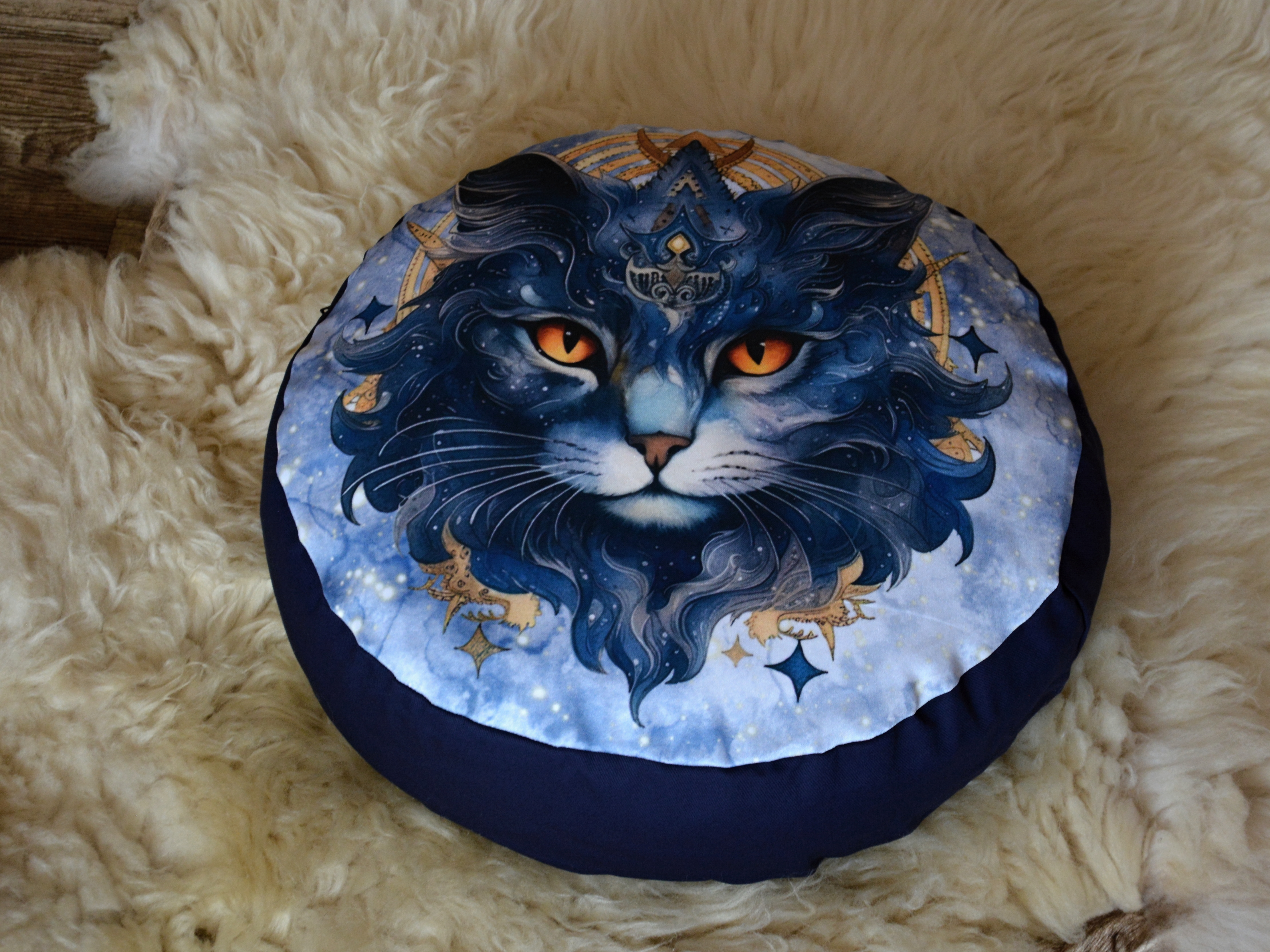 Meditační polštář s potiskem. Boky+spodní část je 100% bavlna v pevné keprové vazbě, v barvě tmavě modré. Vrchní díl je pevné 100% bavlněné plátno s kvalitním potiskem.