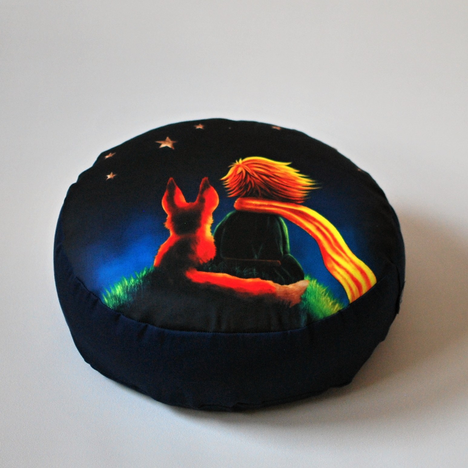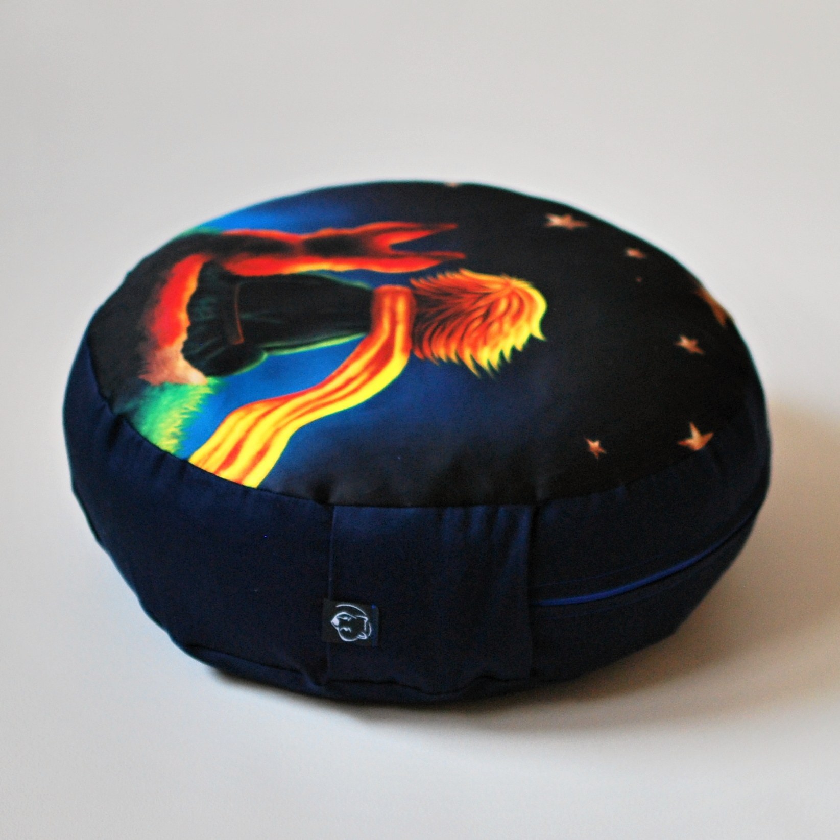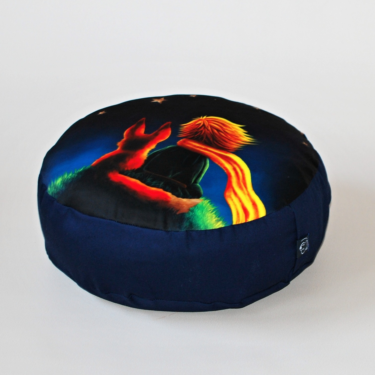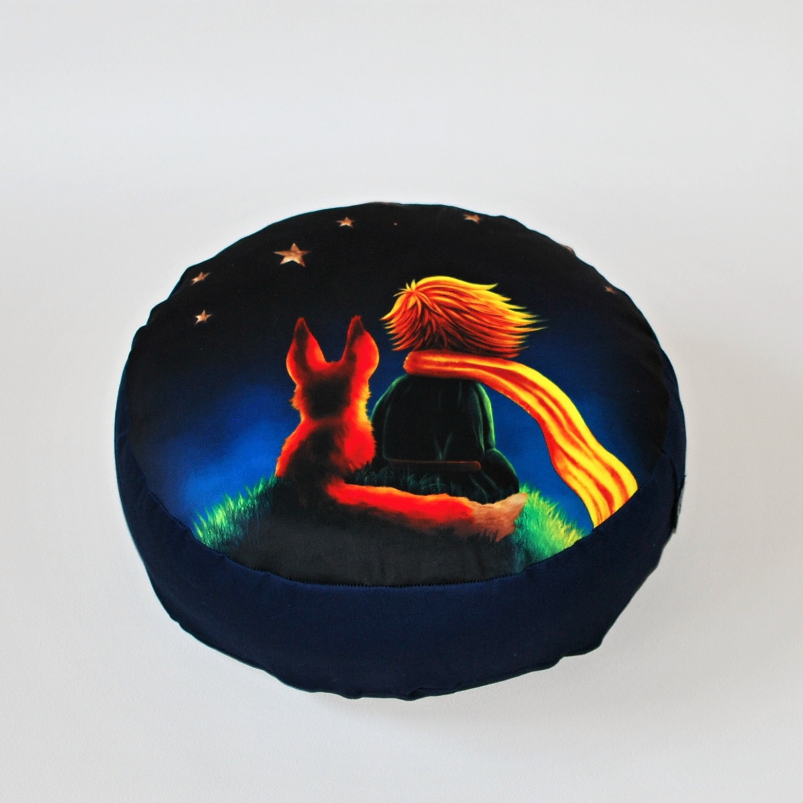 Meditační polštář s krásným potiskem na motivy malého Prince, grafika od autorky Eleny Schweitzer. Tmavě modrá část (boky+spodní část) je 100% bavlna v pevné keprové vazbě, vrchní díl je pevné 100% bavlněné plátno s kvalitním potiskem.