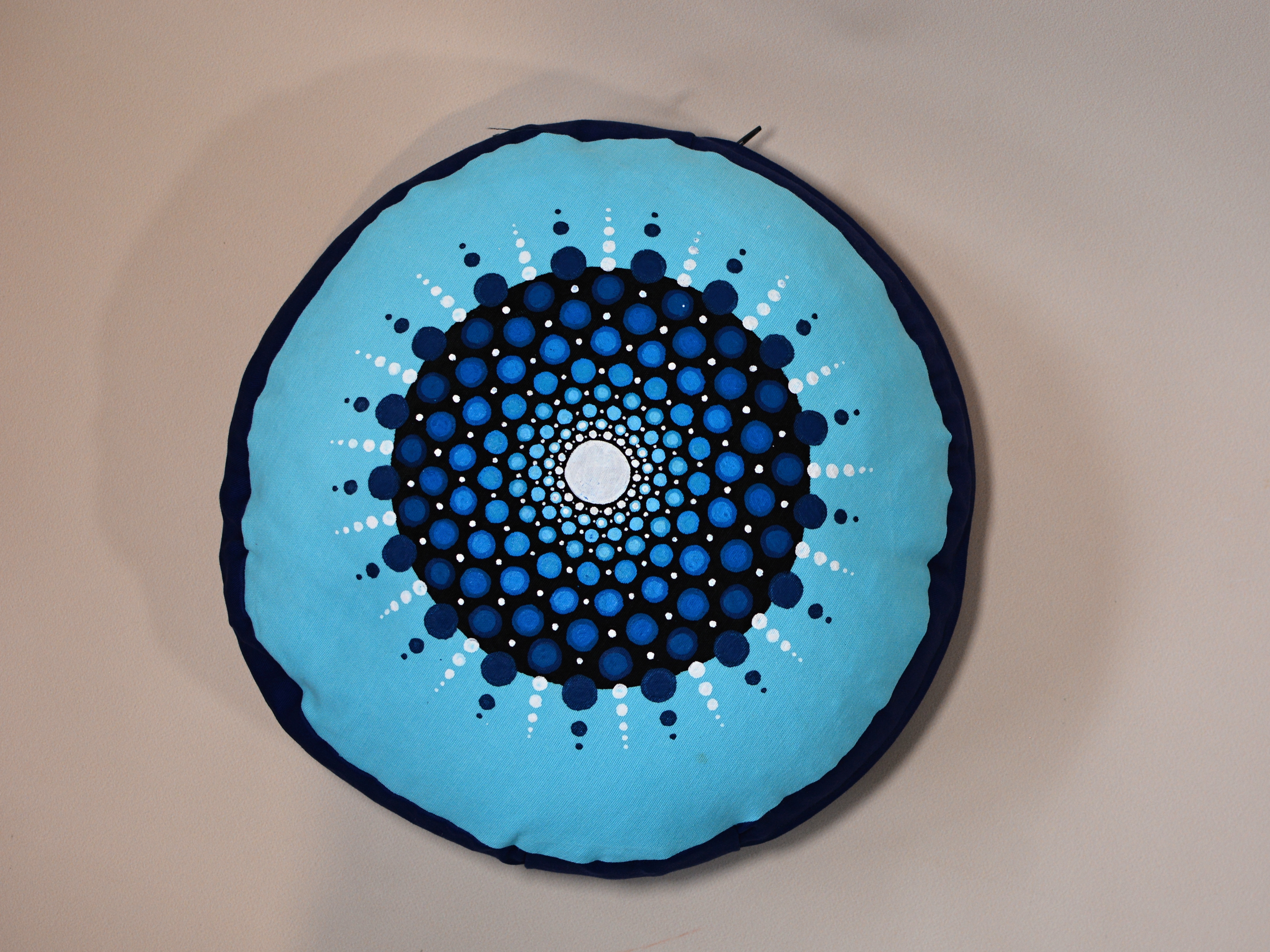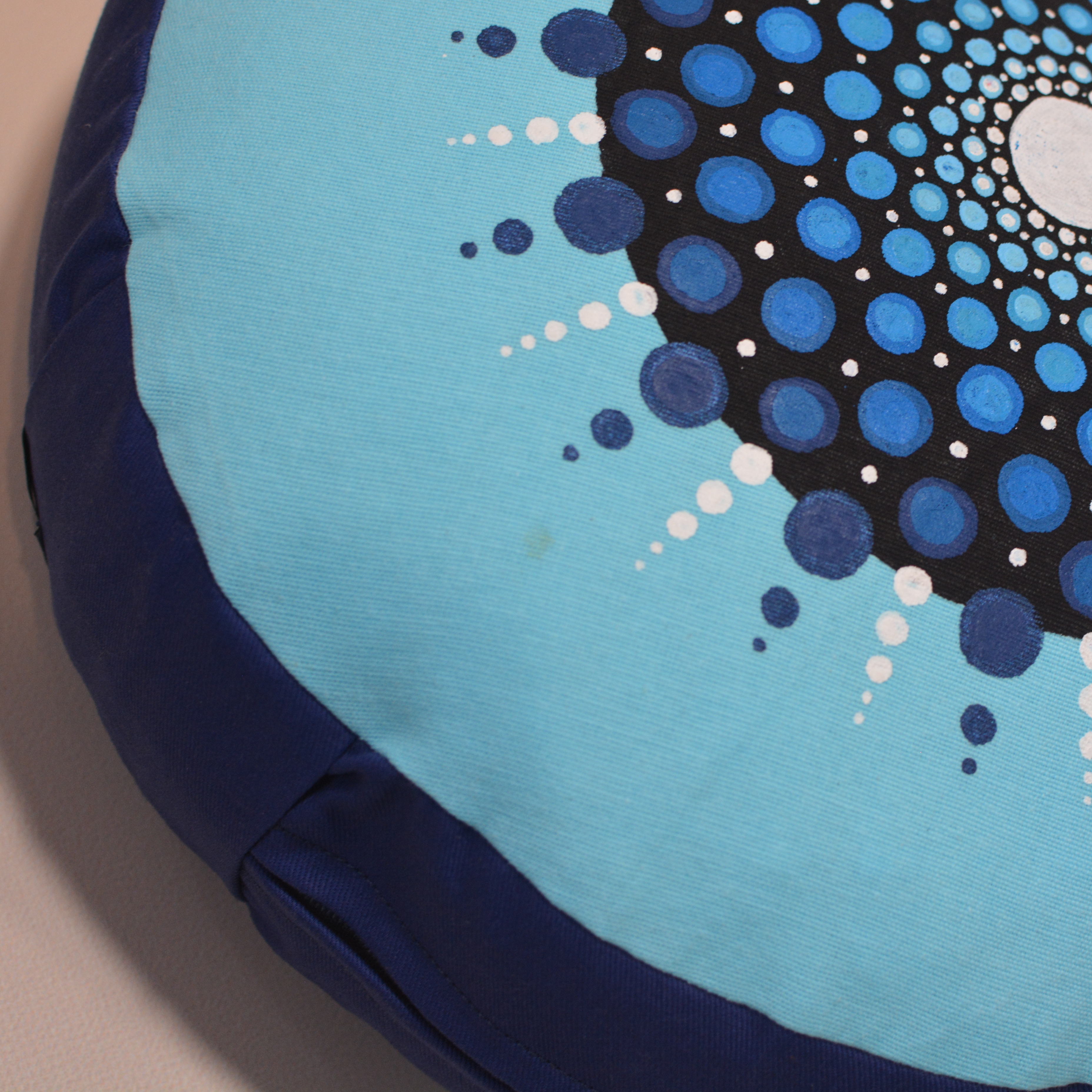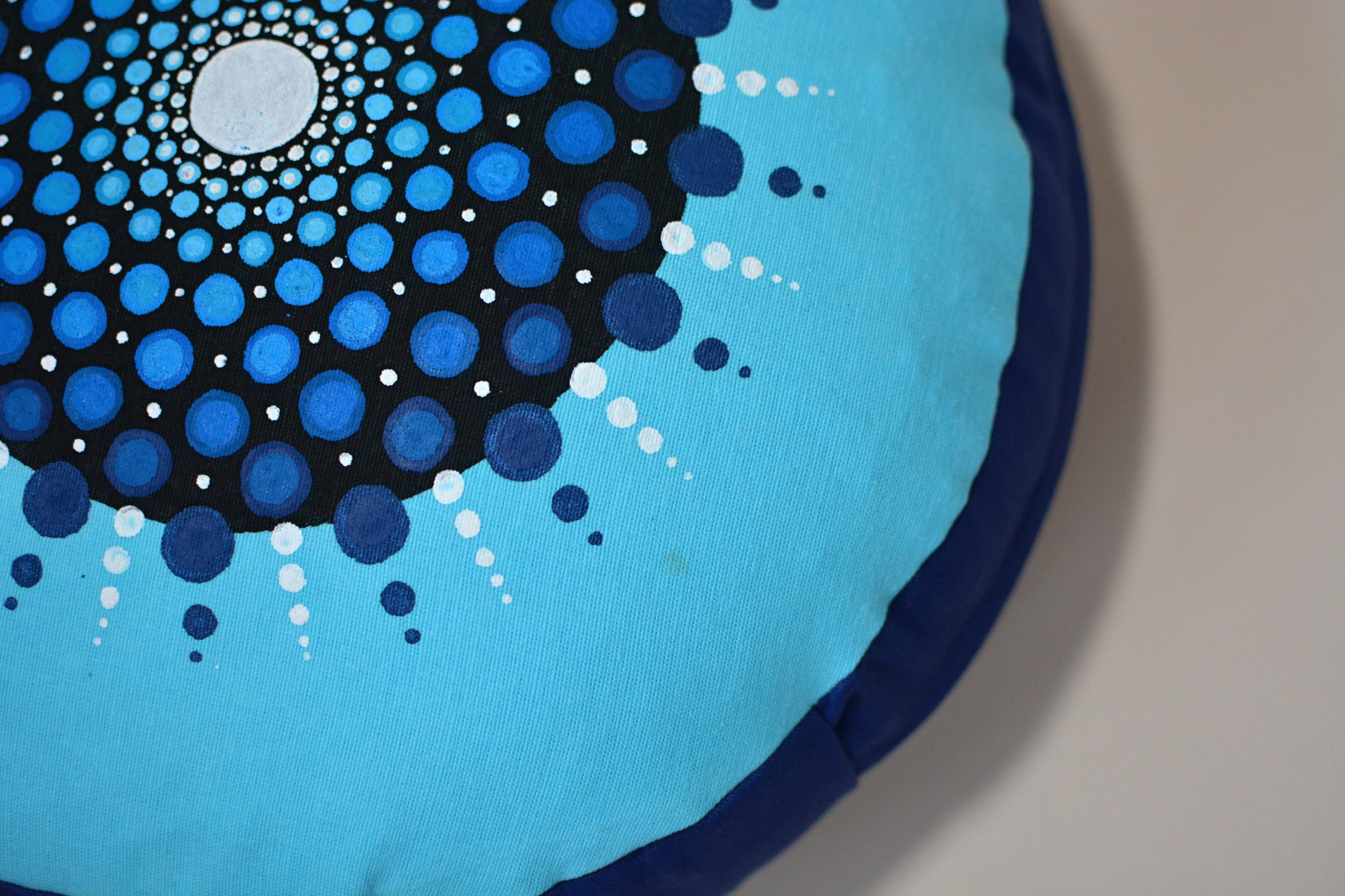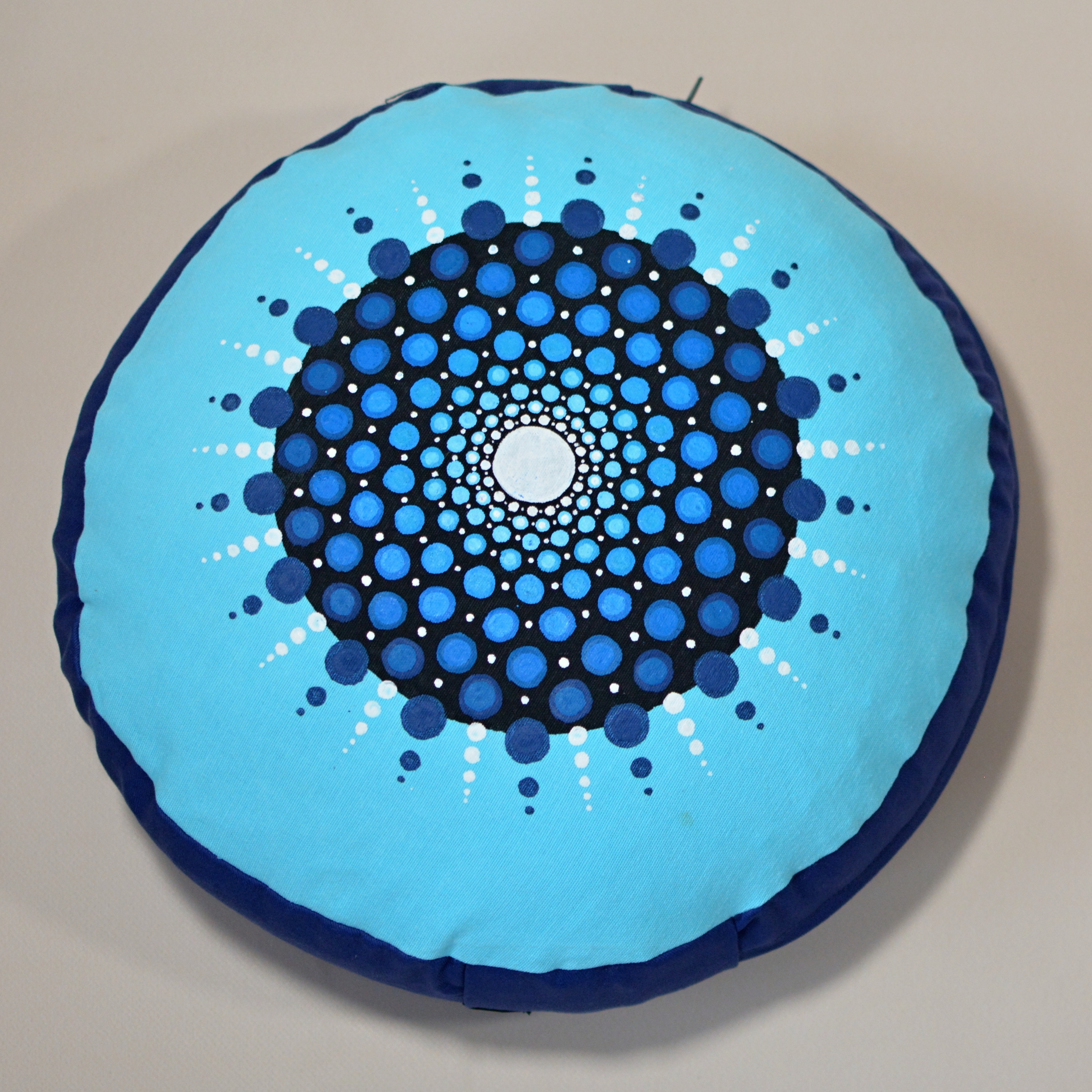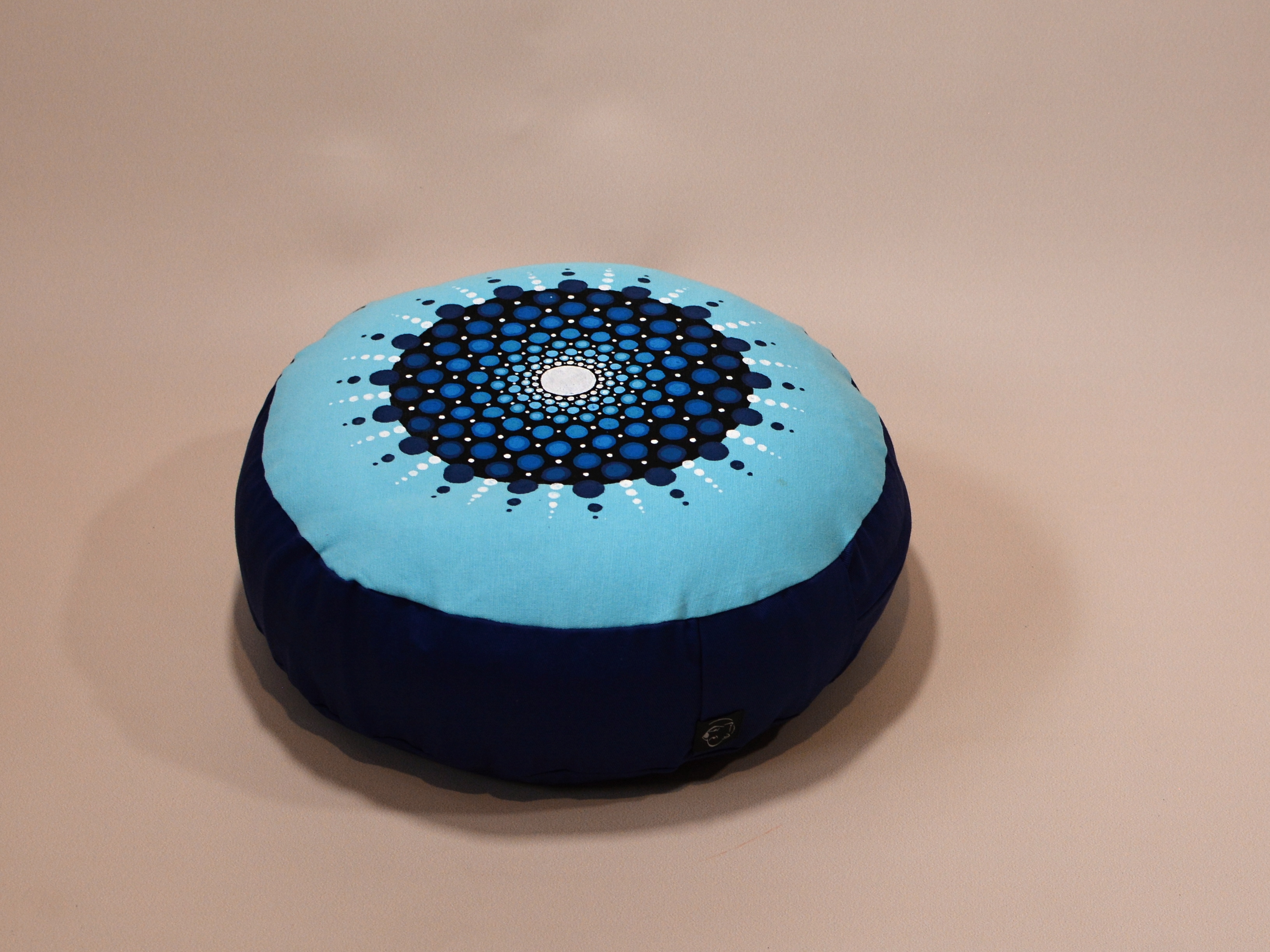 Meditační polštář modrém provedení s malbou. Vnější obal je ušitý z pevného bavlněného plátna se zapínáním na zip. Vnitřní obal je z tenké bavlněné látky, se zapínáním také na zip, aby bylo možné náplň snadno vyměnit. Malba i barvení kvalitními barvami na textil.