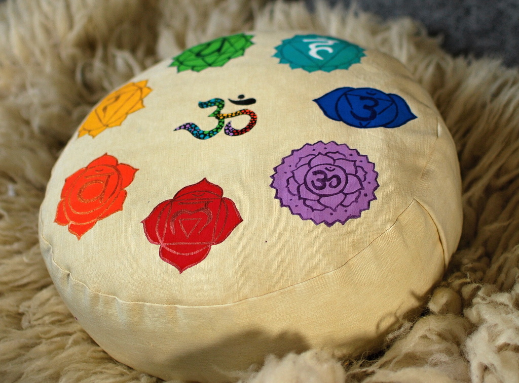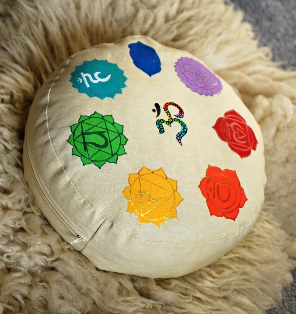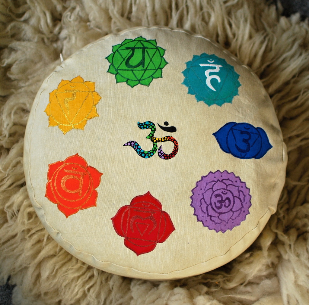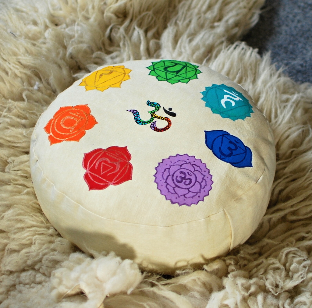 Meditační polštář v krémové barvě s ruční malbou - všech sedm čaker a symbol Ohm ve středu.