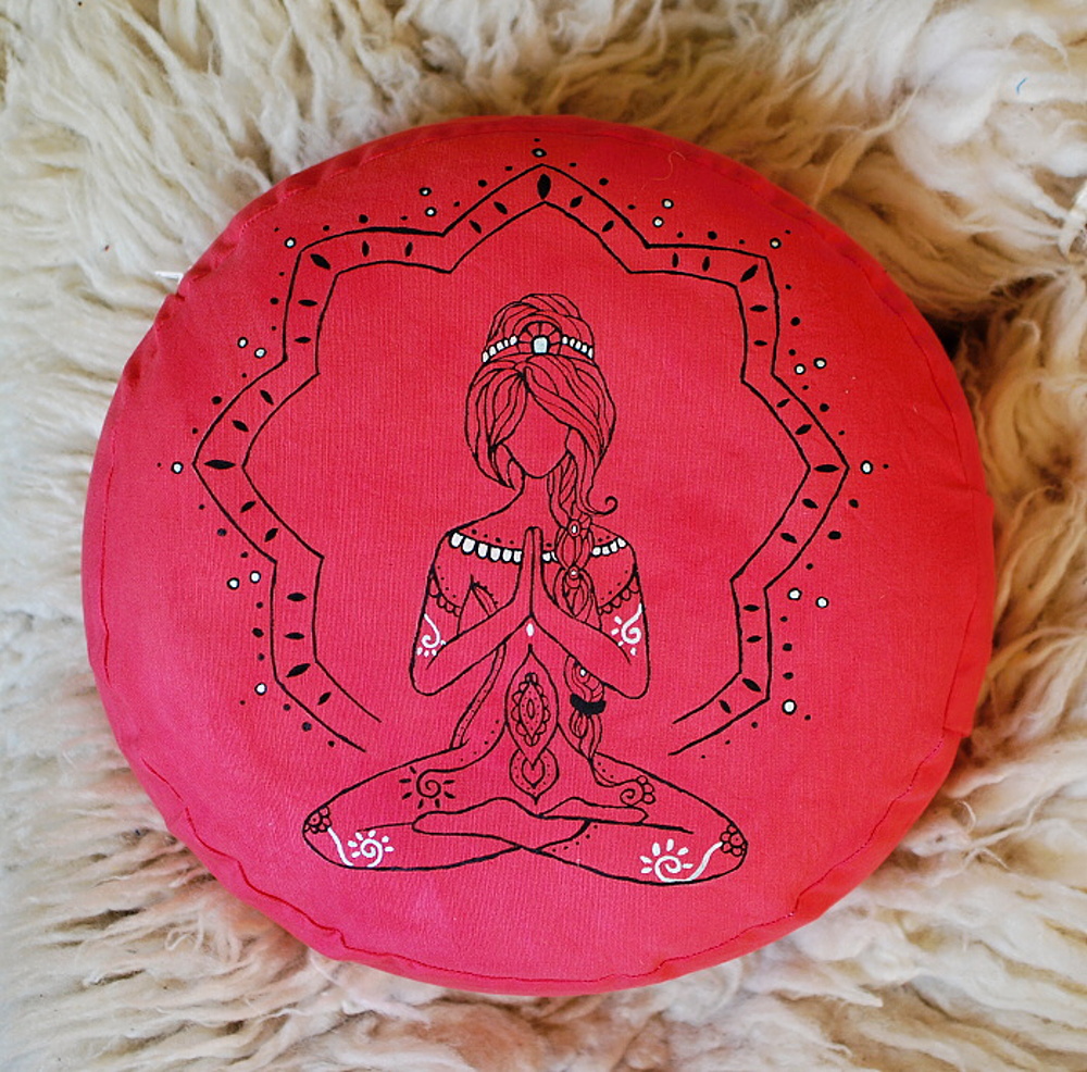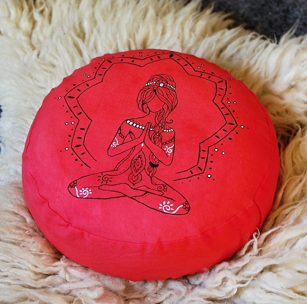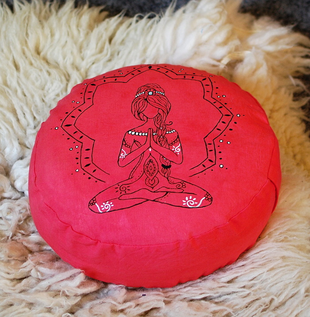 Meditační polštář v lososové barvě s ruční malbou. Vnější obal je ušitý z pevného bavlněného plátna se zapínáním na zip. Vnitřní obal je z tenké bavlněné látky, se zapínáním také na zip, aby bylo možné náplň snadno vyměnit. Malba i barvení kvalitními barvami na textil. Polštář je plněný bio pohankovými slupkami. Náplně je více, aby bylo možné slupky odsypat a vytvořit si pohodlí sobě vlastní.
