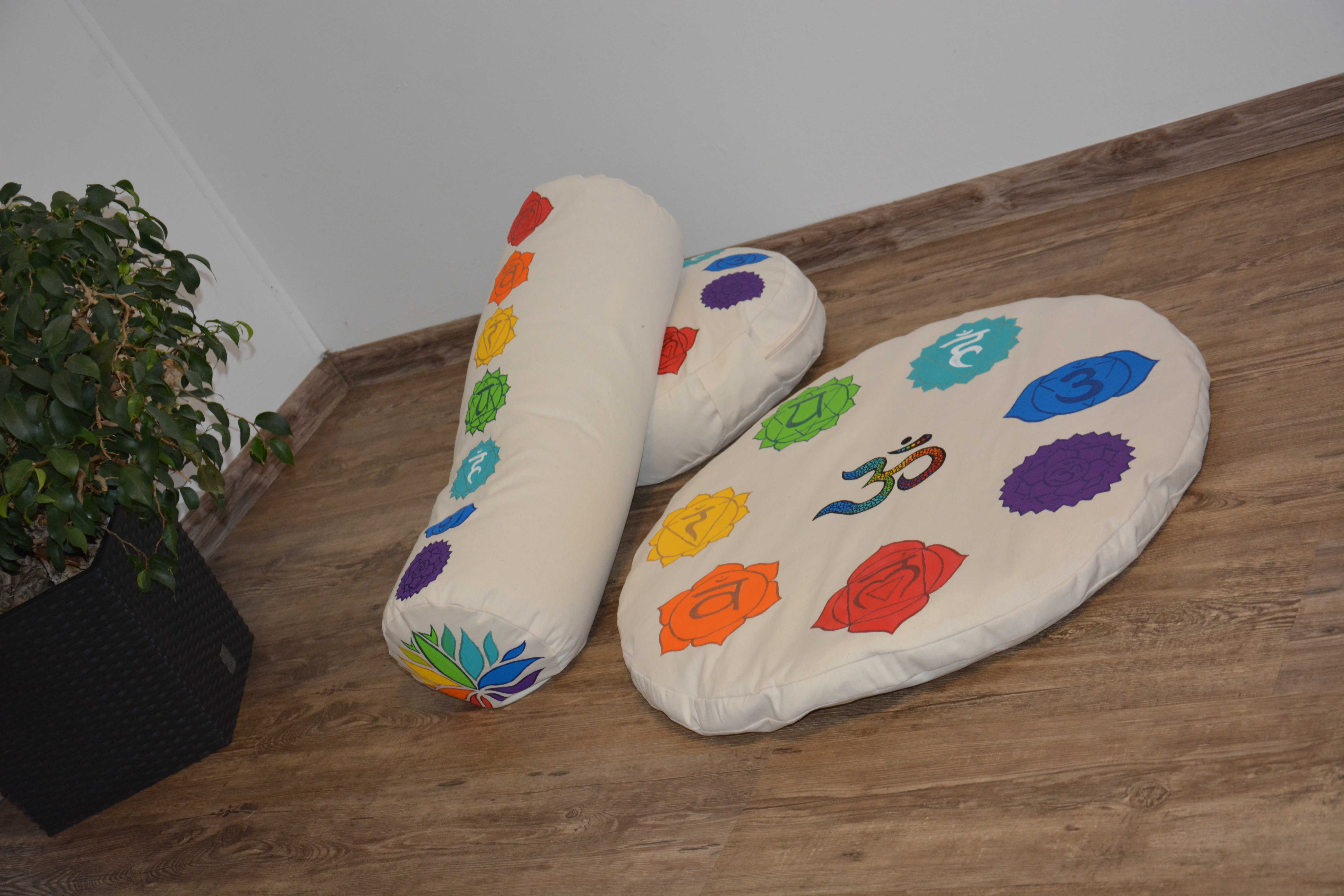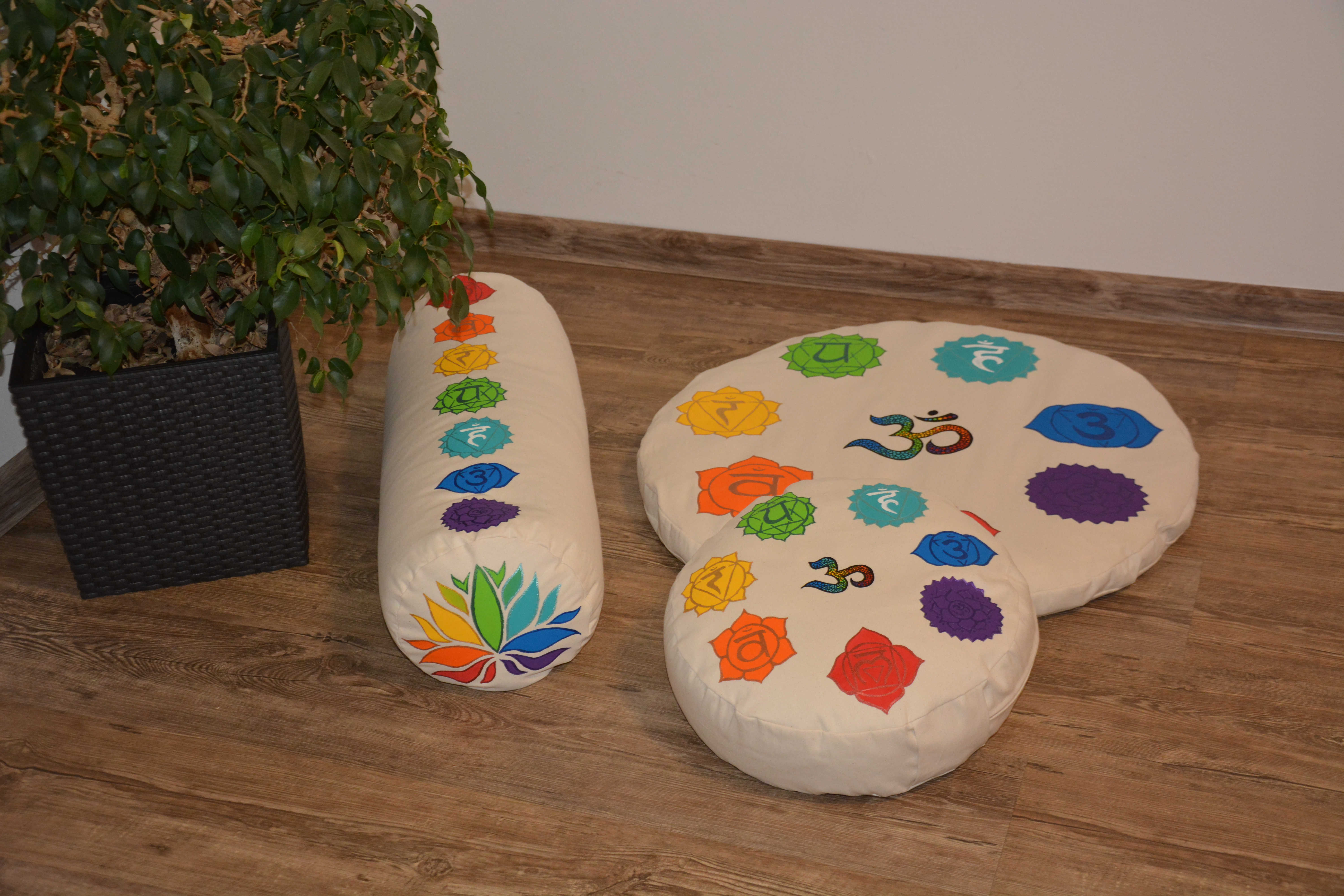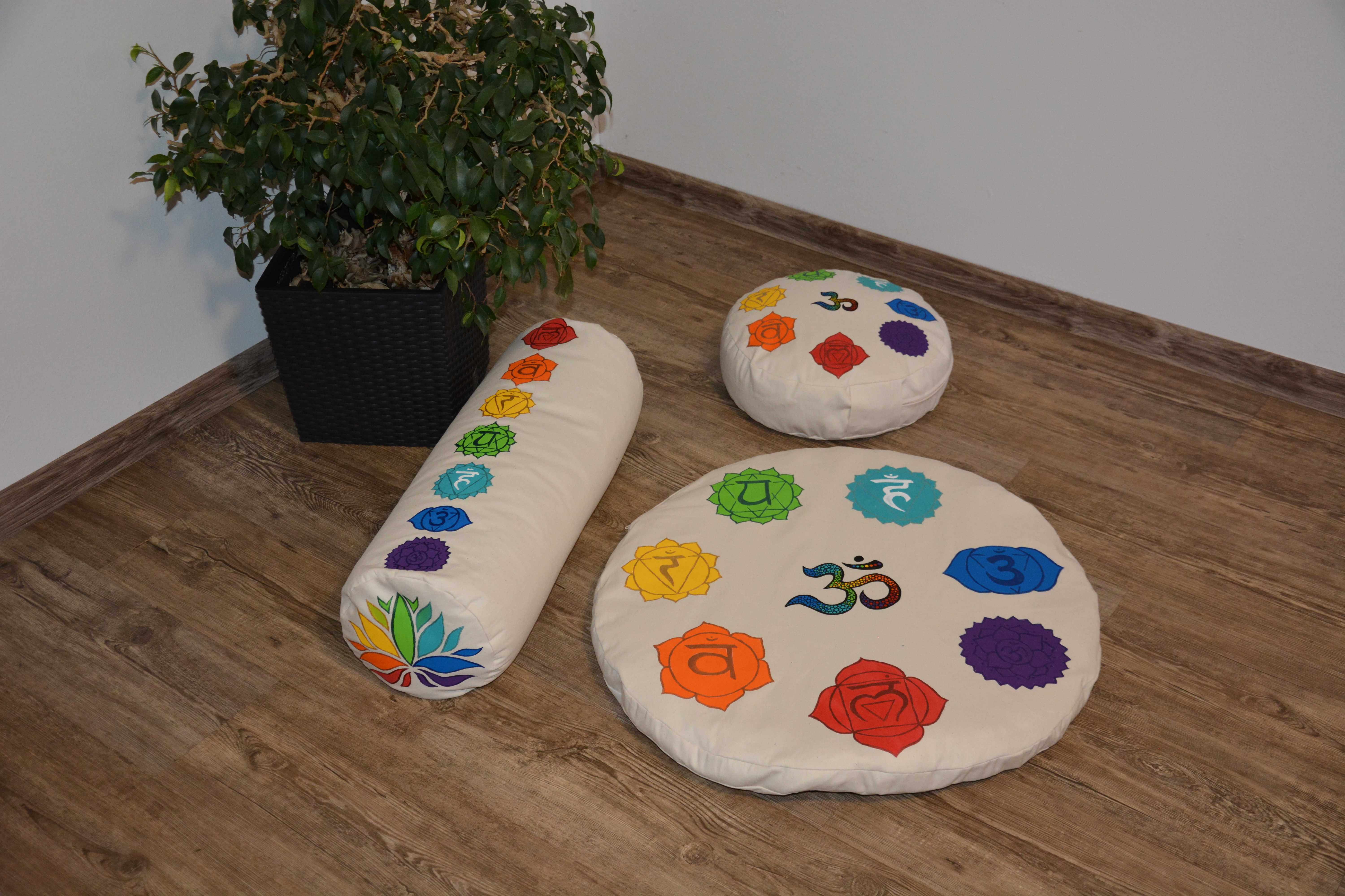 Sada složená z meditačního polštářku a kulaté pohankové podložky. V krémovém provedení a malbou sedmi čaker vždy na vrchní straně.