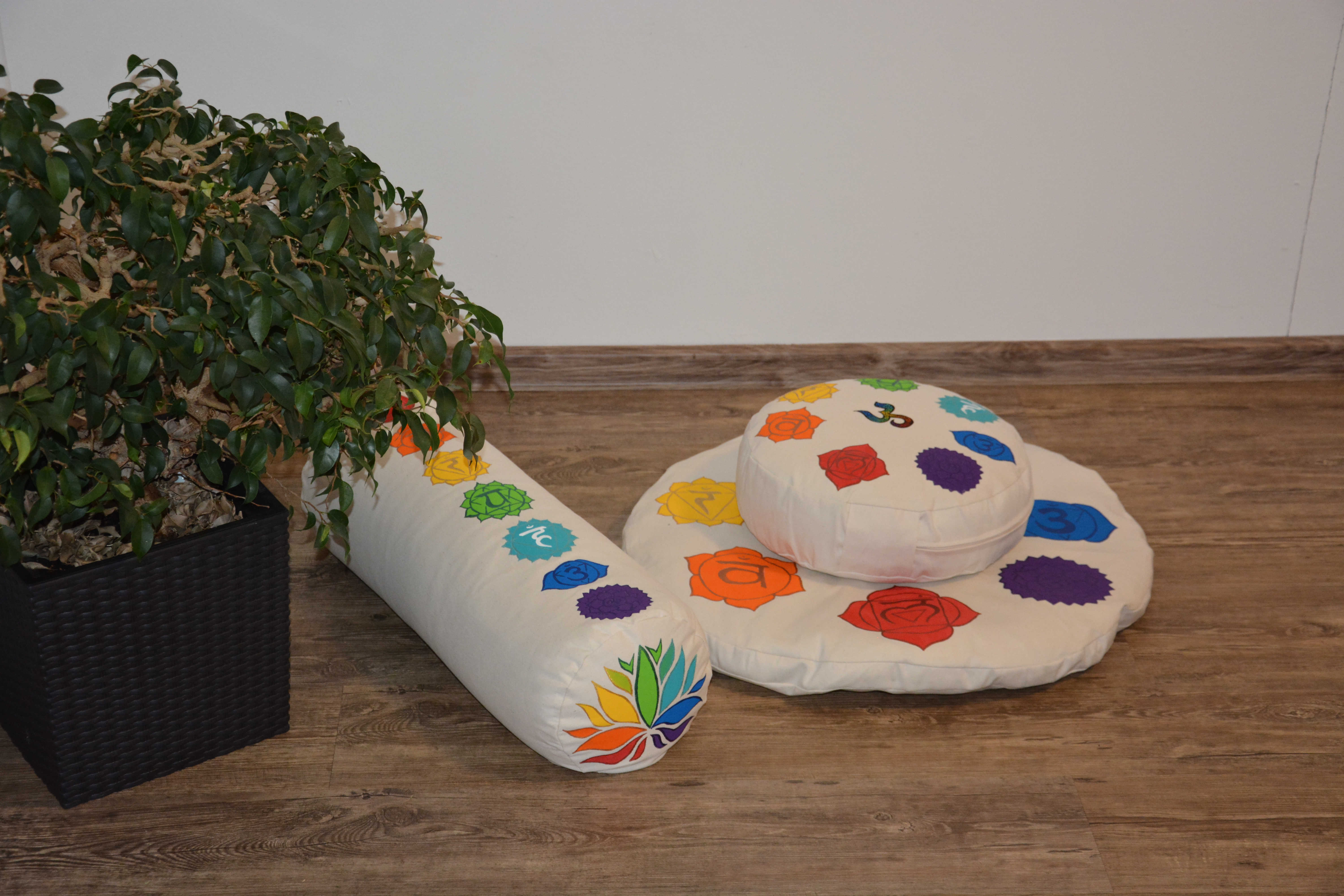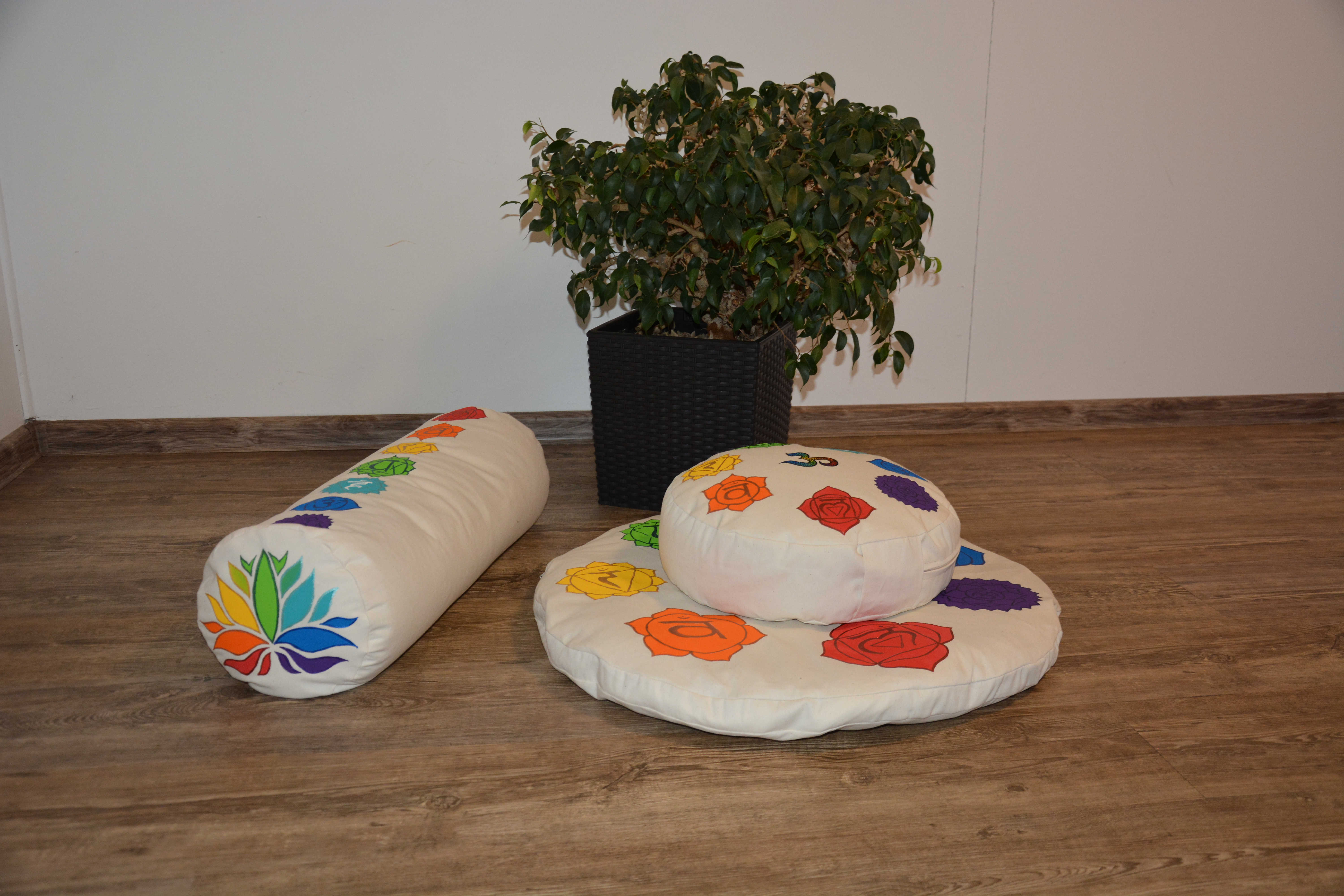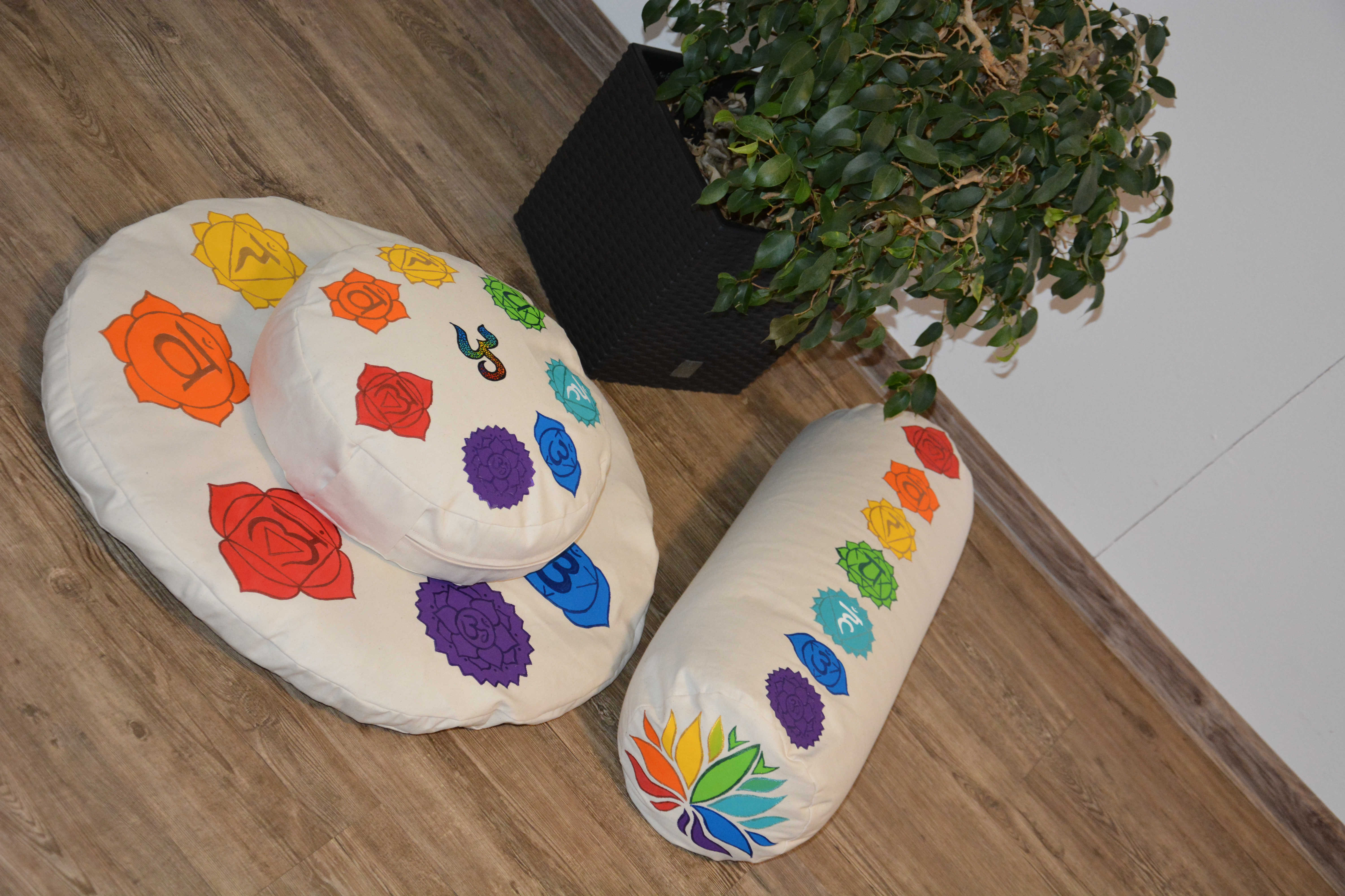 Sada složená z meditačního polštářku a kulaté pohankové podložky. V krémovém provedení a malbou sedmi čaker vždy na vrchní straně.