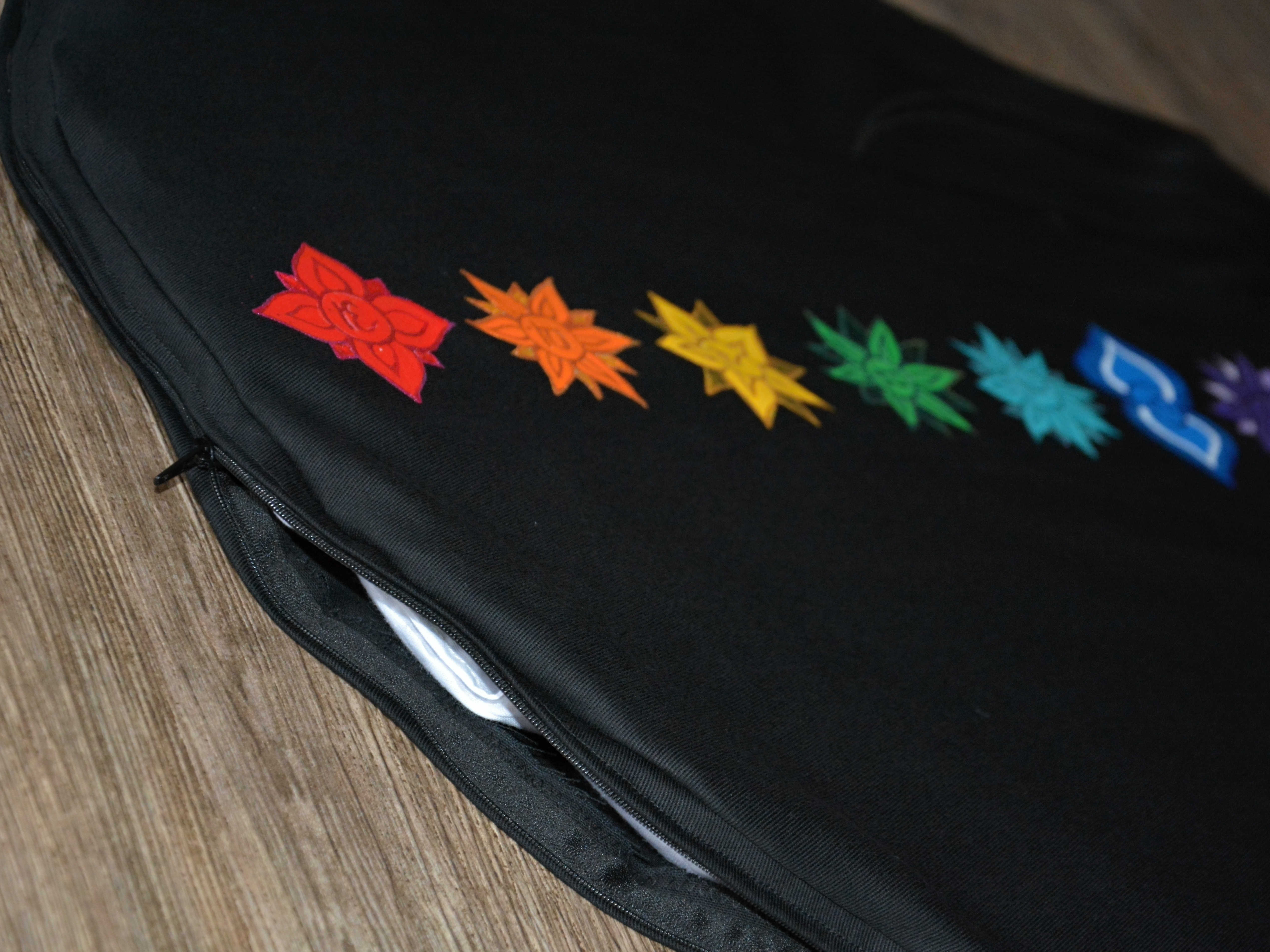 Oválná meditační podložka s malbou čaker a lotosového květu. Lotos je malovaný glitter barvou, v určitých úhlech je téměř neviditelý, v jiných se třpytí. Zachycené na videu můžete shlédnout na Instagrmu :)
