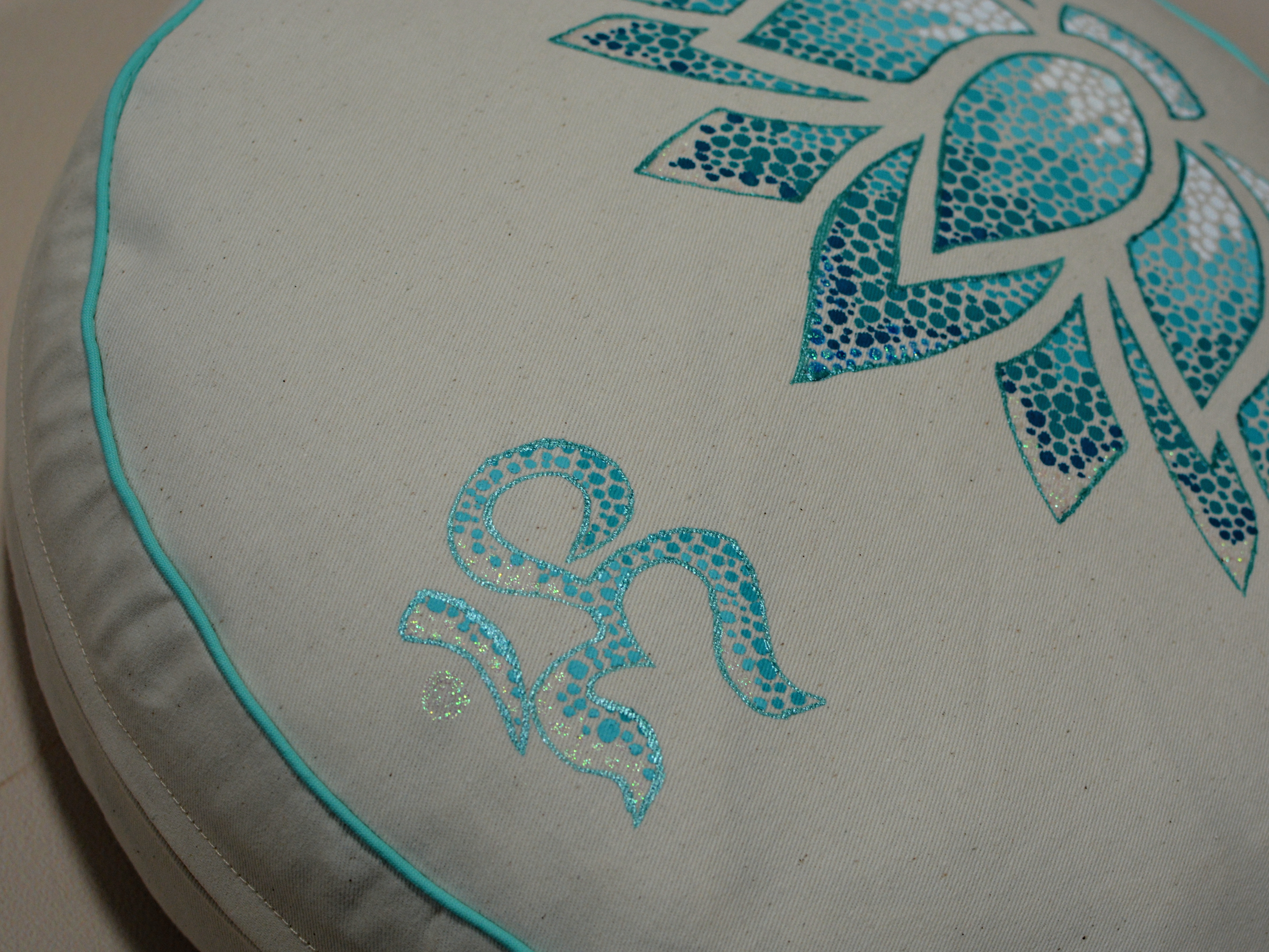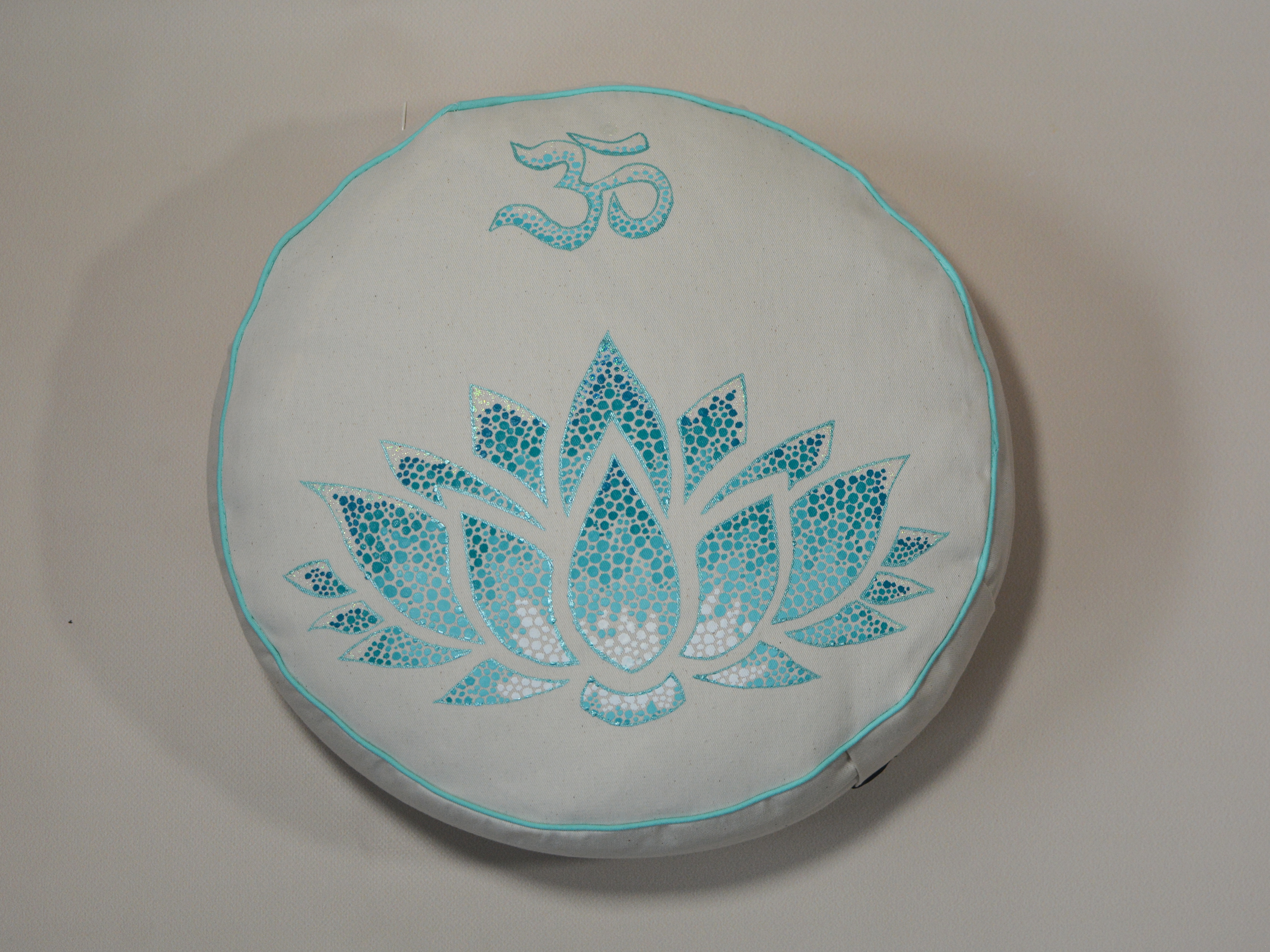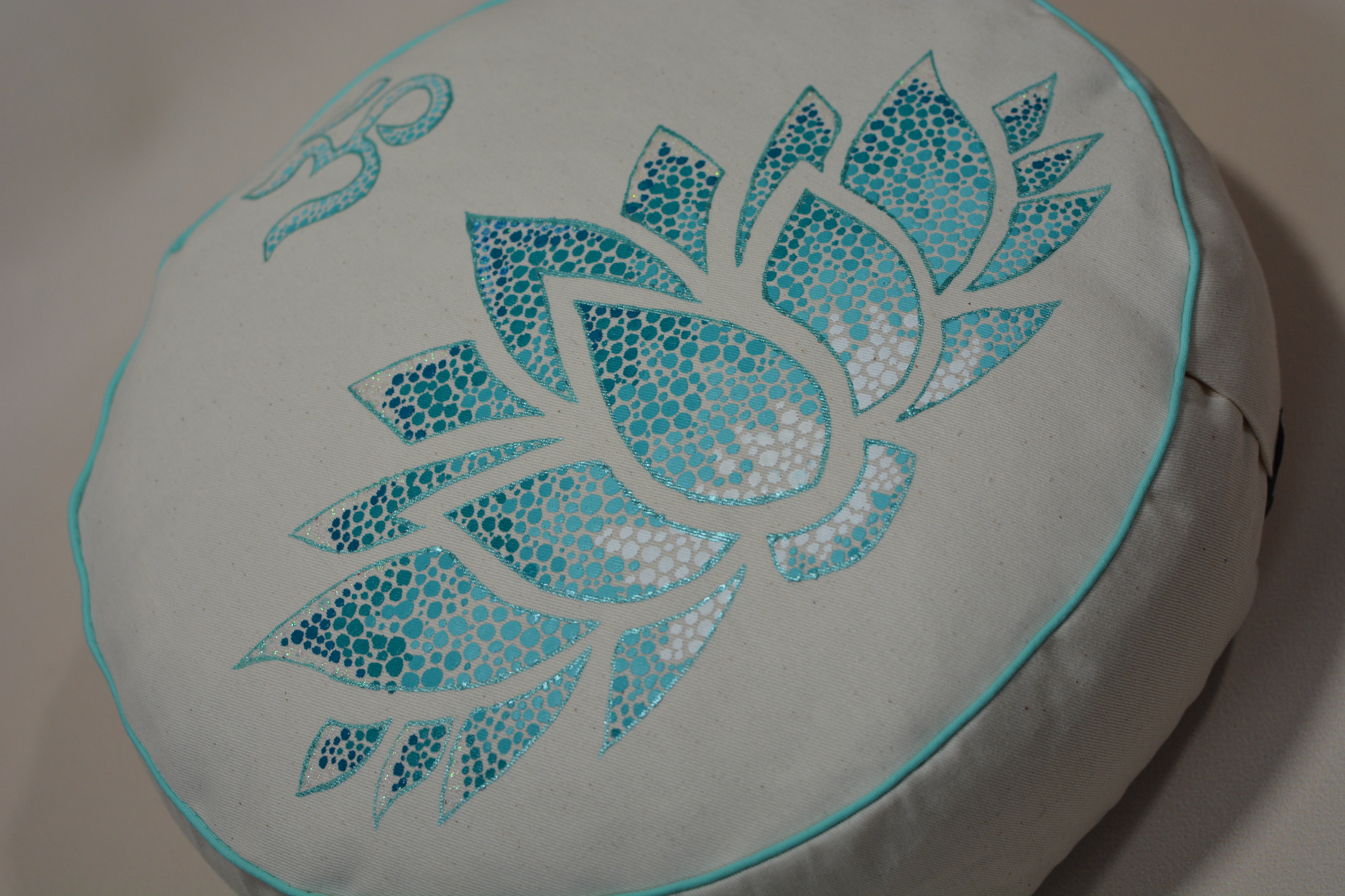 Meditační polštář v krémovém provedení a malbou v odstínech mátové a tyrkysové, obšitý ozdobnou paspulkou.