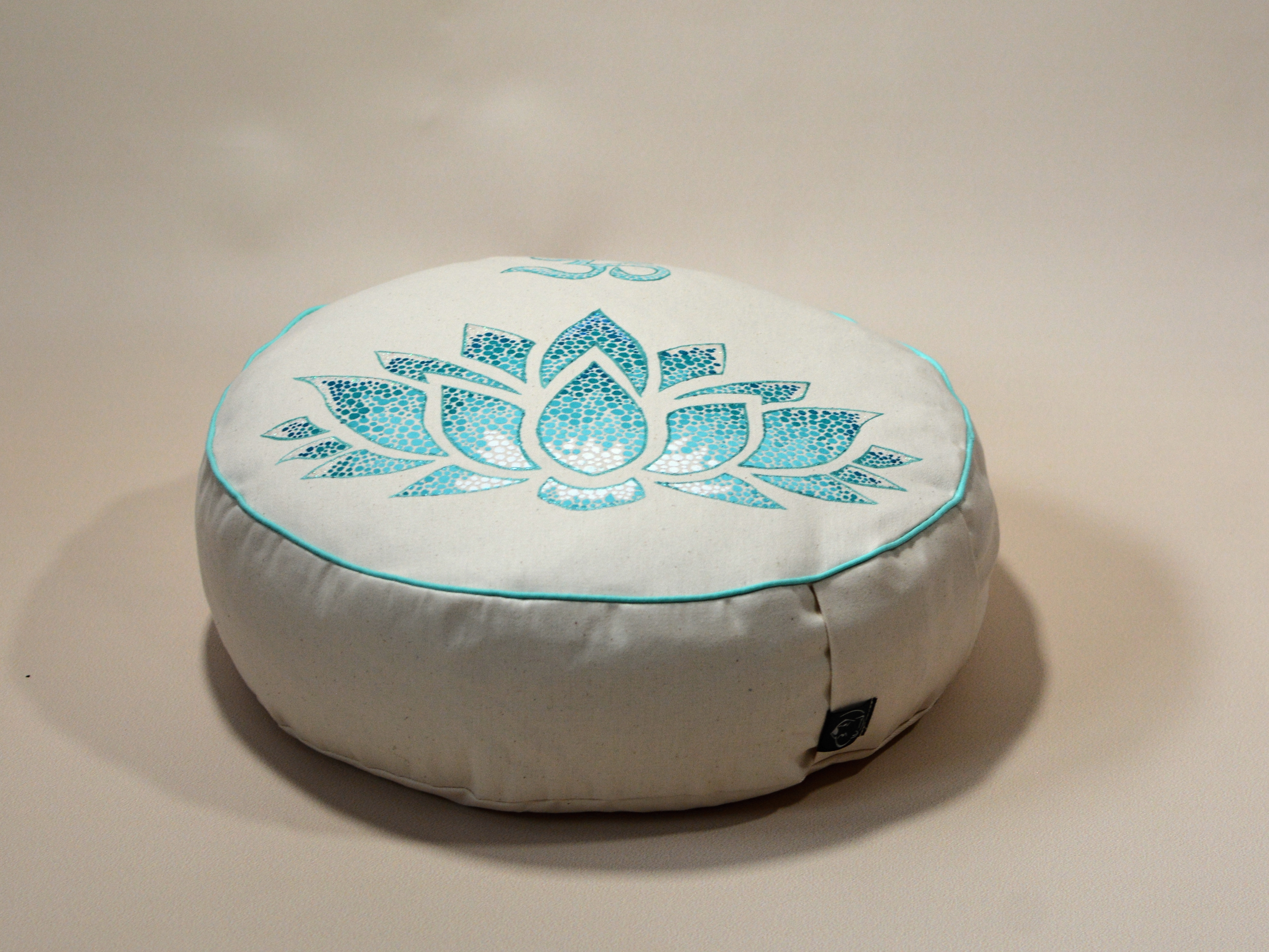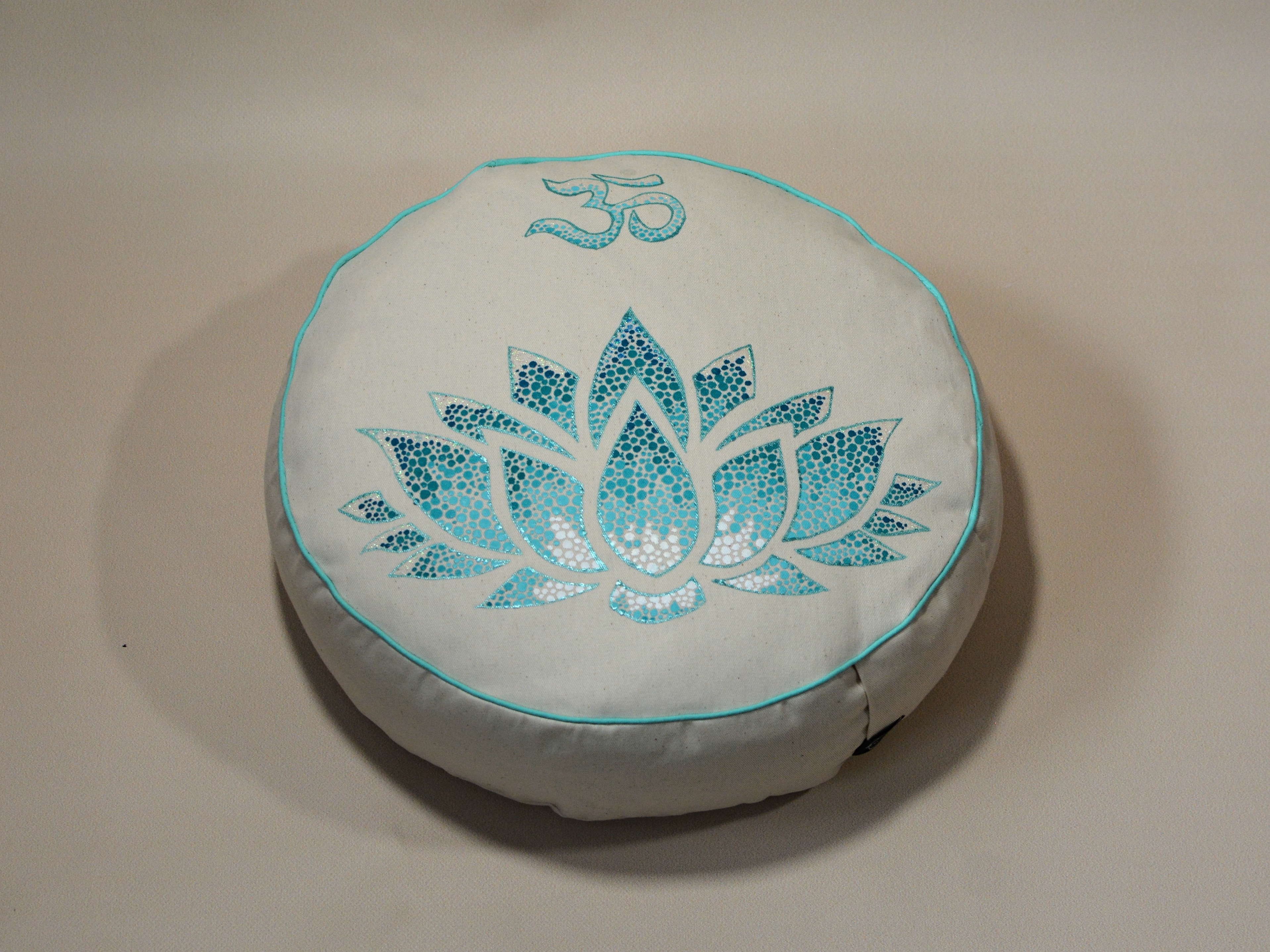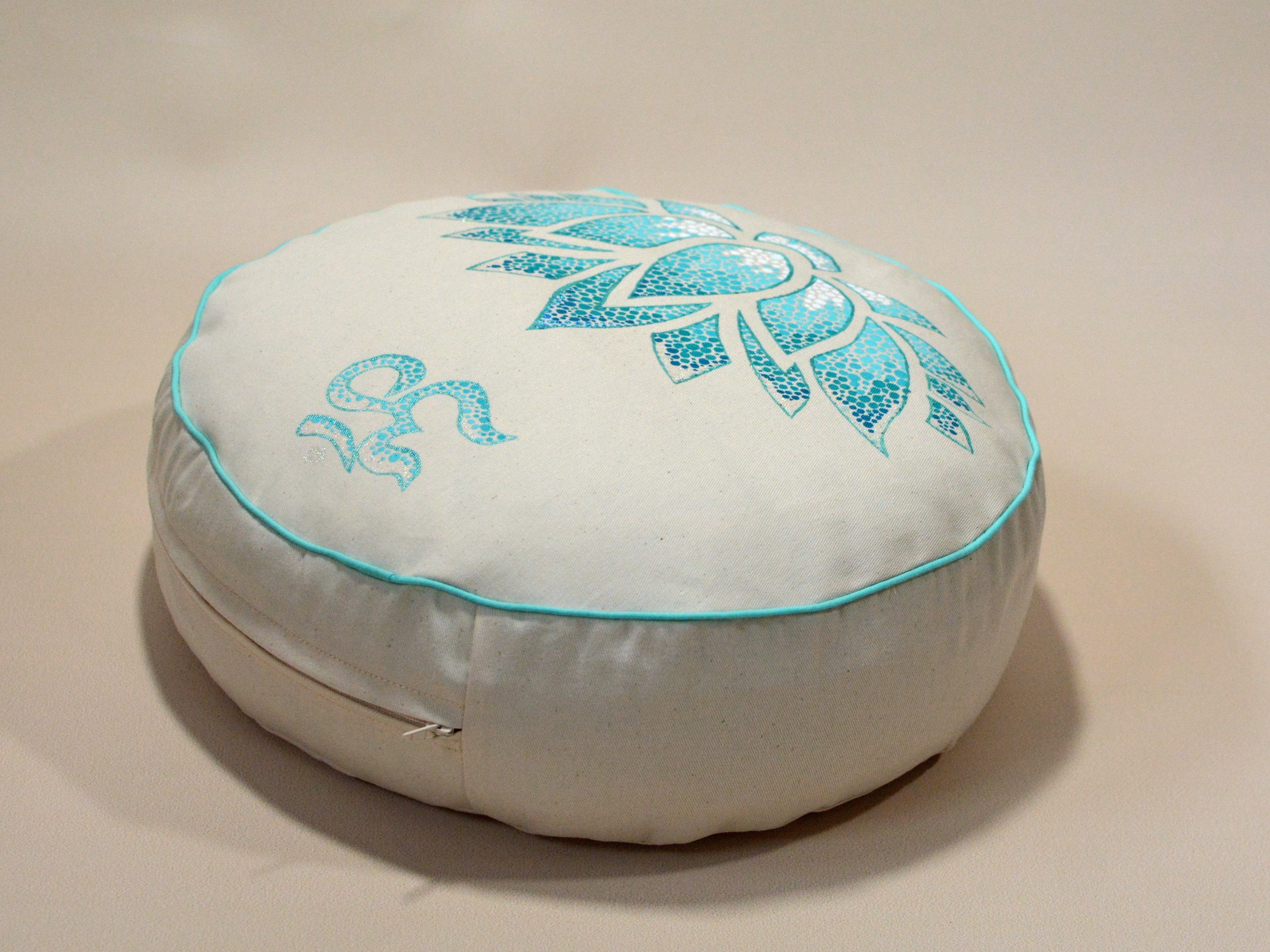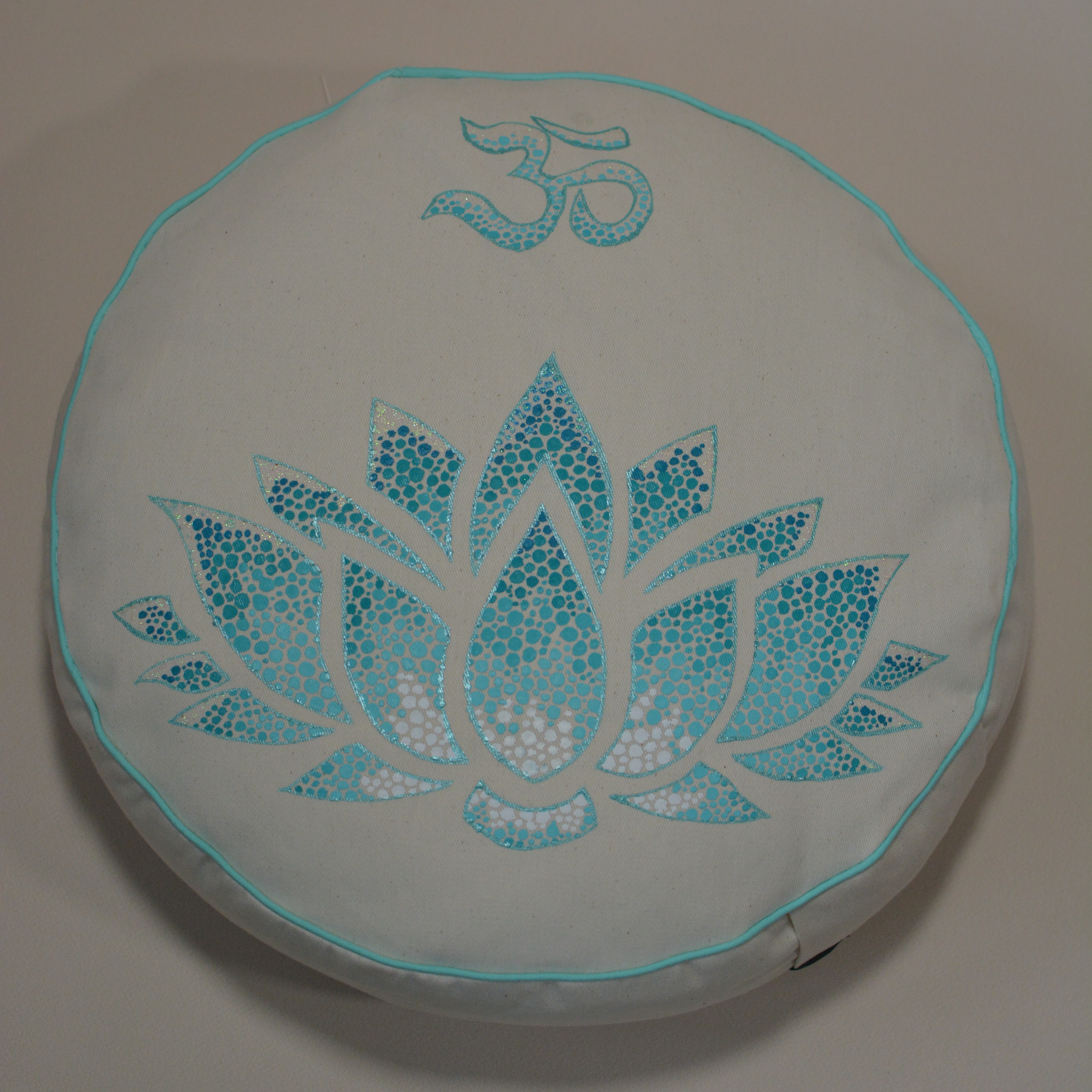 Meditační polštář v krémovém provedení a malbou v odstínech mátové a tyrkysové, obšitý ozdobnou paspulkou.