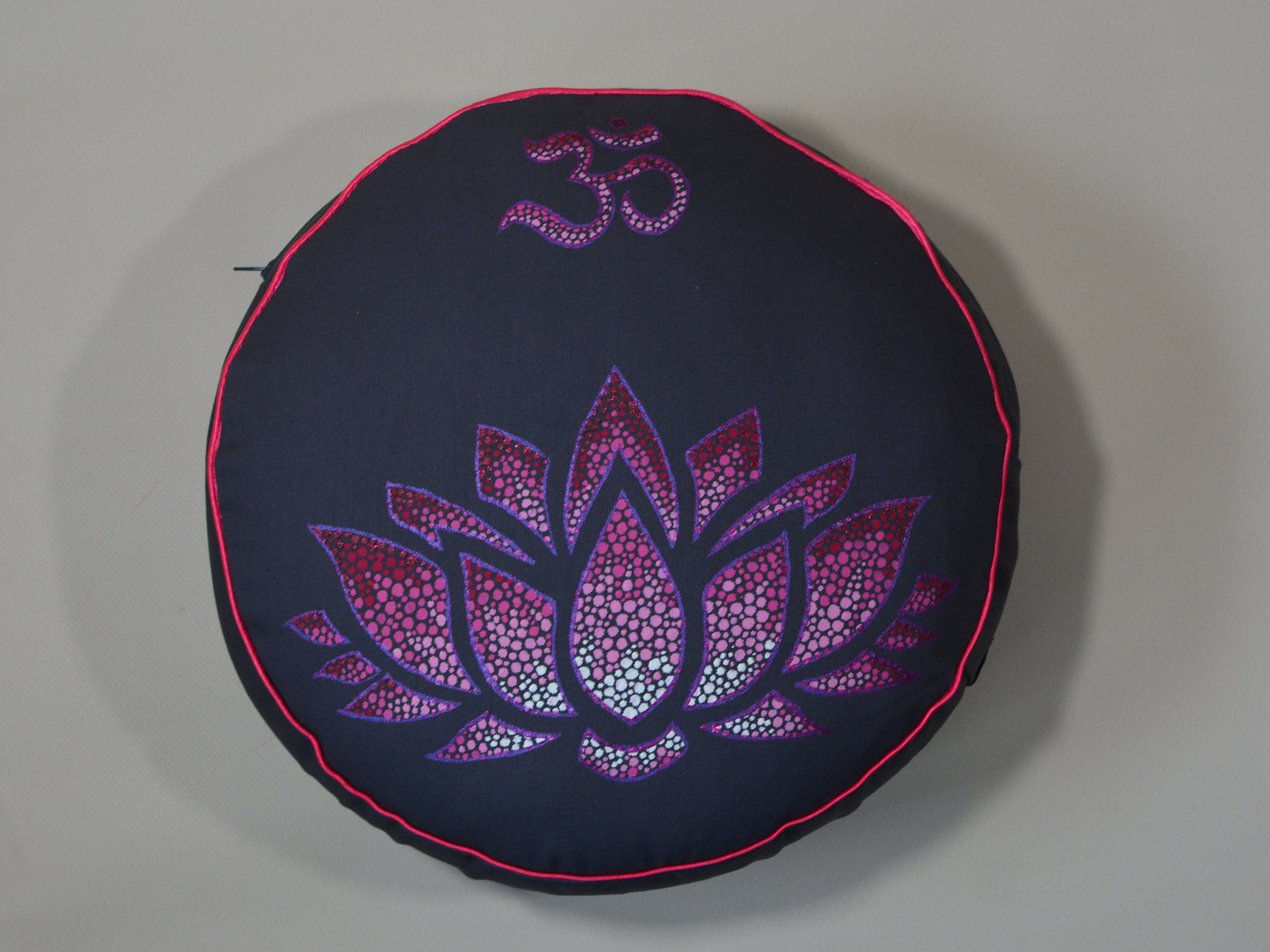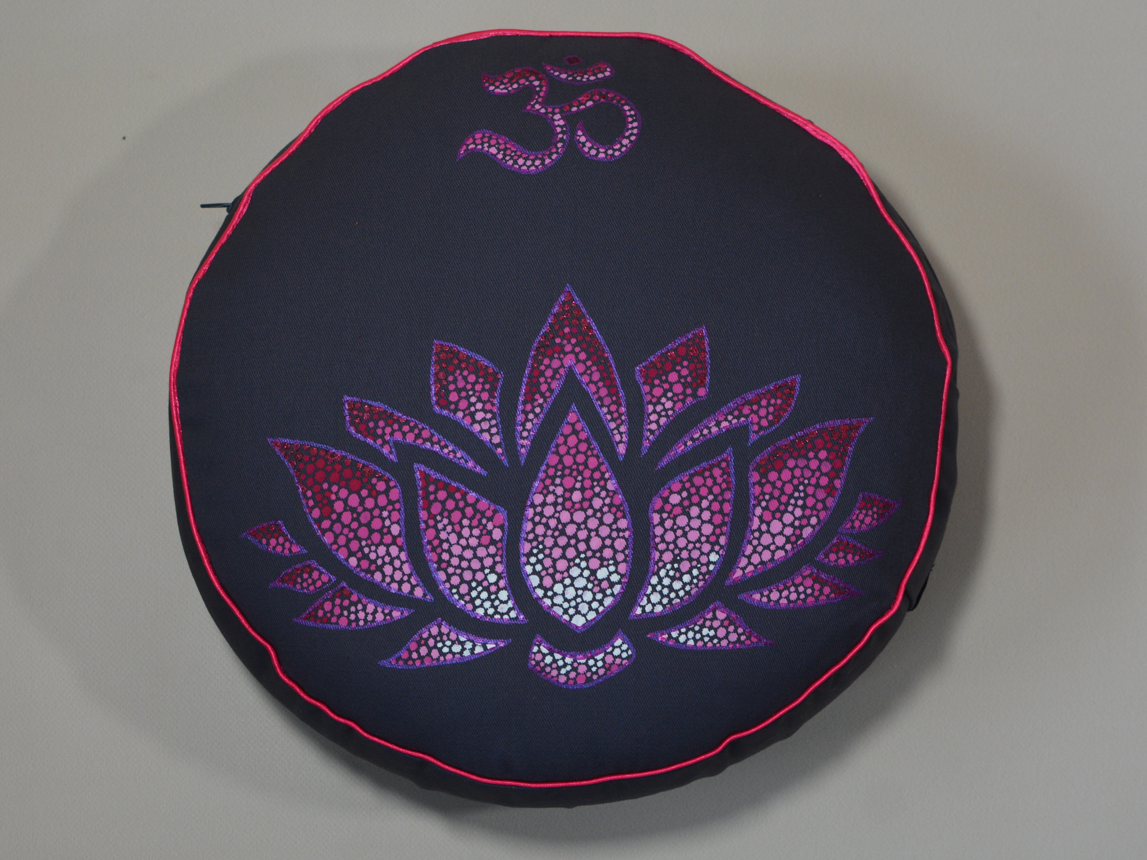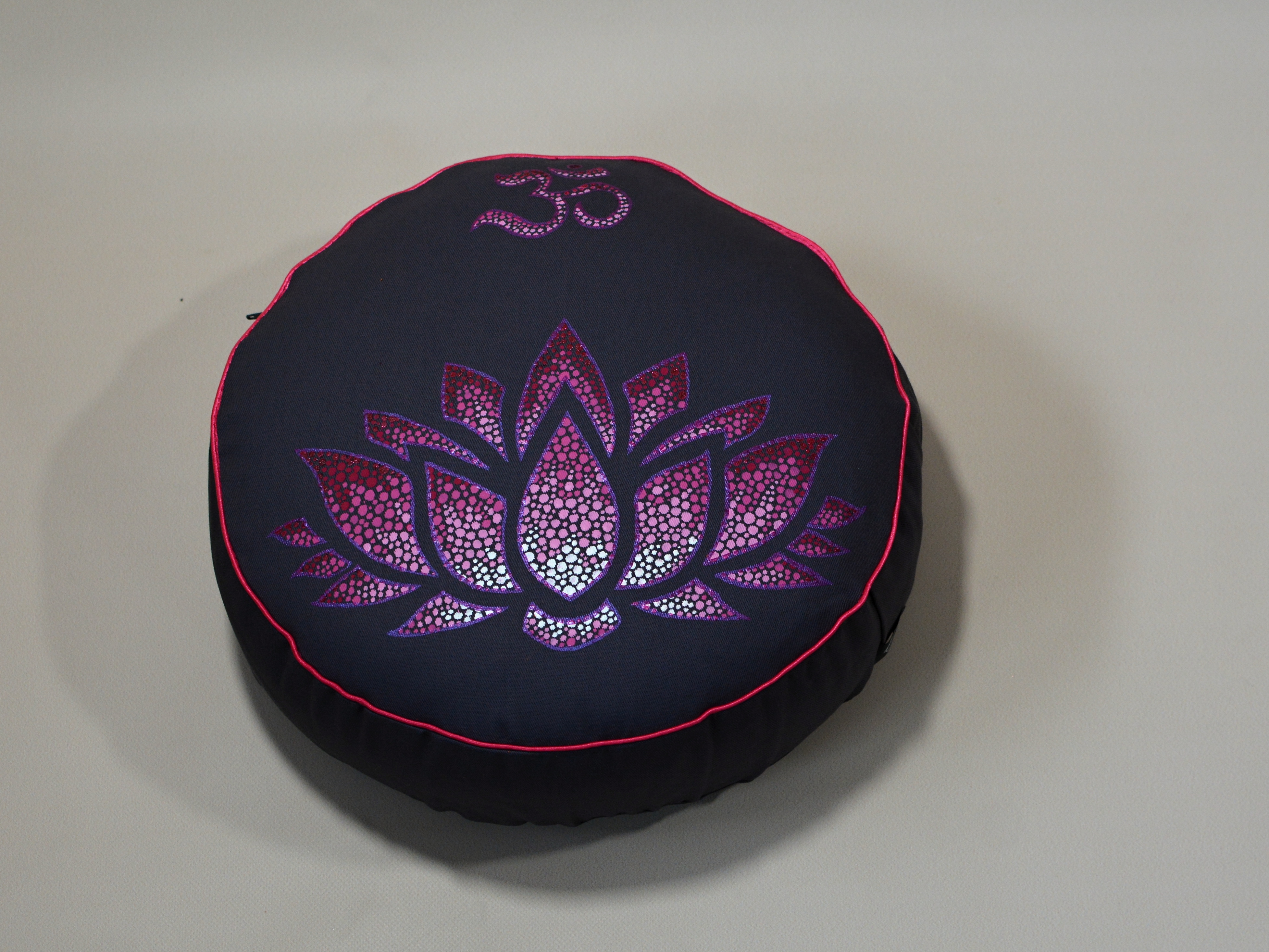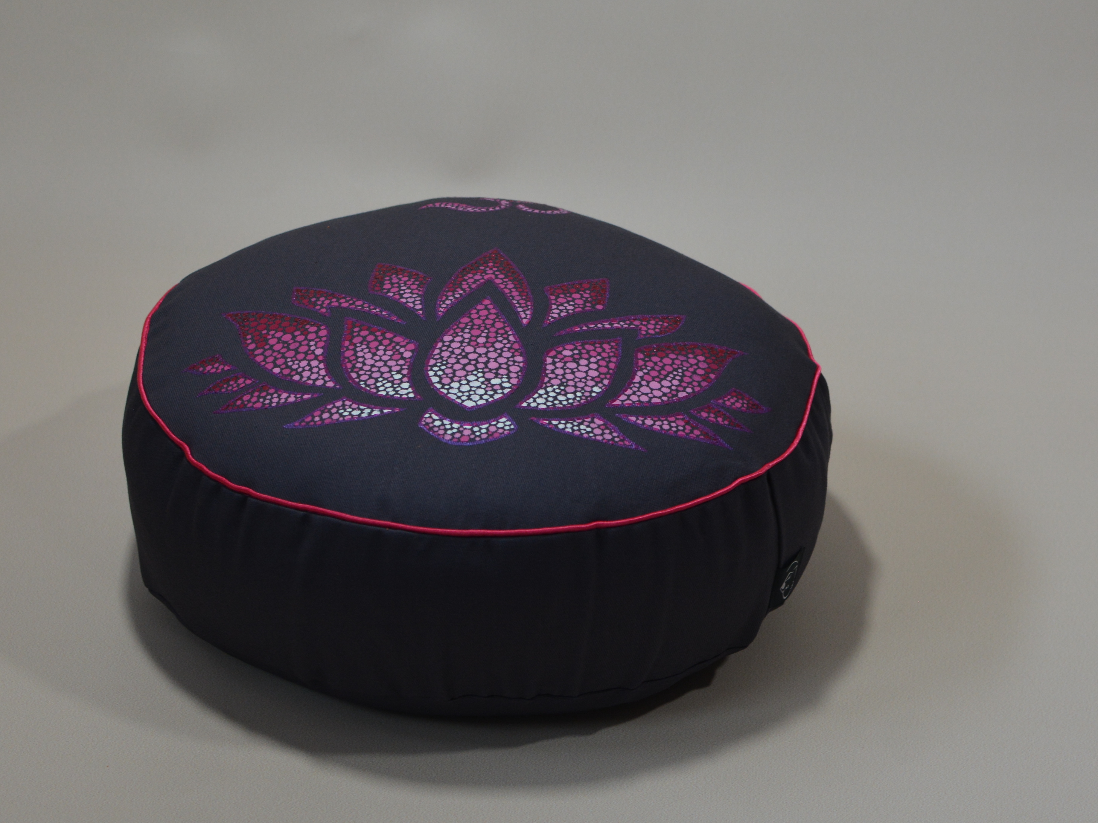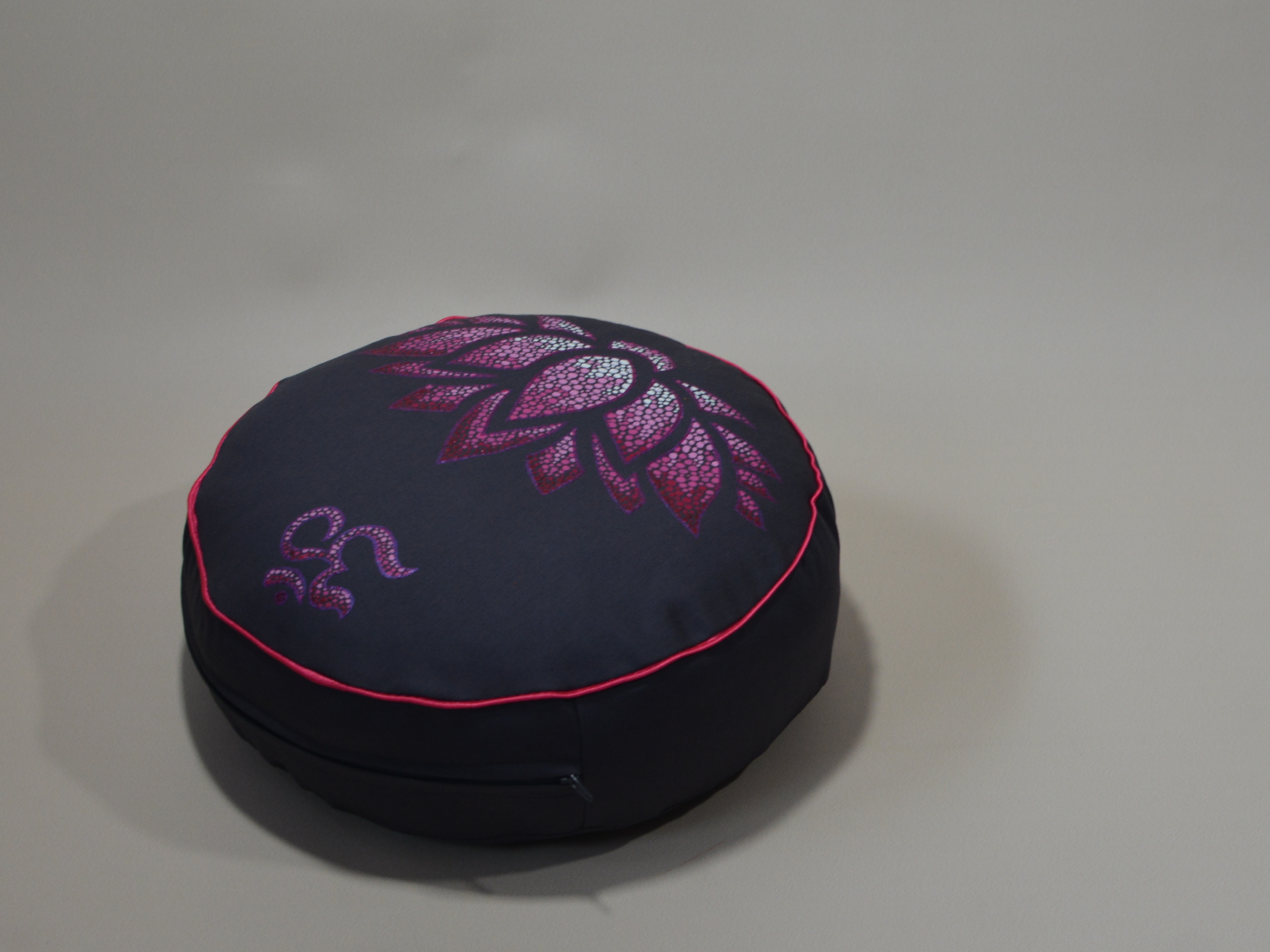 Meditační polštář v antracitovém provedení a malbou v odstínech růžové, obšitý ozdobnou paspulkou.