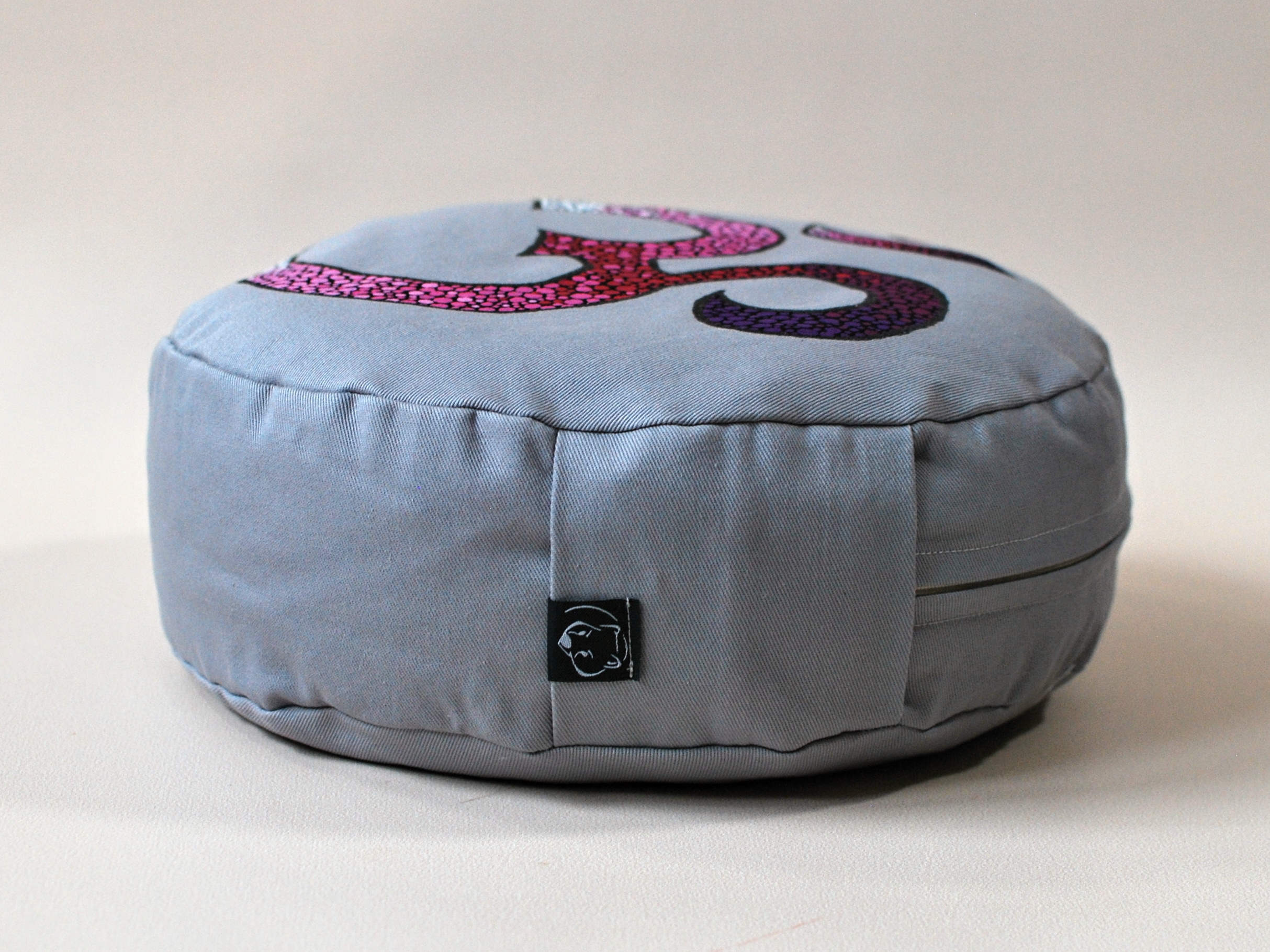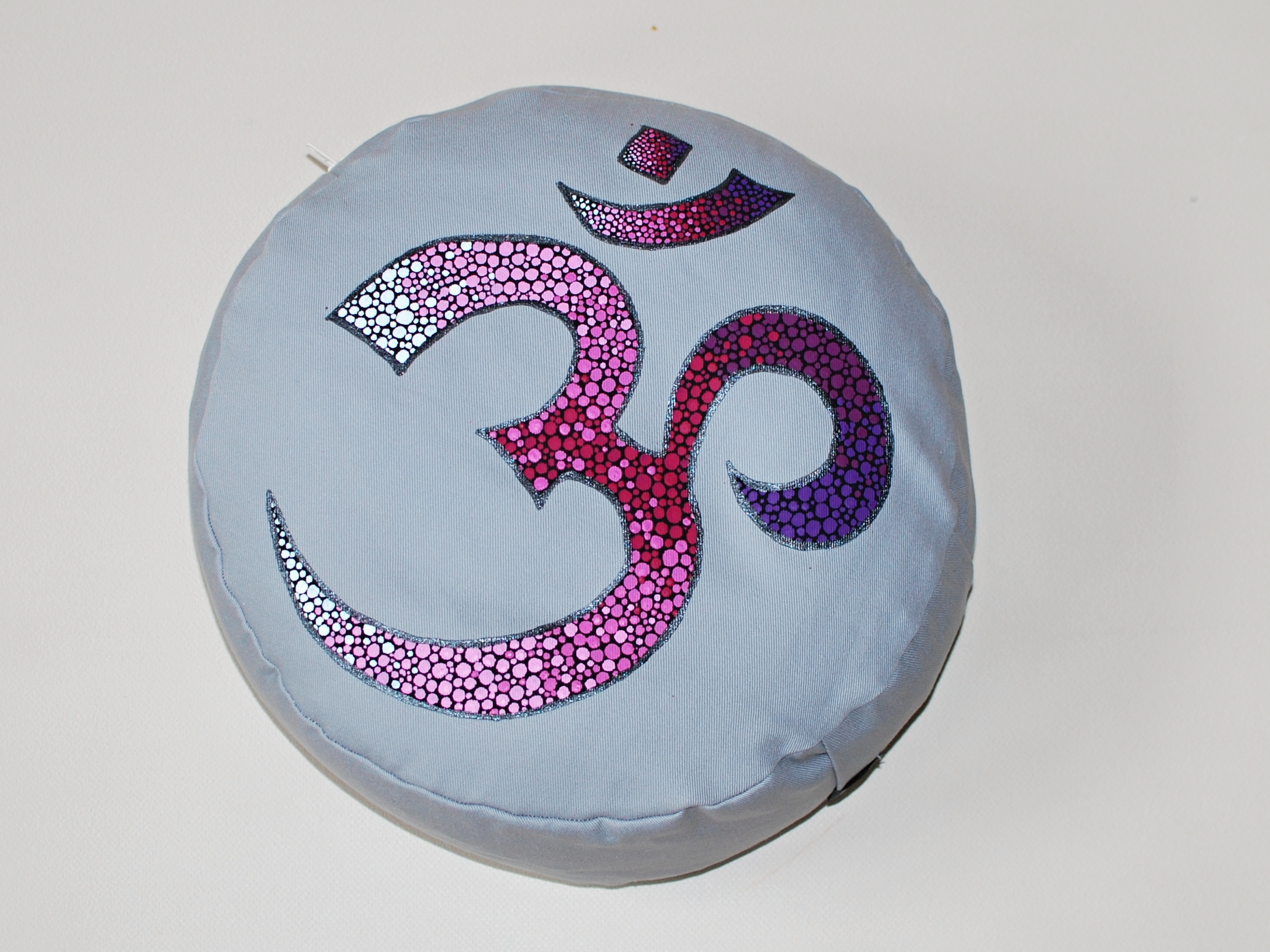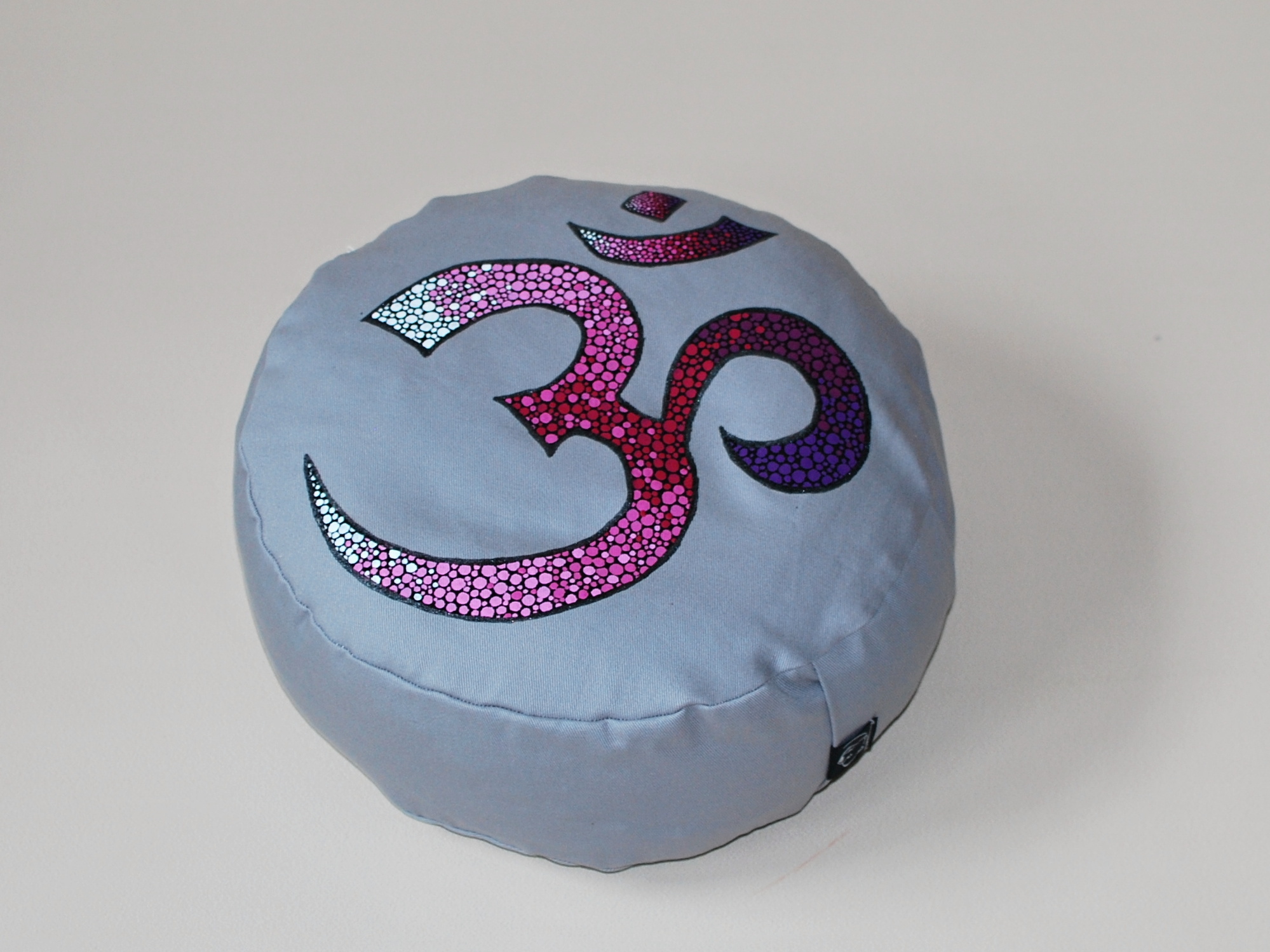 Meditační polštář v černé brvě s malbou. Vnější obal je ušitý z pevného bavlněného plátna se zapínáním na zip. Vnitřní obal je z tenké bavlněné látky, se zapínáním také na zip, aby bylo možné náplň snadno vyměnit. Malba i barvení kvalitními barvami na textil. Barvy jsou v reálu živější a barvné přechody plynulejší, nepodařilo se mi zachytit na fotografii.