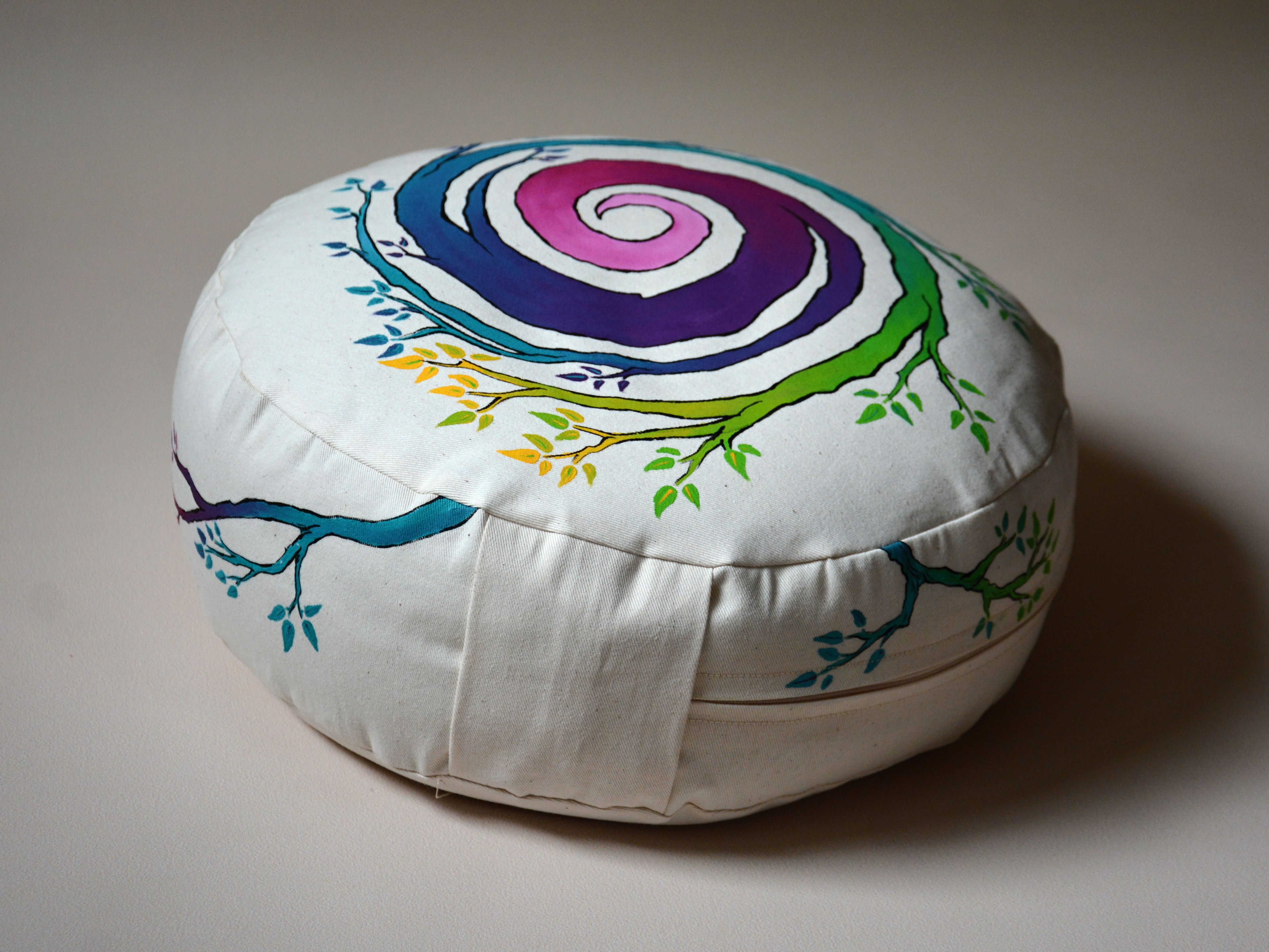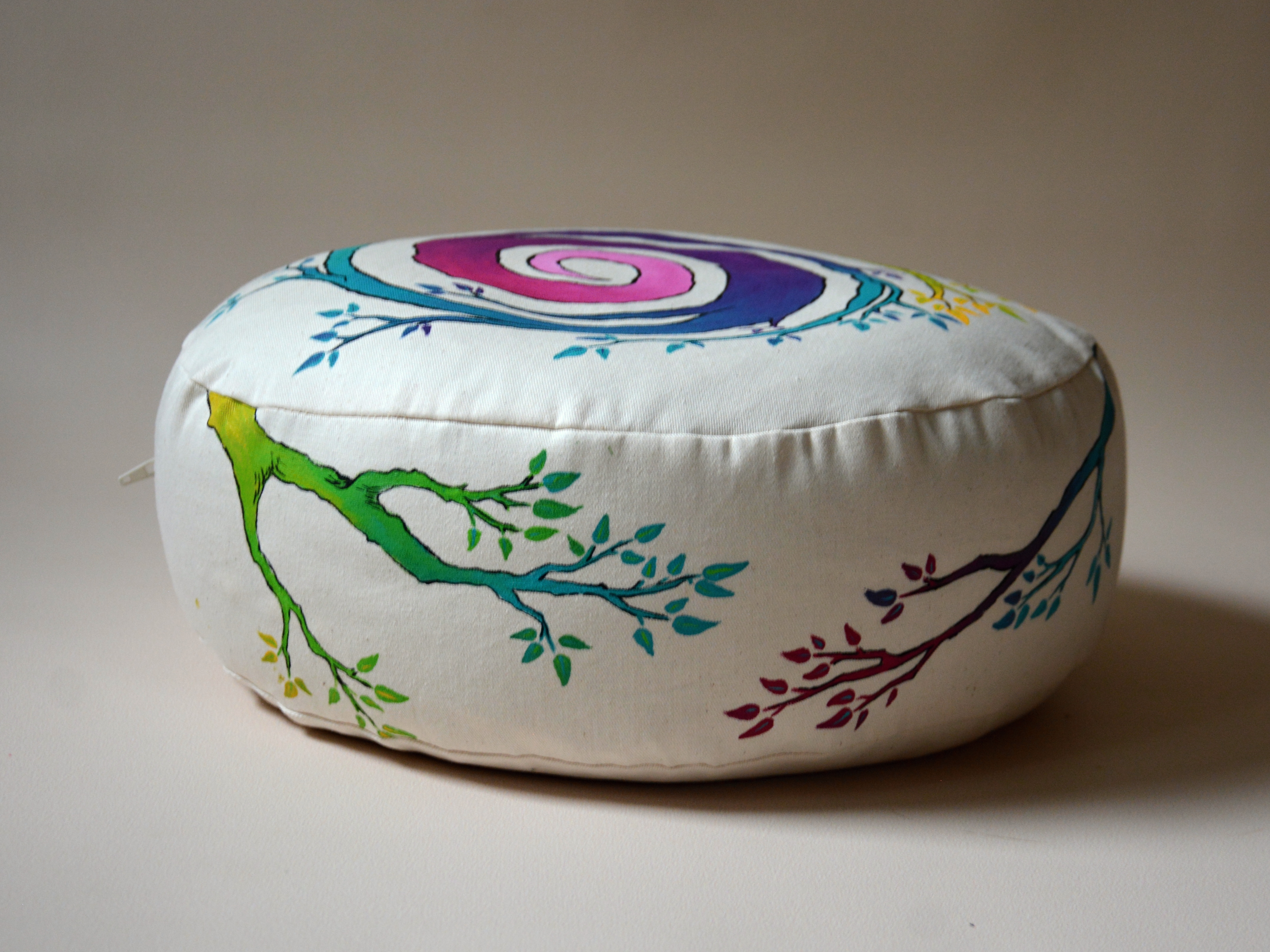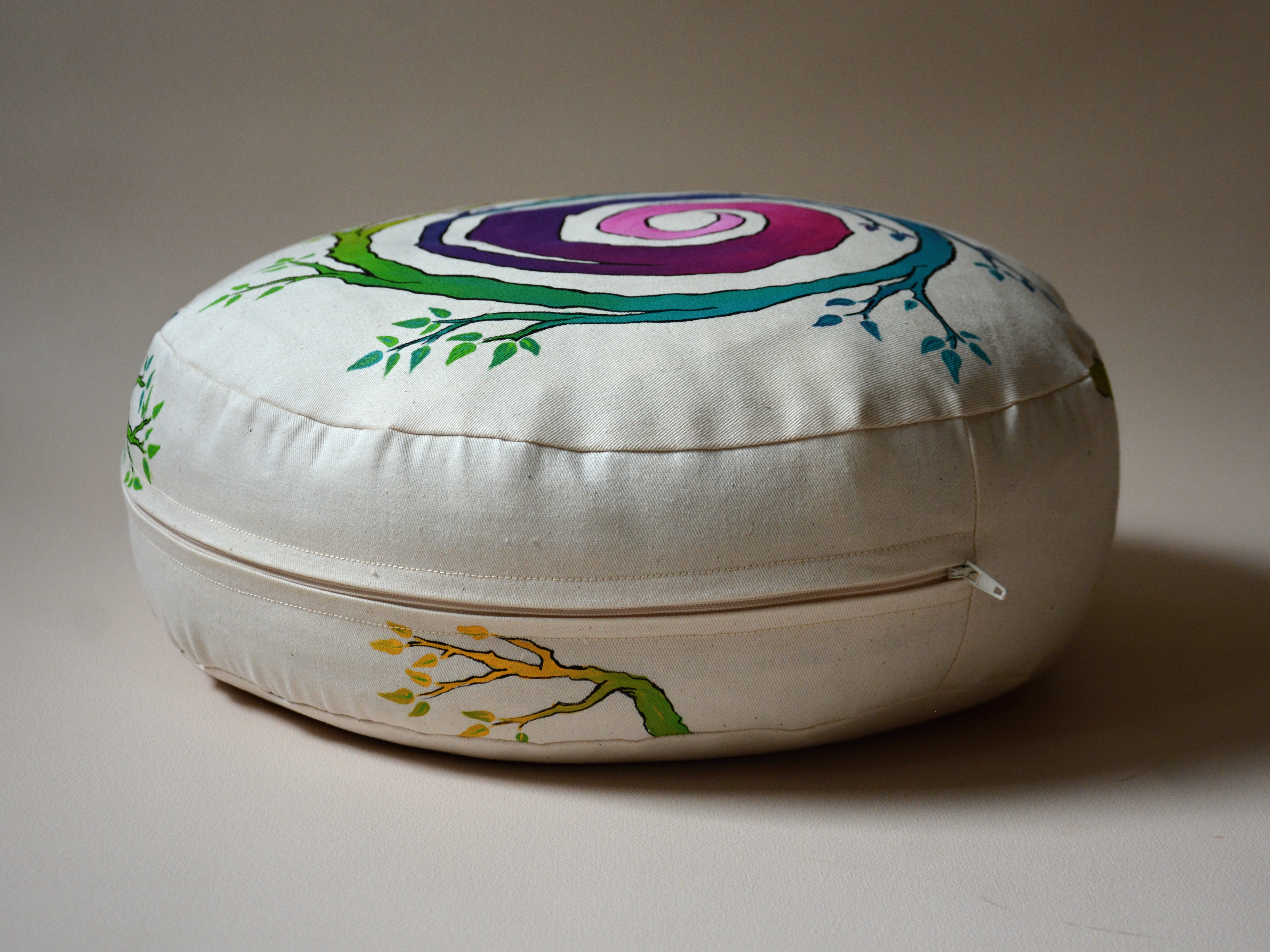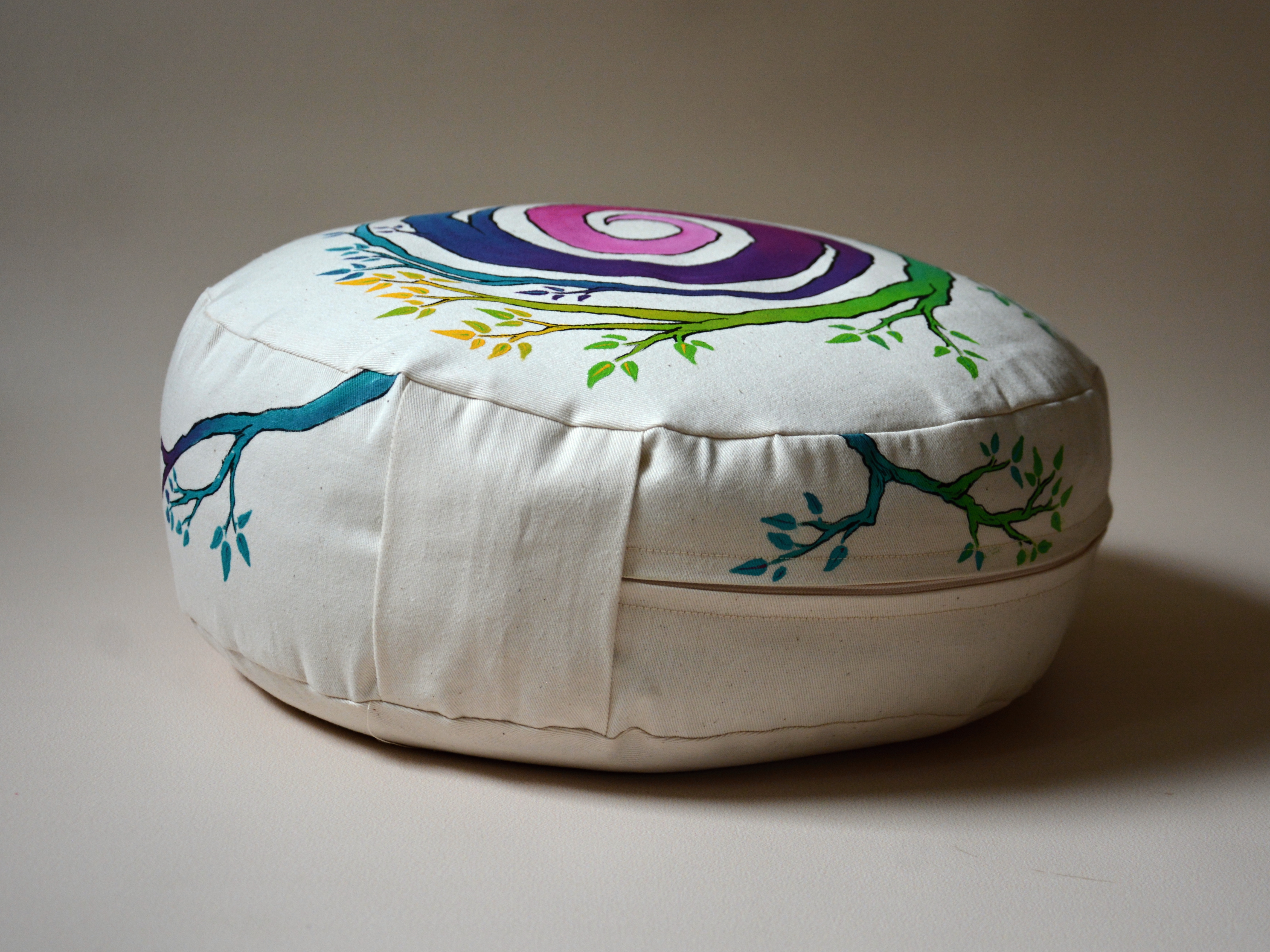 Meditační polštář z organické bavlny v barvě natural, s malbou. Vnější obal je ušitý z pevného bavlněného plátna v keprové vazbě a se zapínáním na zip. Vnitřní obal je z bavlněného plátna, se zapínáním také na zip, aby bylo možné náplň snadno vyměnit. Malba i barvení kvalitními barvami na textil.