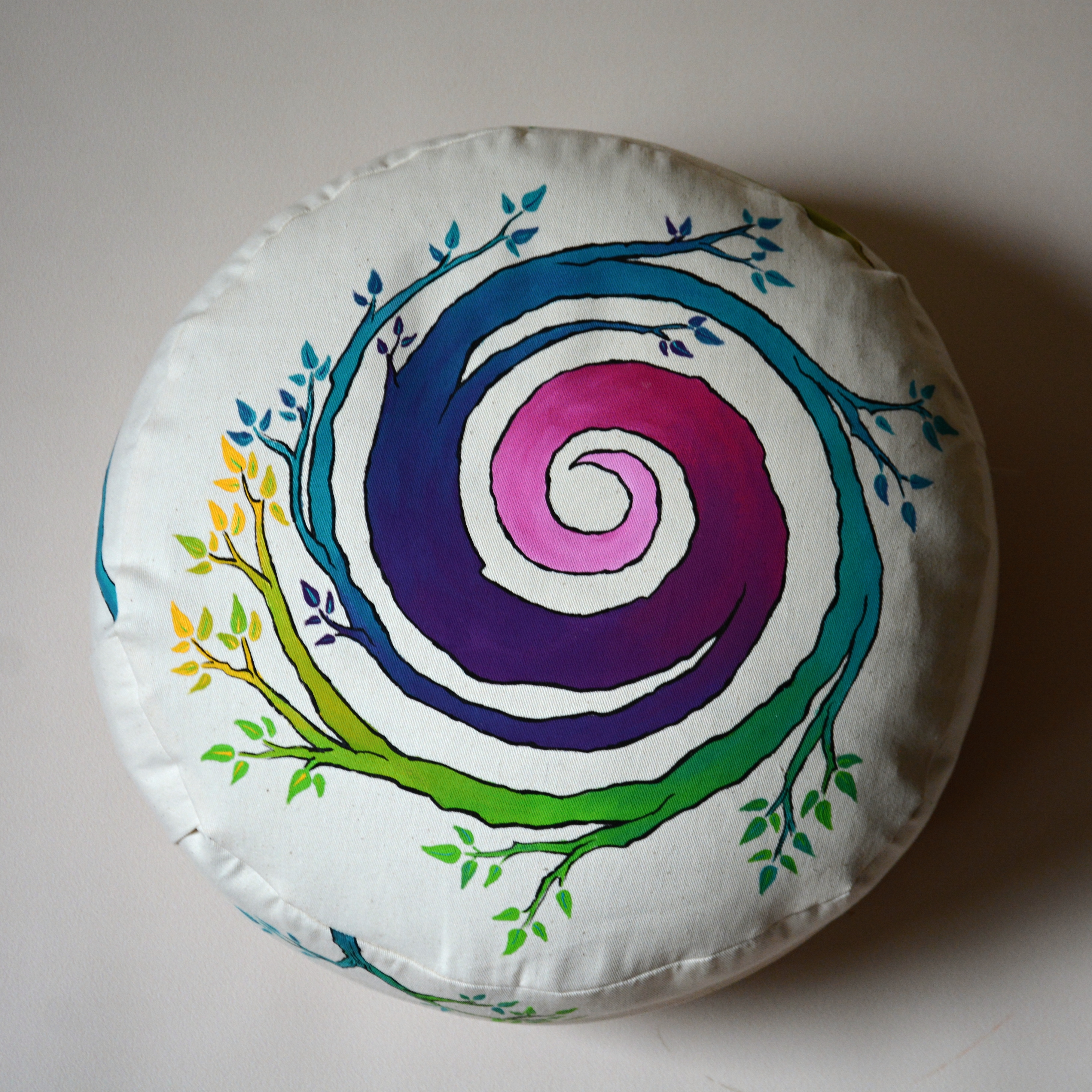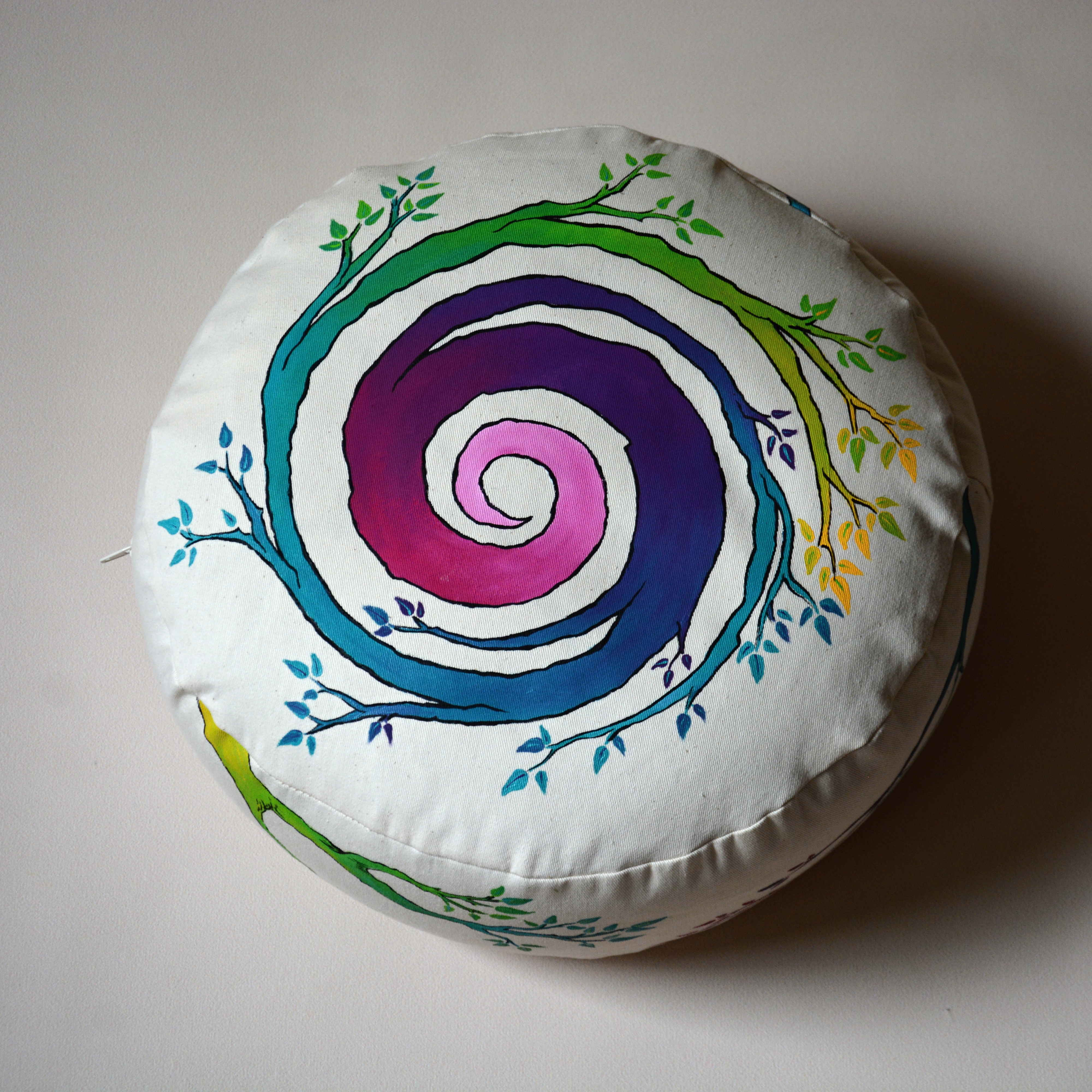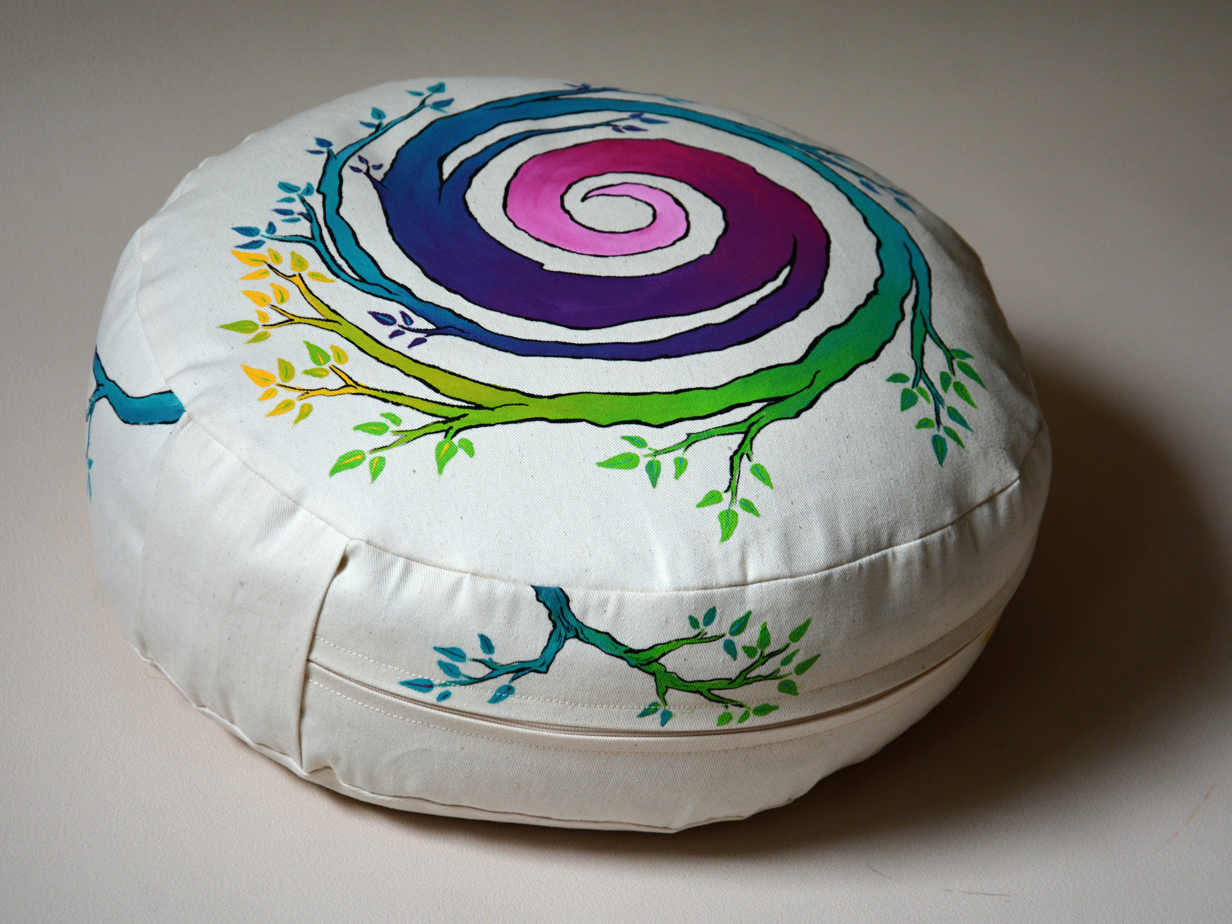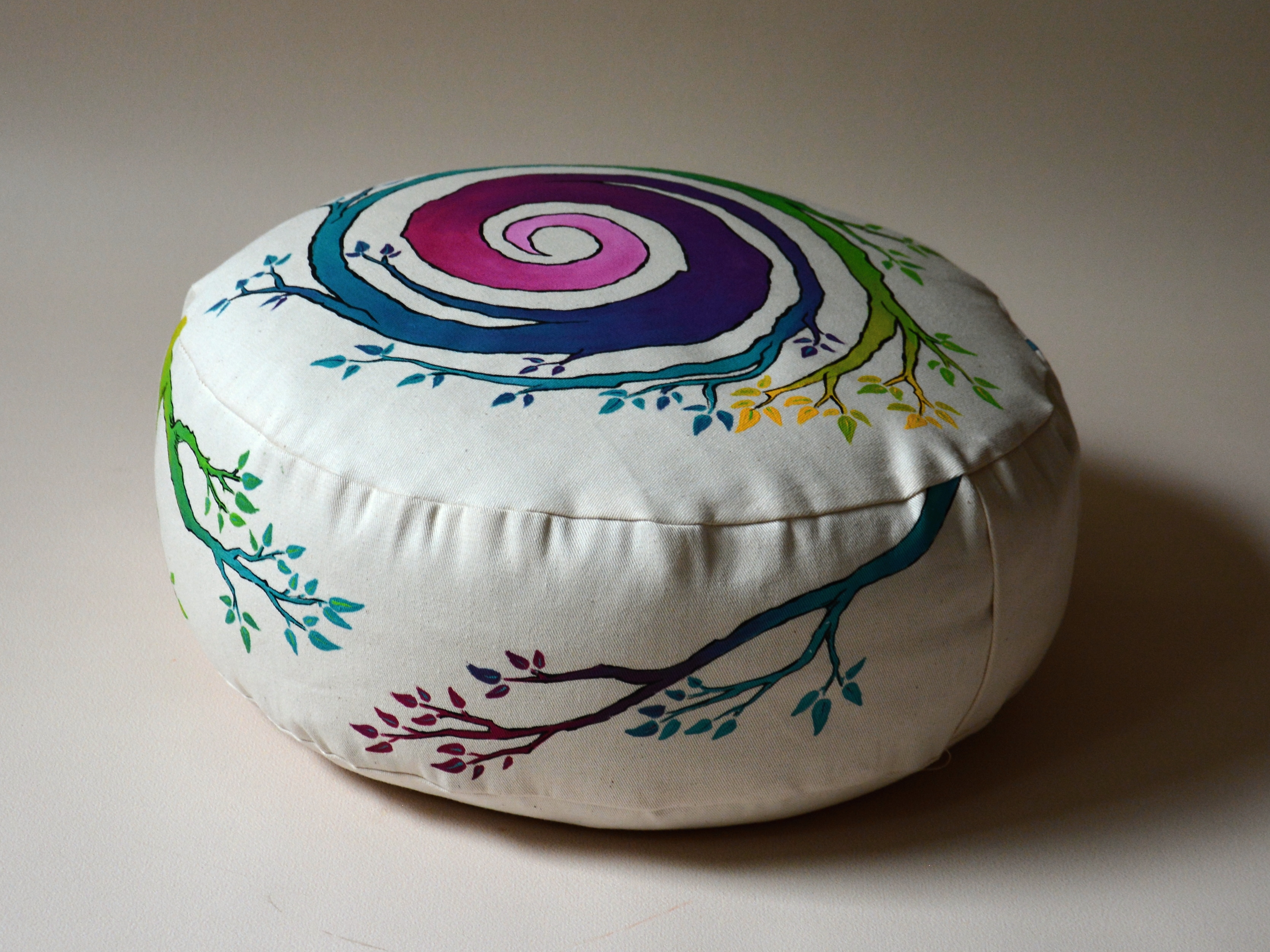 Meditační polštář z organické bavlny v barvě natural, s malbou. Vnější obal je ušitý z pevného bavlněného plátna v keprové vazbě a se zapínáním na zip. Vnitřní obal je z bavlněného plátna, se zapínáním také na zip, aby bylo možné náplň snadno vyměnit. Malba i barvení kvalitními barvami na textil.