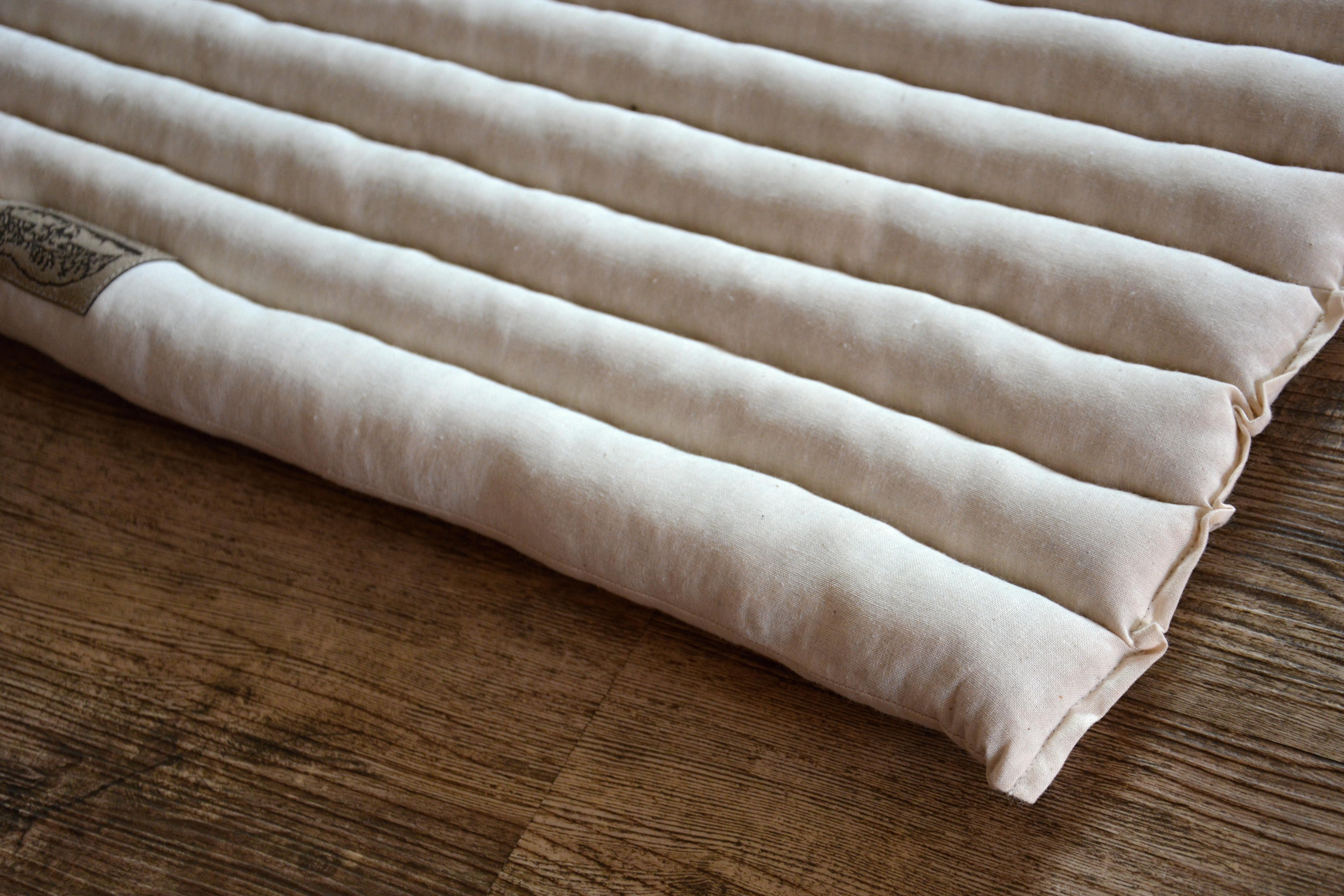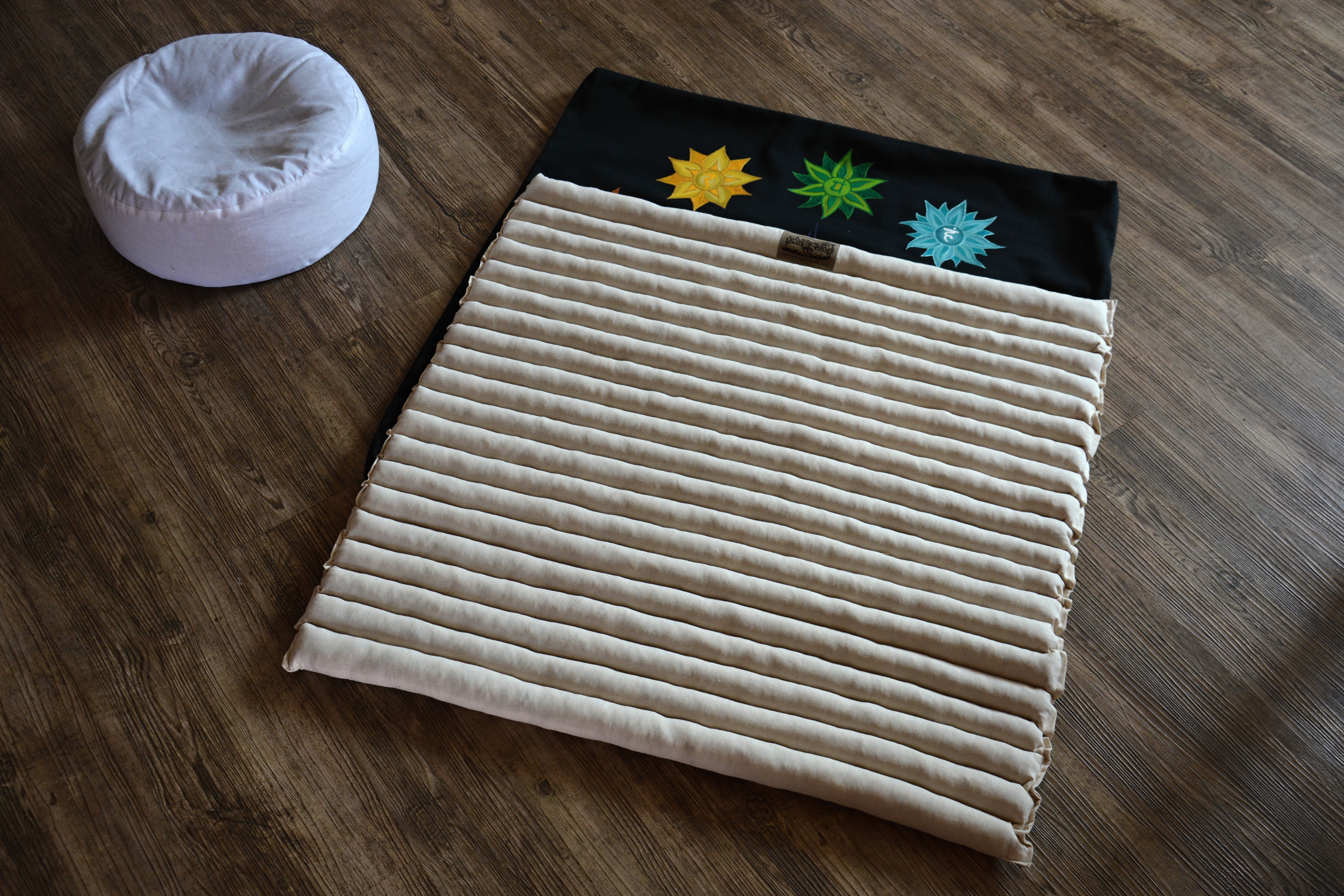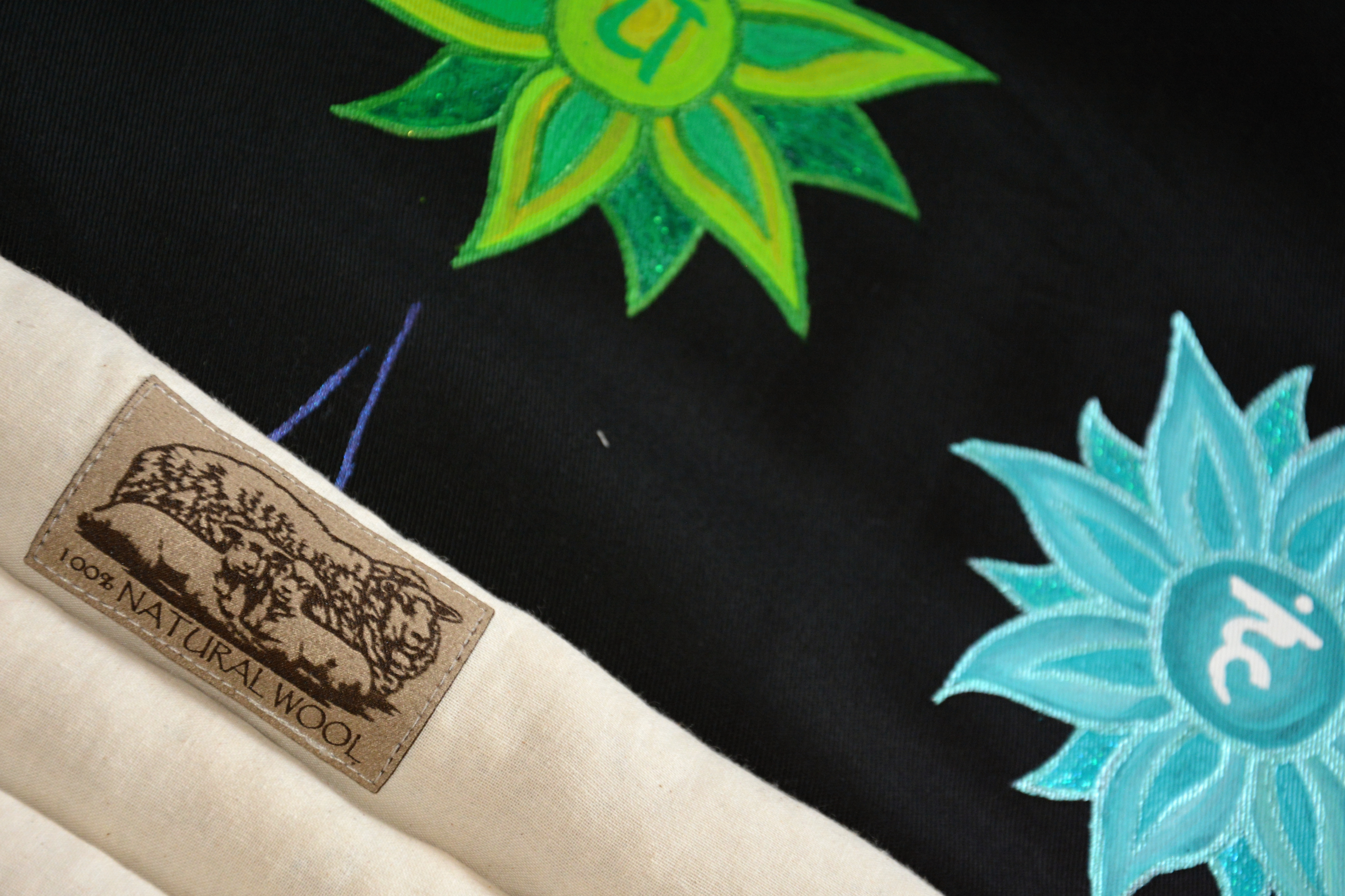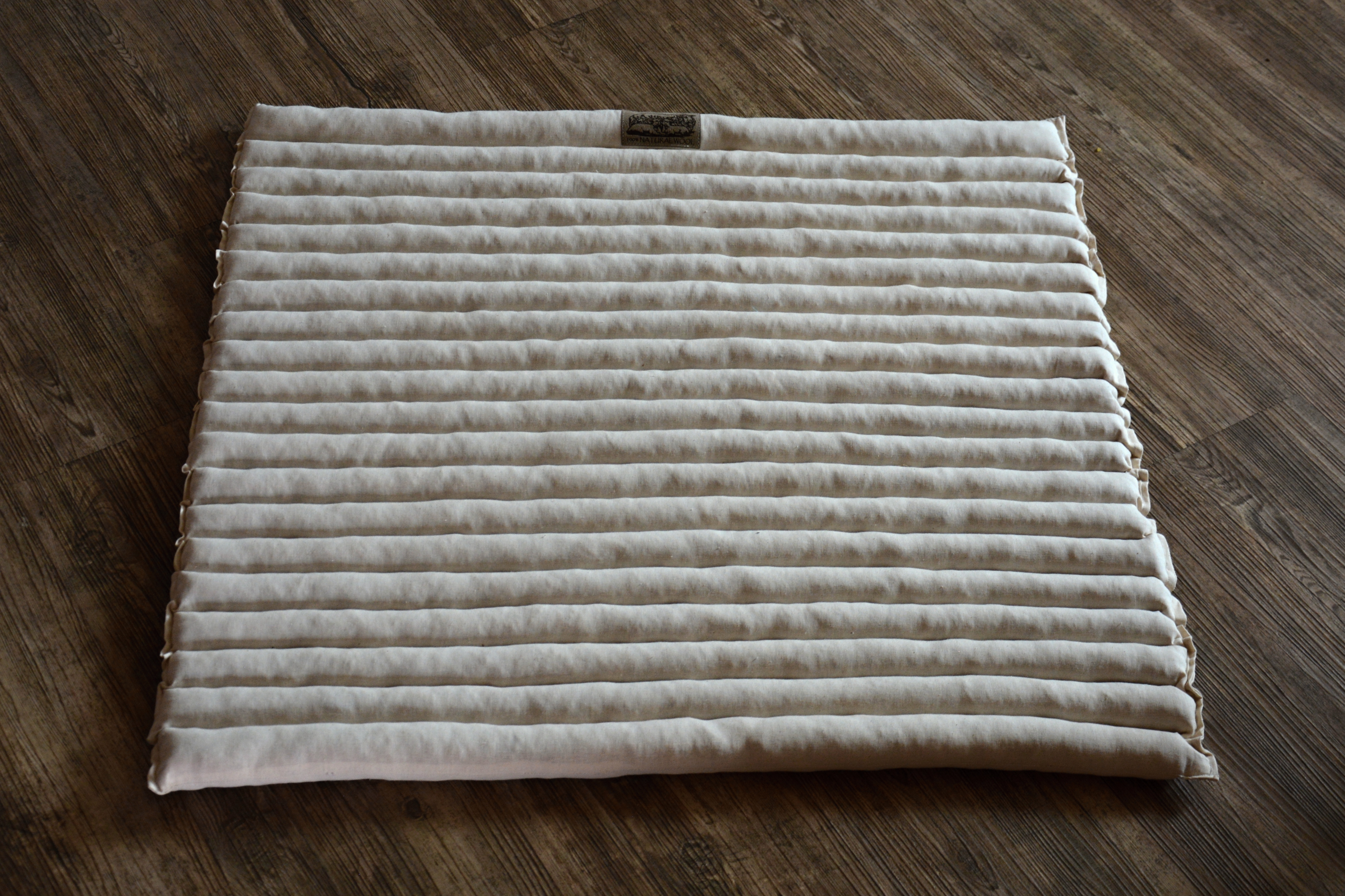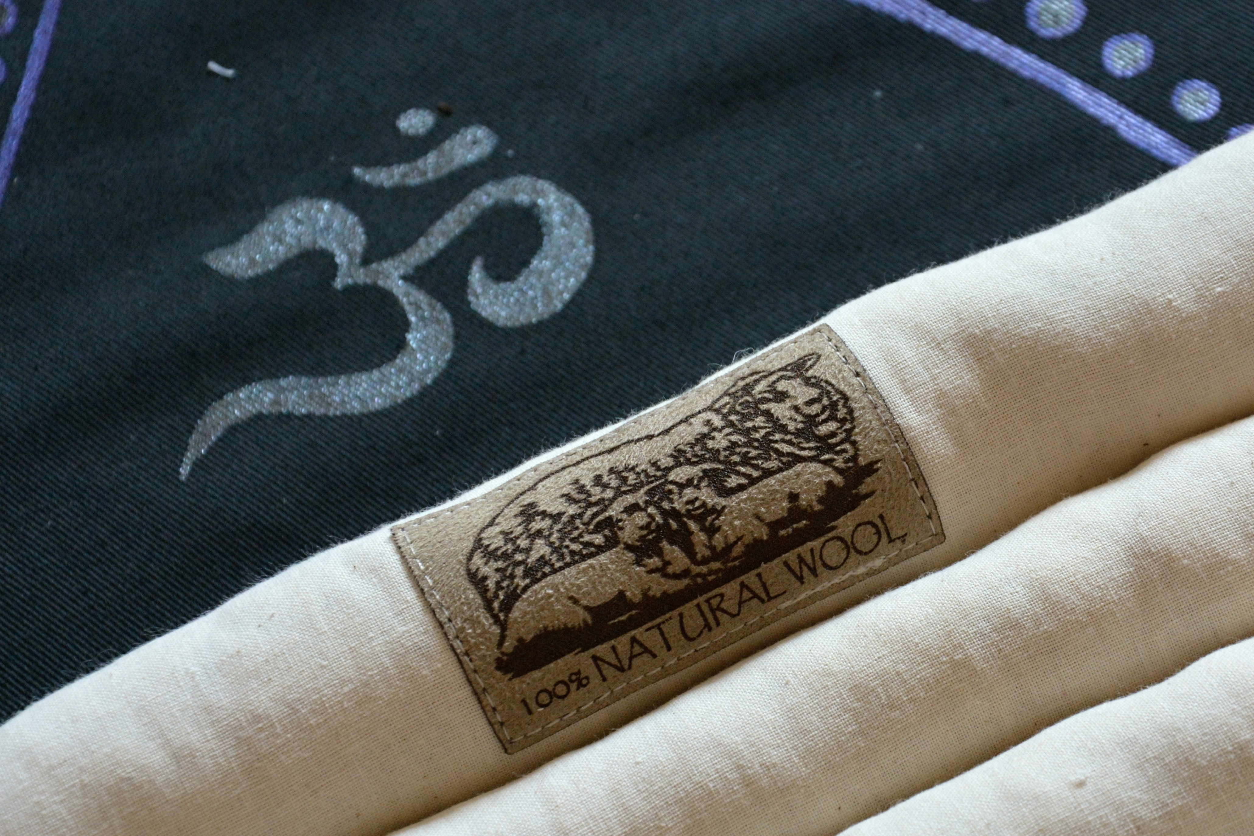 Vnitřek podložky je z čisté vlny. Vlna pochází z oveček z jižních čech a z brdských lesů, z ekologických chovů. Vlnu následně ručně zpracovávám, třídím a důkladně peru bez použití chemie a suším poctivě na sluníčku. Podložku vycpávám vlnou důkladně, je proto hodně pevná a spíše tvrdší. Nicméně oproti podložce z pohankových slupech je to takové "nebe pod zadkem". Vlněná podložka je extrémně příjemná a perfektně izoluje. Použitá látka je režná organická bavlna. Vnitřek podložky je plně recyklovatelný a v kategorii non toxic. Lze prát pouze ručně.