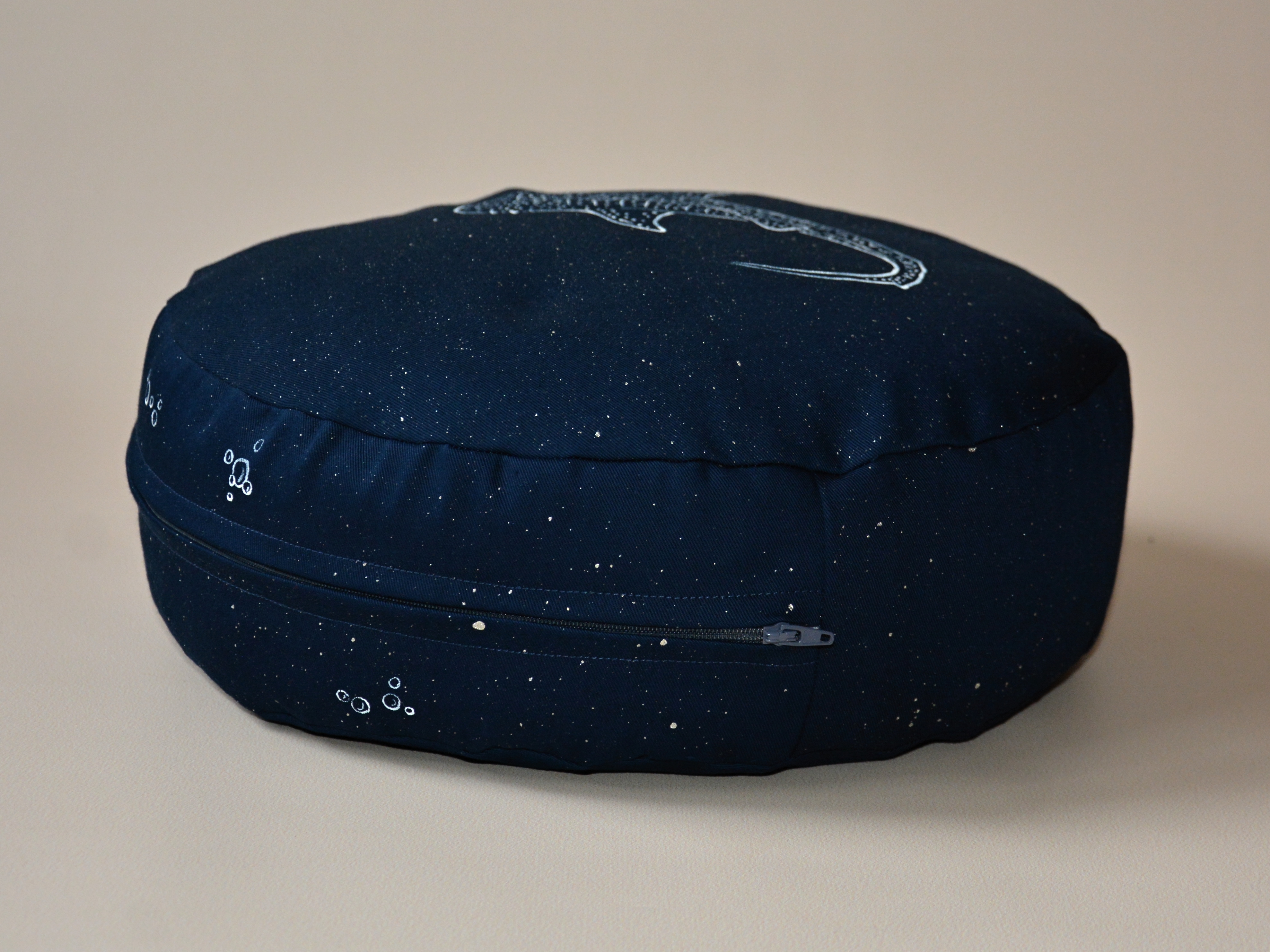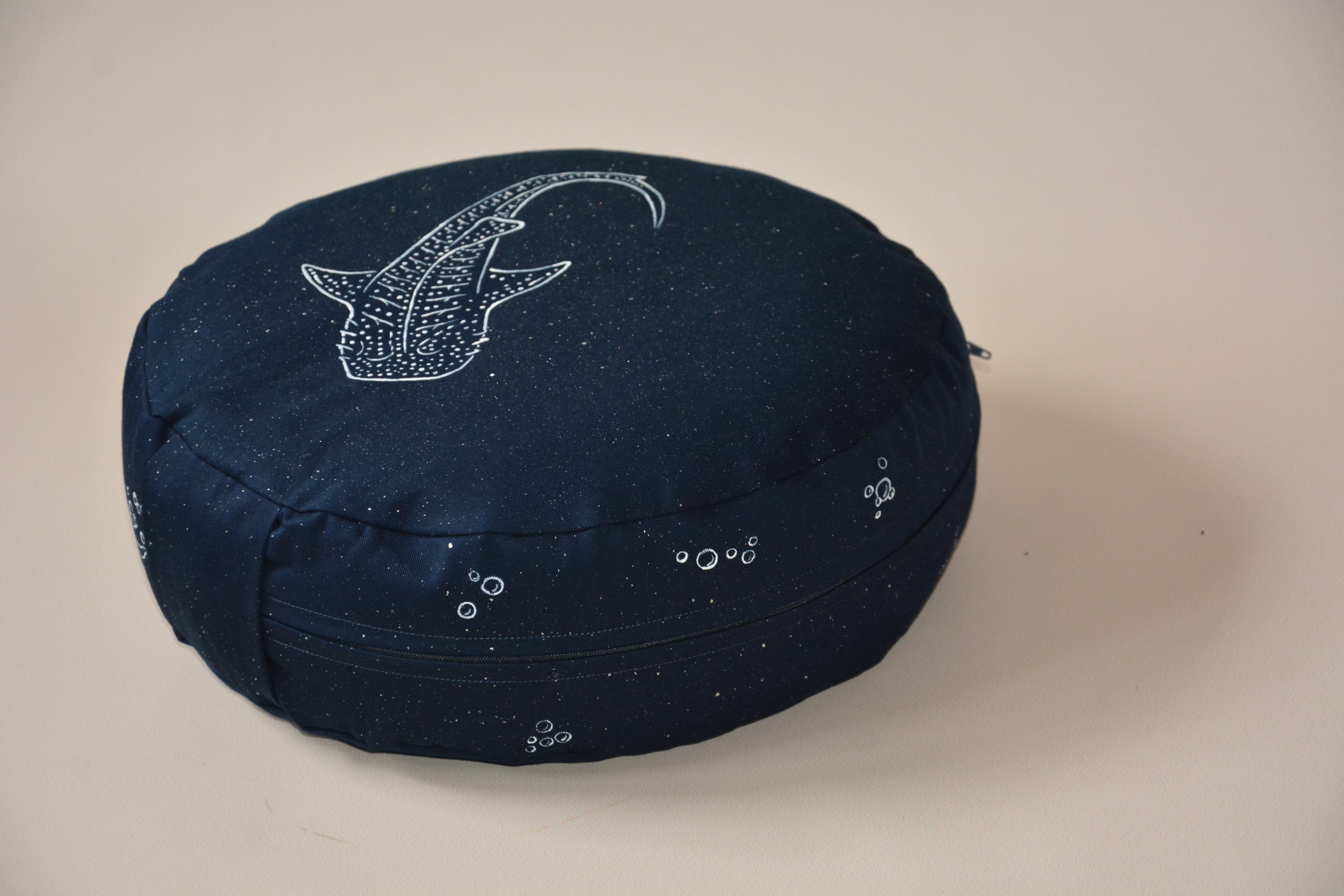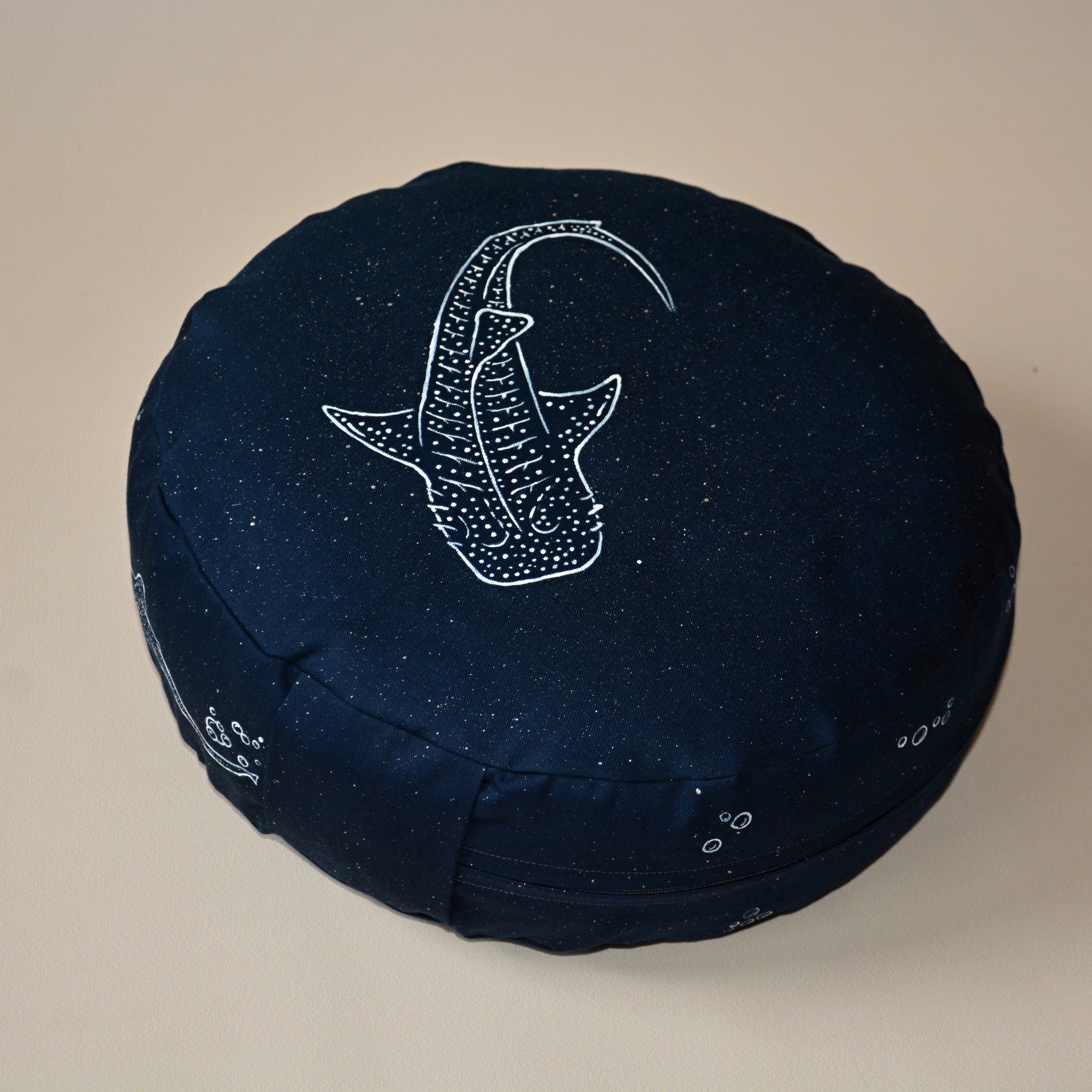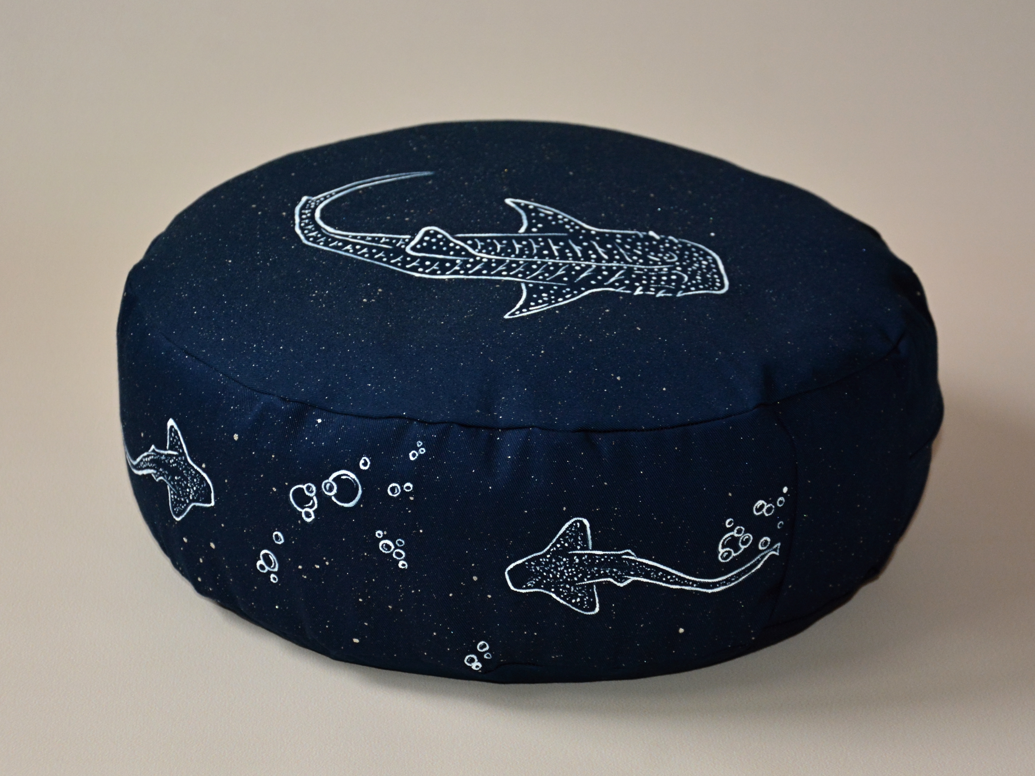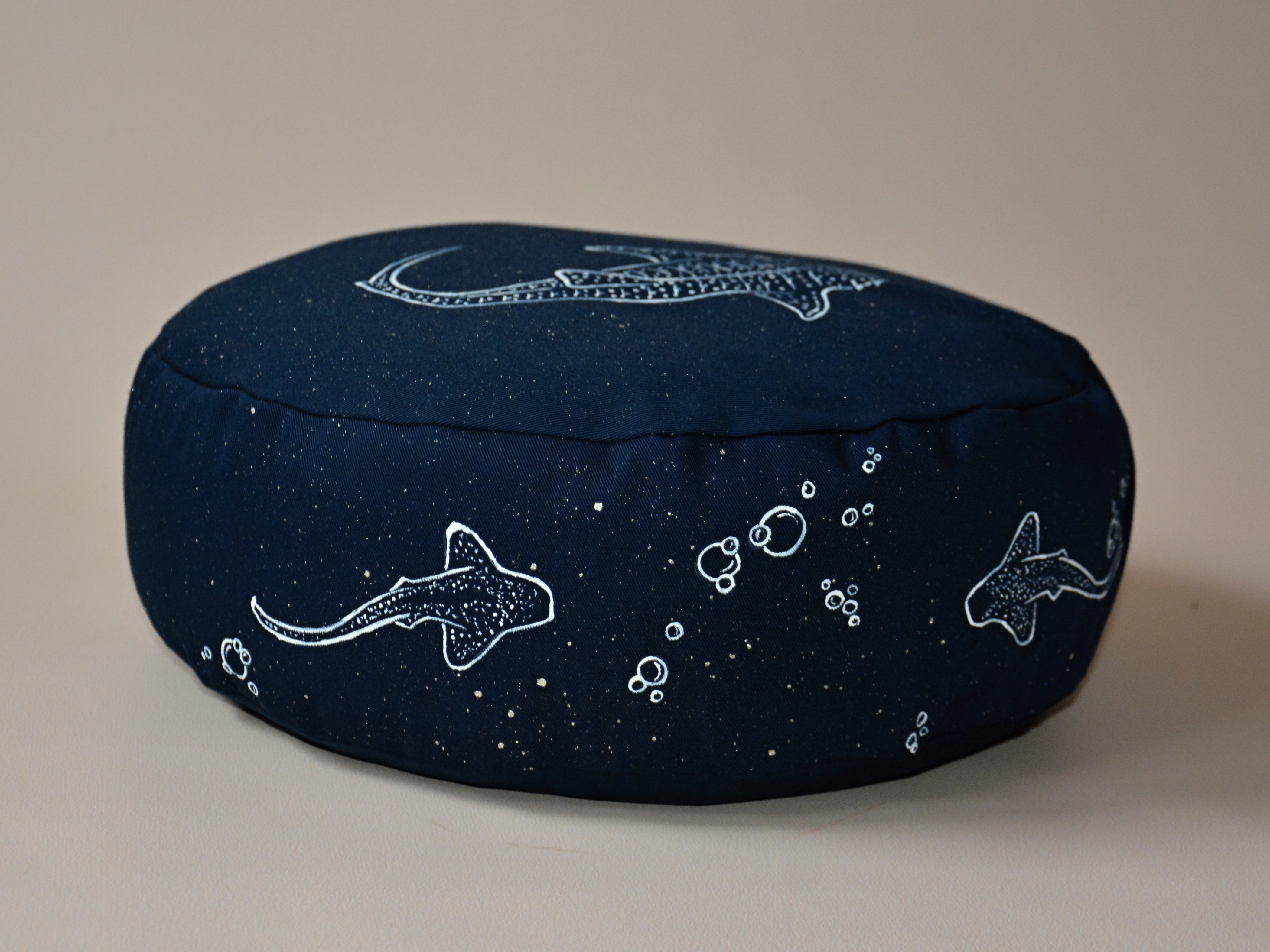 Meditační polštář v tmavě modré barvě s malbou. Žralok a detaily jsou bílé, hvězdy a třpyt platinové - krásně jemně se třpytí, jen to neumím zachytit na fotografii:)