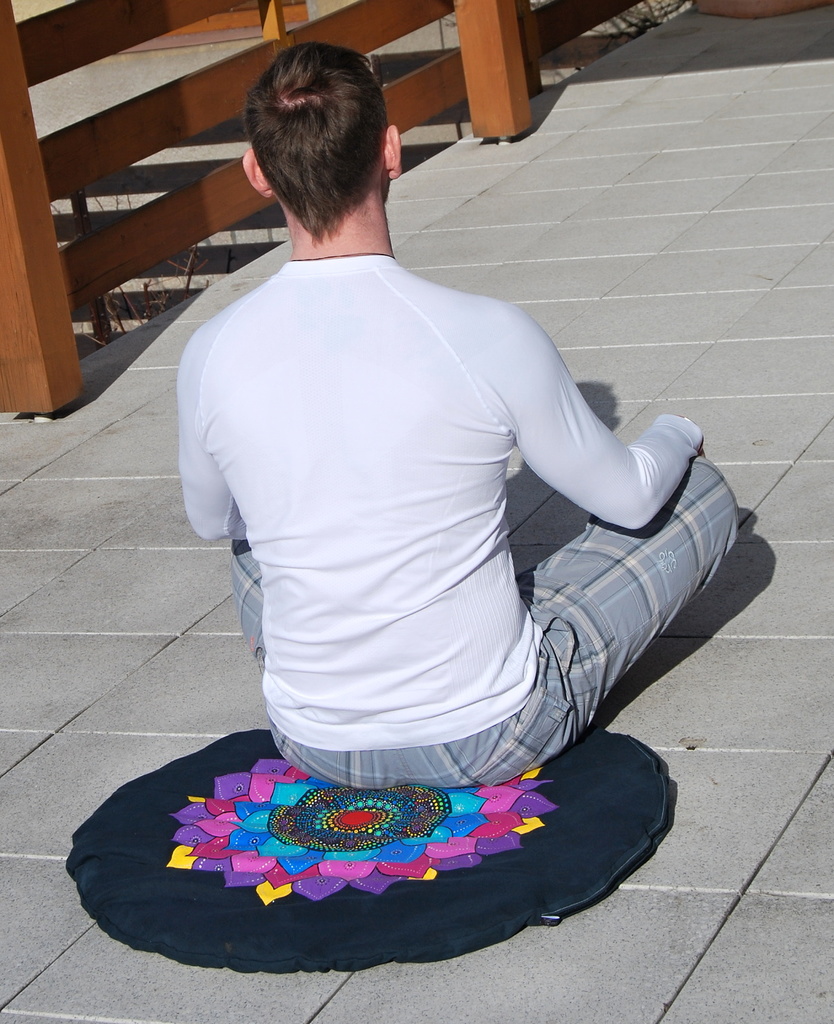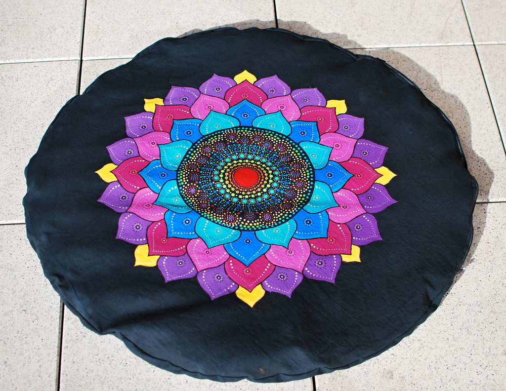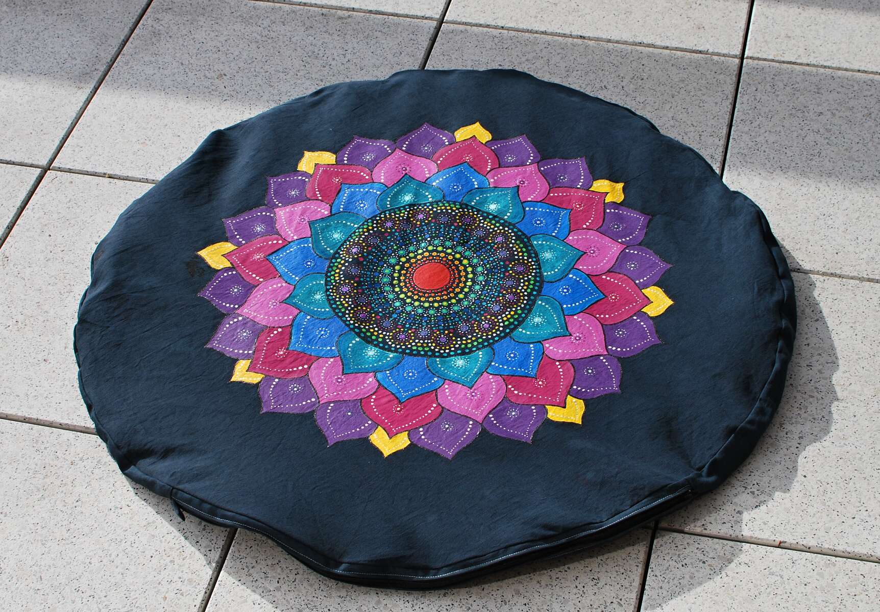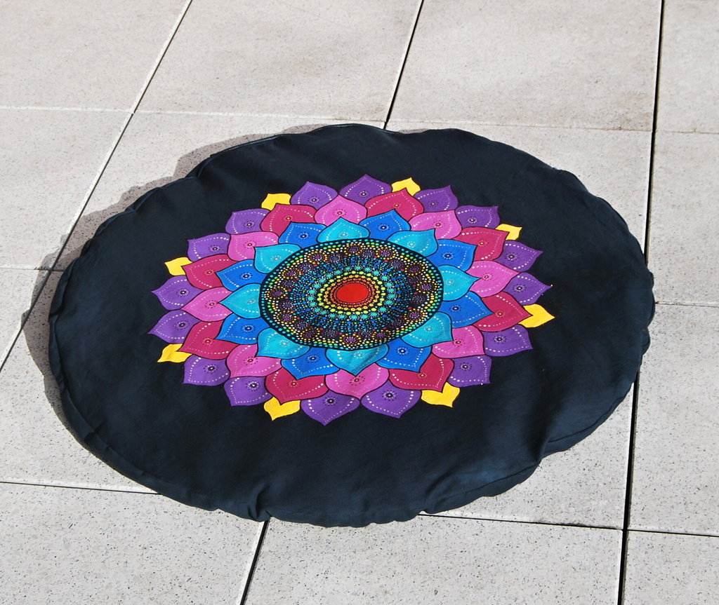 Kruhová meditační podložka v černém provedení s malbou mandaly.